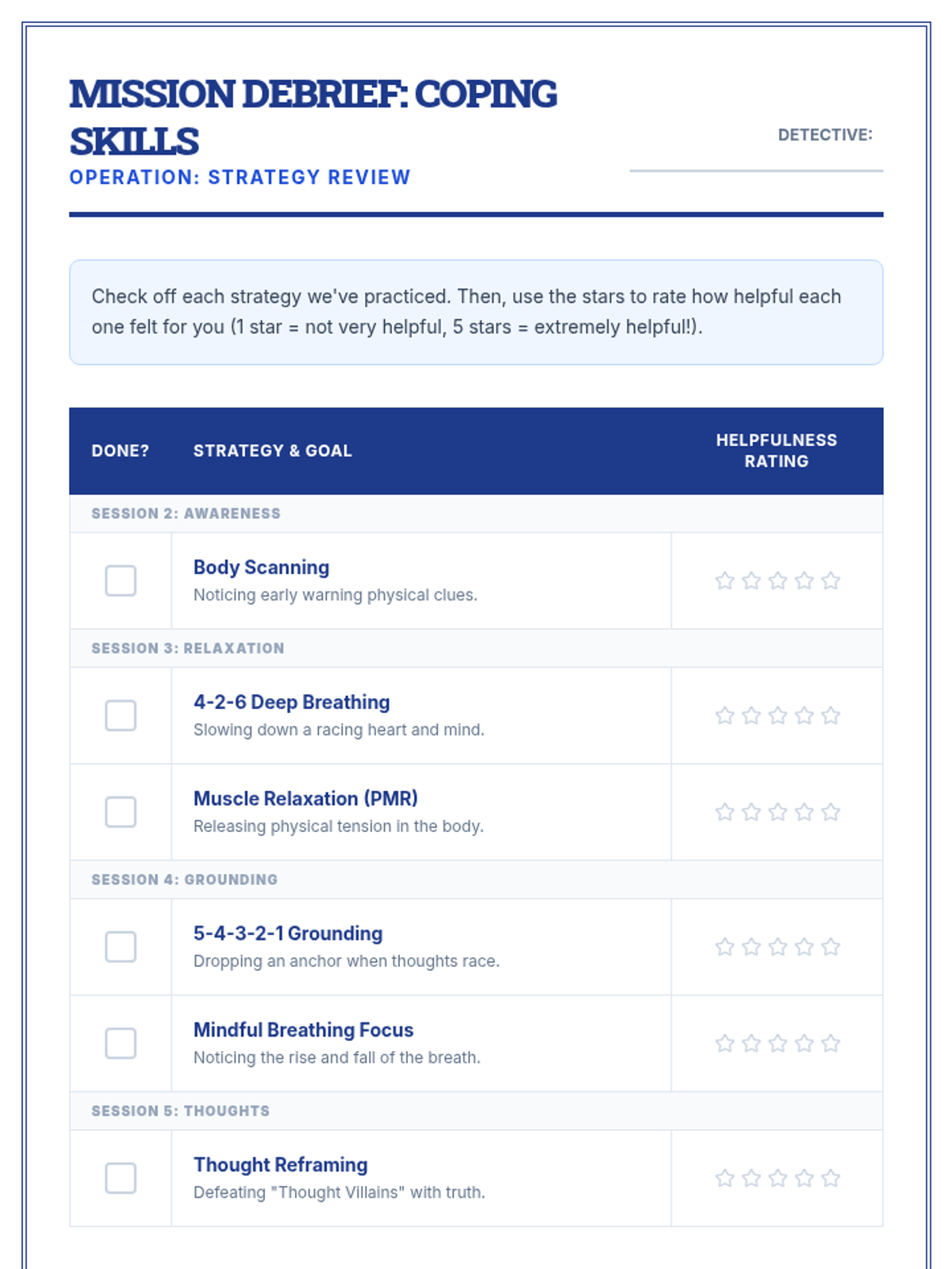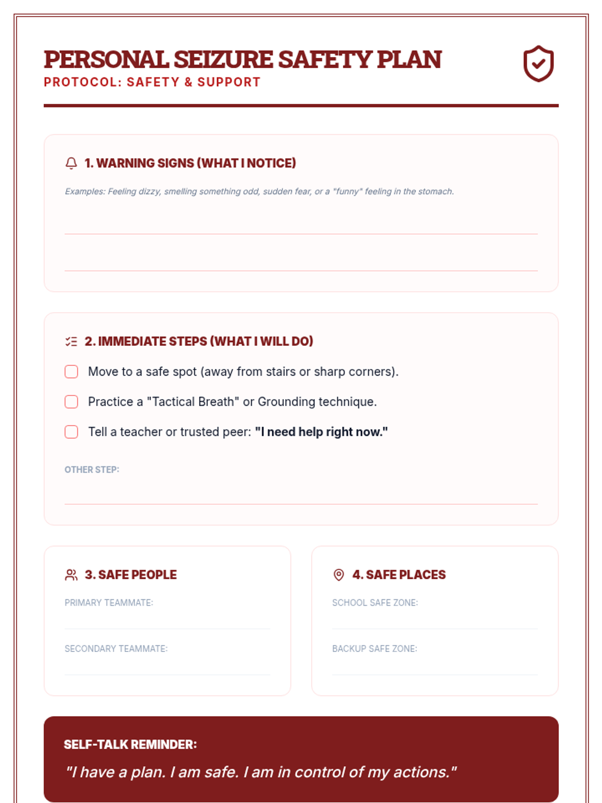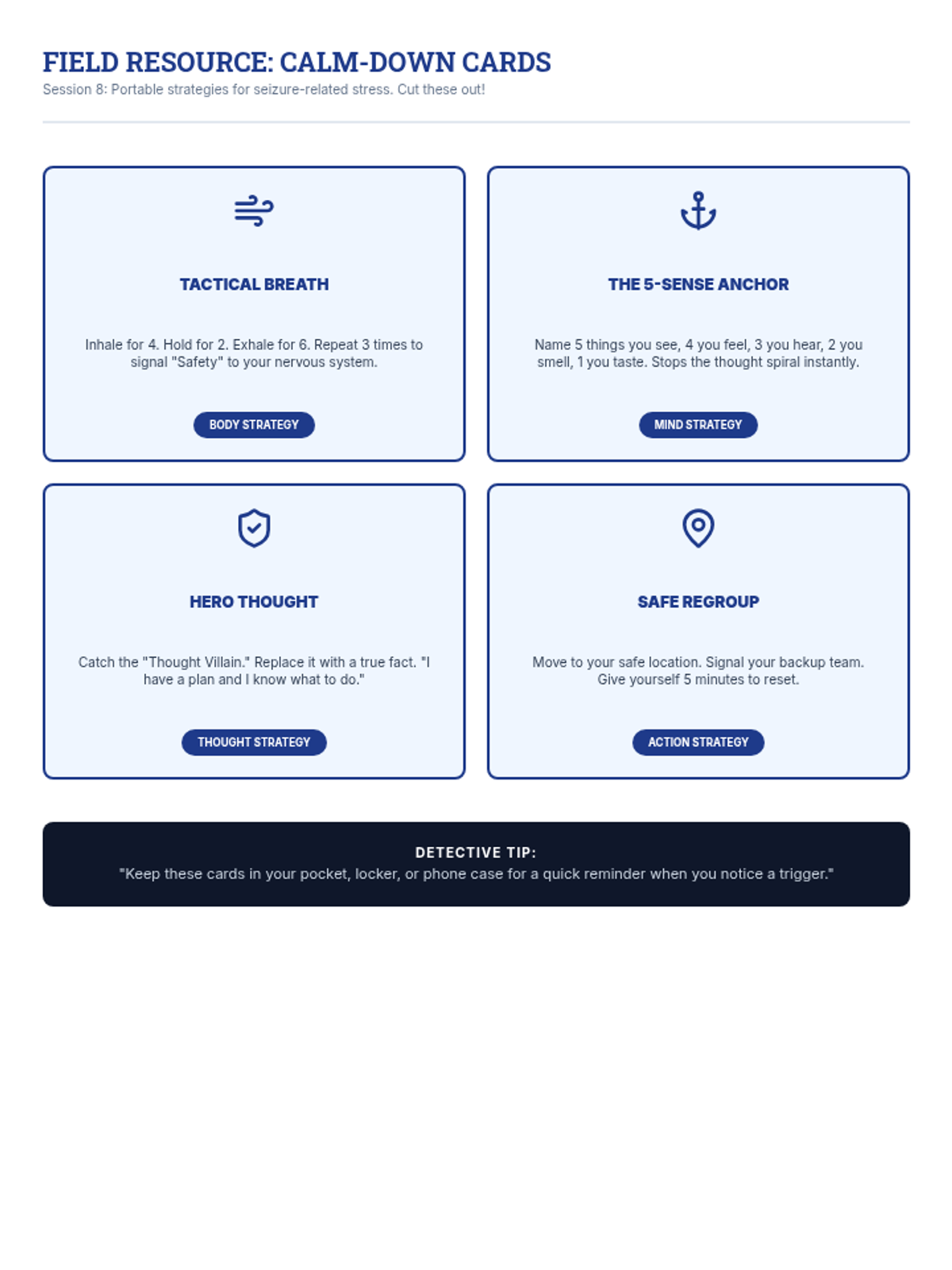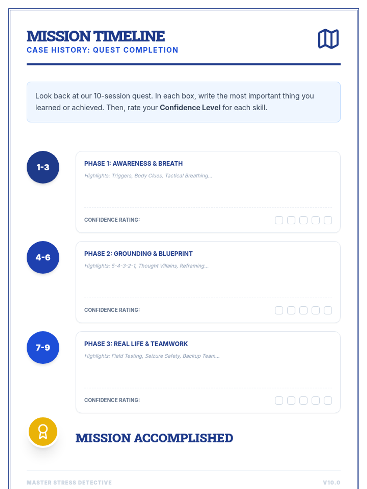 A 10-session Tier 3 support program for 7th-grade students with seizure histories, focusing on identifying stressors, physical cues, and evidence-based coping mechanisms through a 'Detective Quest' theme.