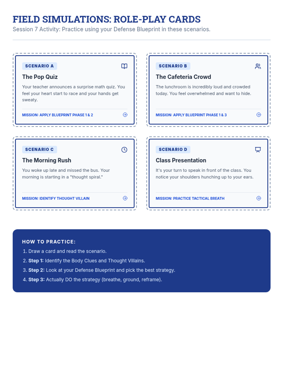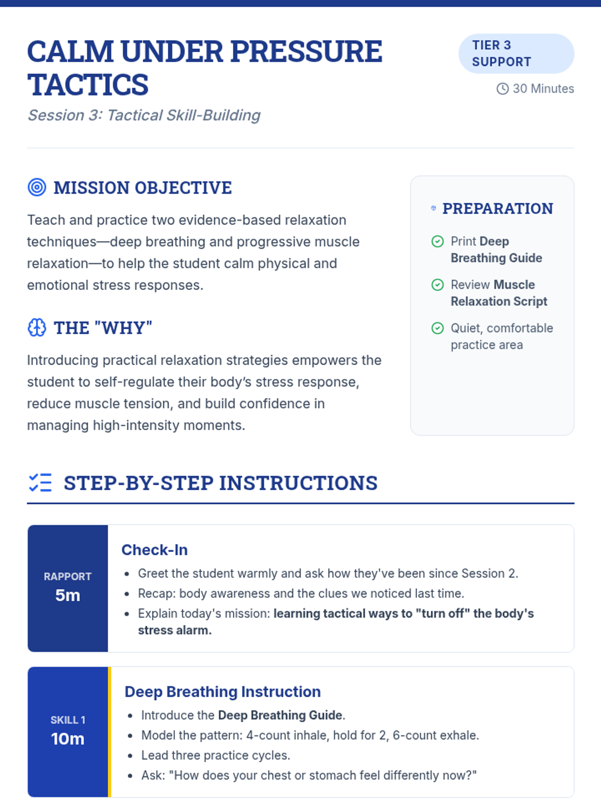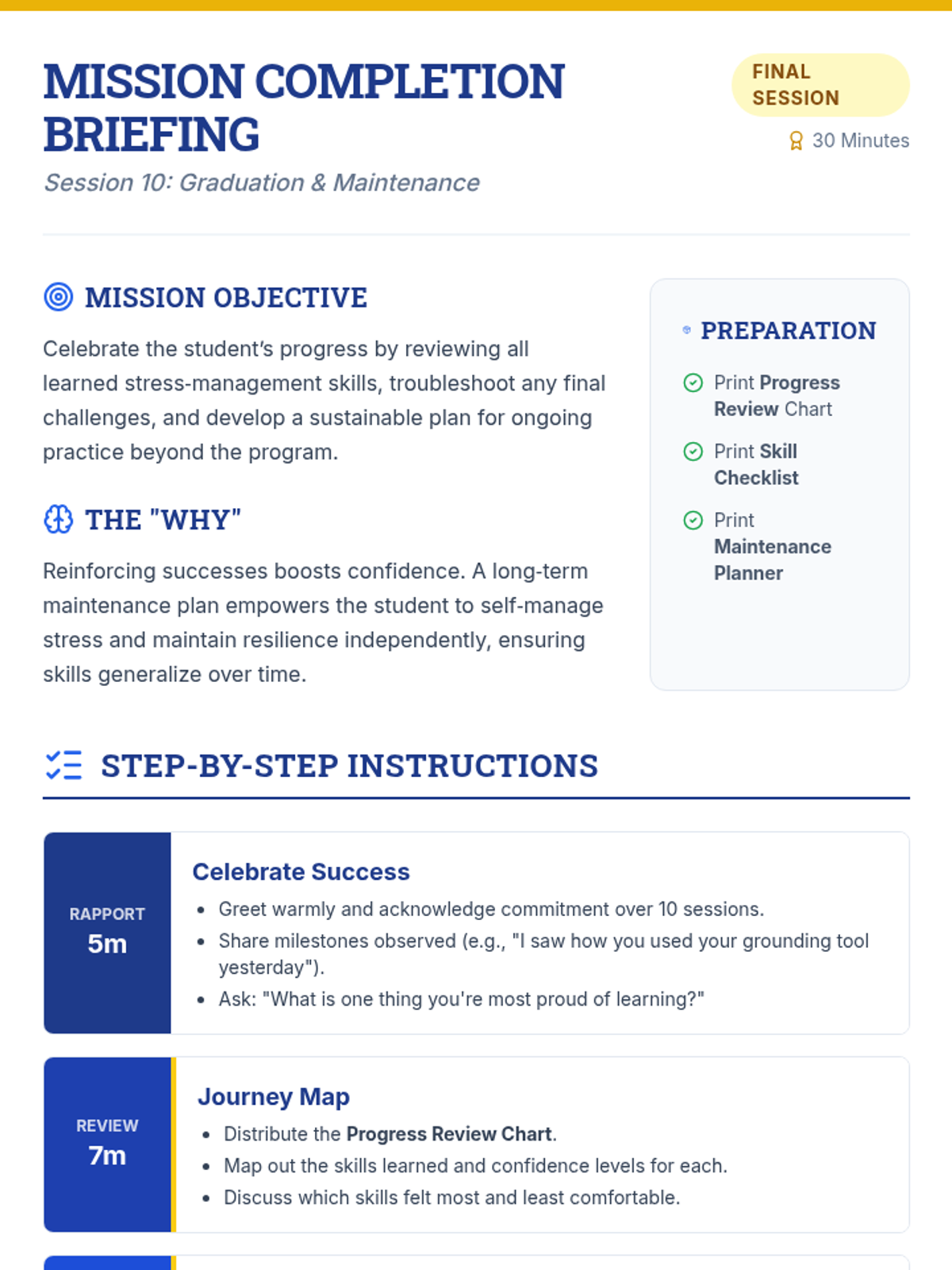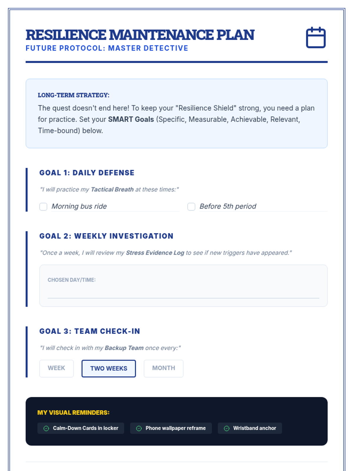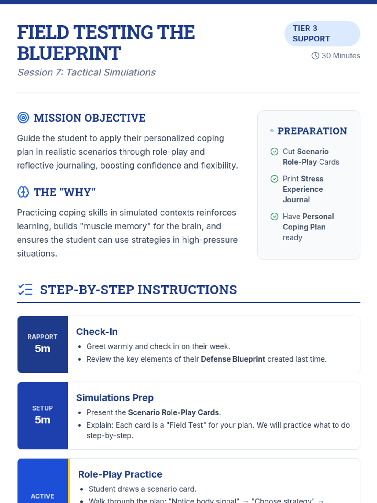 A 10-session Tier 3 support program for 7th-grade students with seizure histories, focusing on identifying stressors, physical cues, and evidence-based coping mechanisms through a 'Detective Quest' theme.