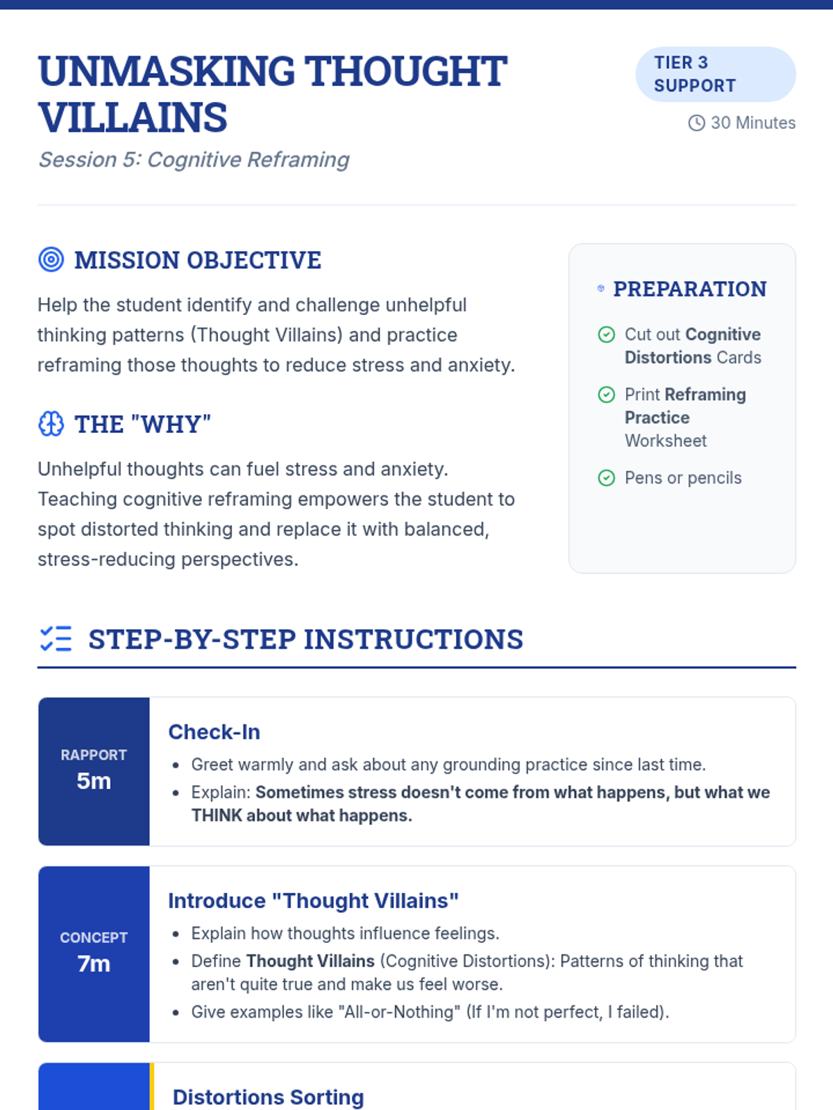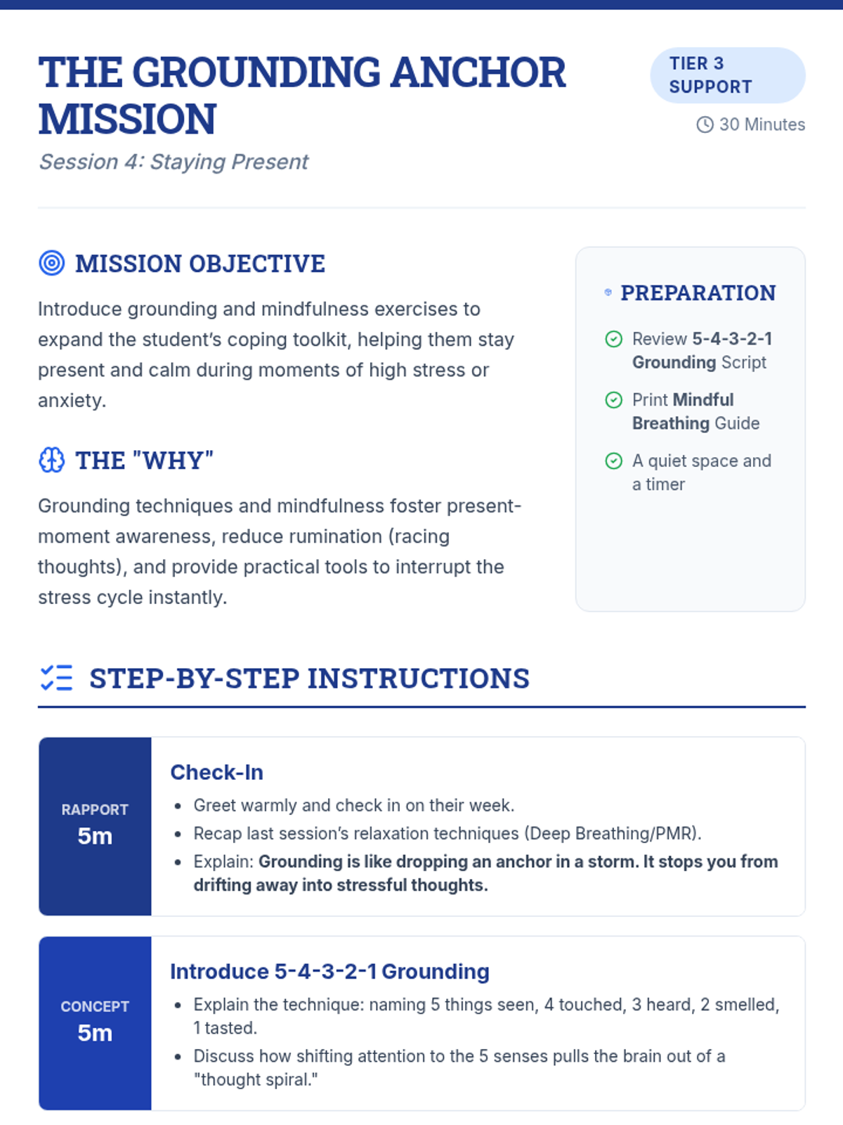 A 6-week executive functioning curriculum for 9th-grade boys designed for 25-minute small group sessions. Focuses on grade monitoring, task prioritization, and teacher communication to build independence.