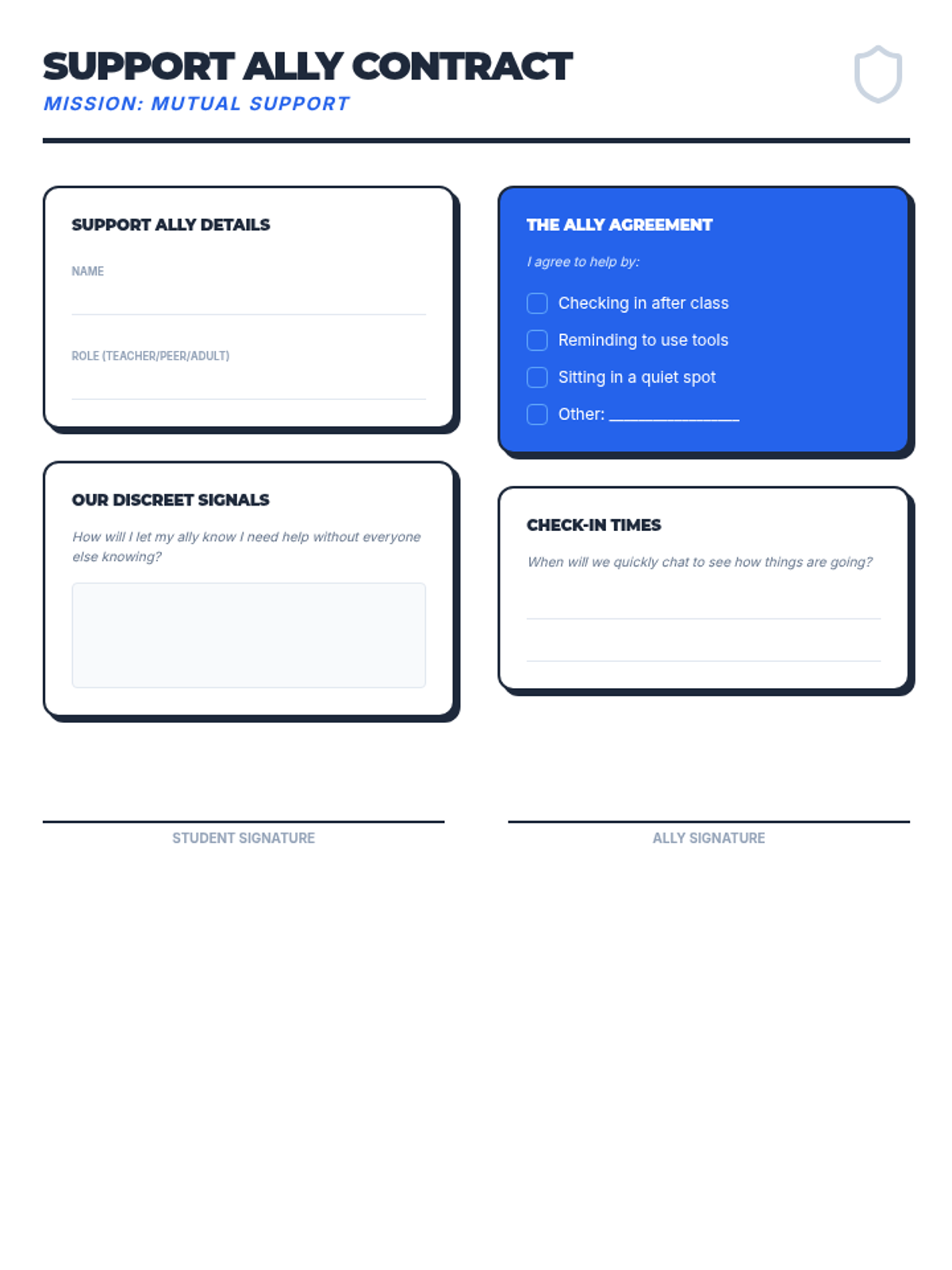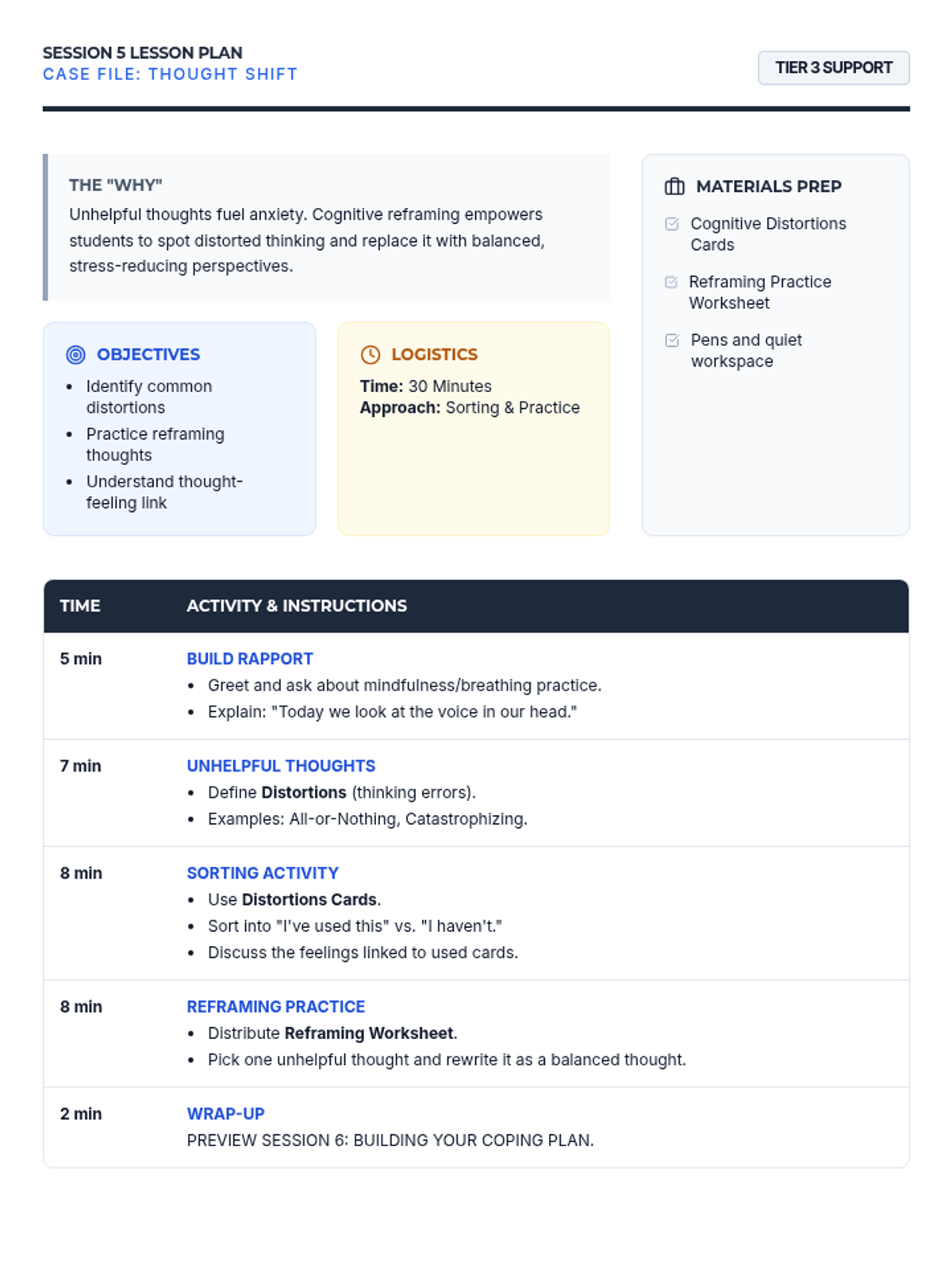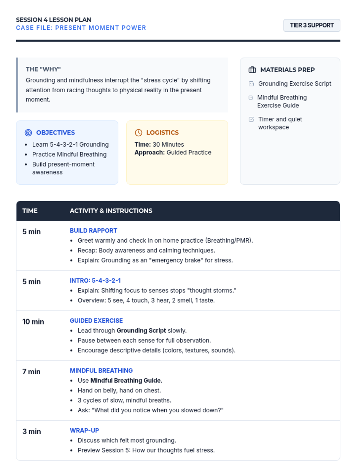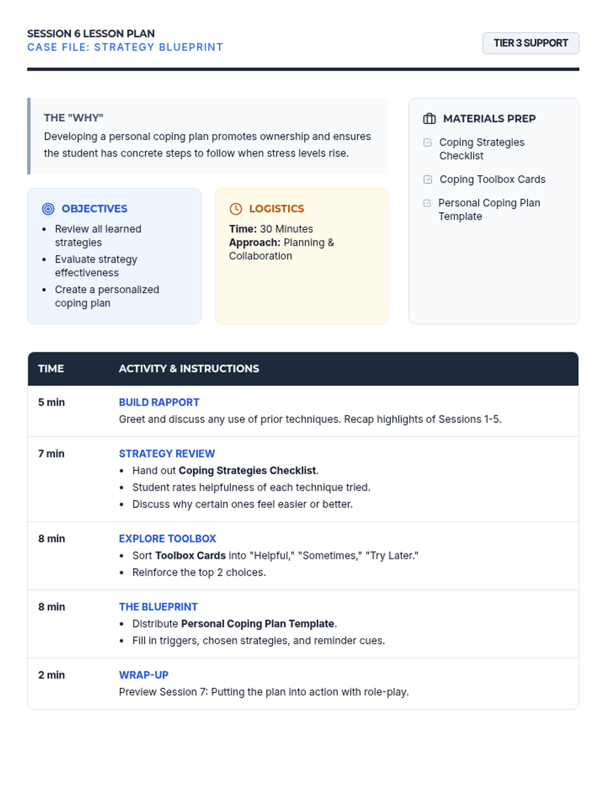 A 6-week executive functioning curriculum for 9th-grade boys designed for 25-minute small group sessions. Focuses on grade monitoring, task prioritization, and teacher communication to build independence.