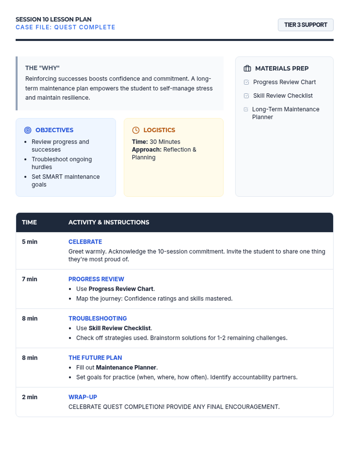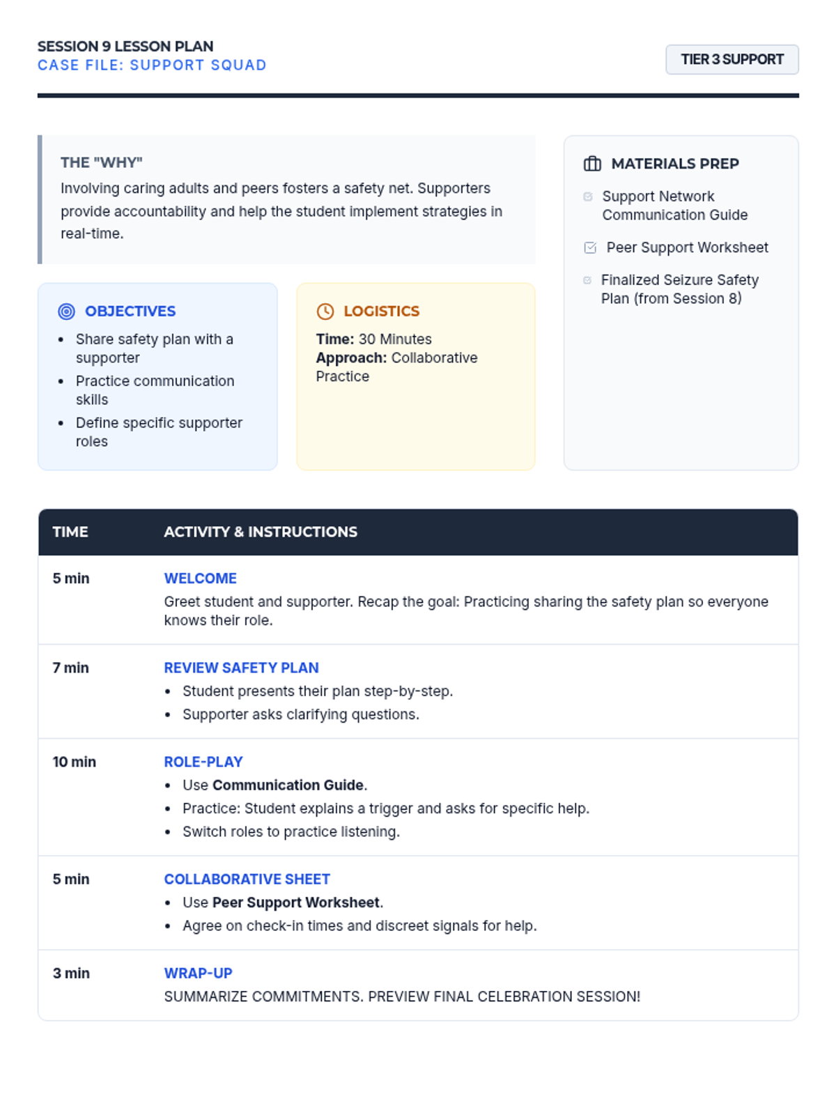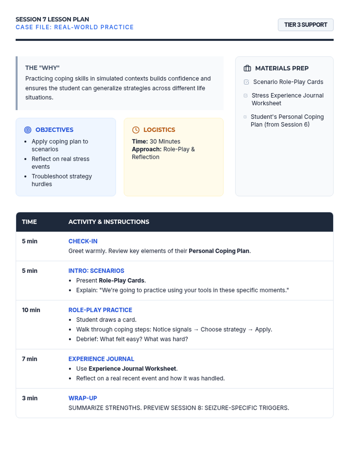 A 10-session Tier 3 intervention for a 7th-grade student with a seizure history, focusing on identifying stressors, physical cues, and building evidence-based coping resilience.