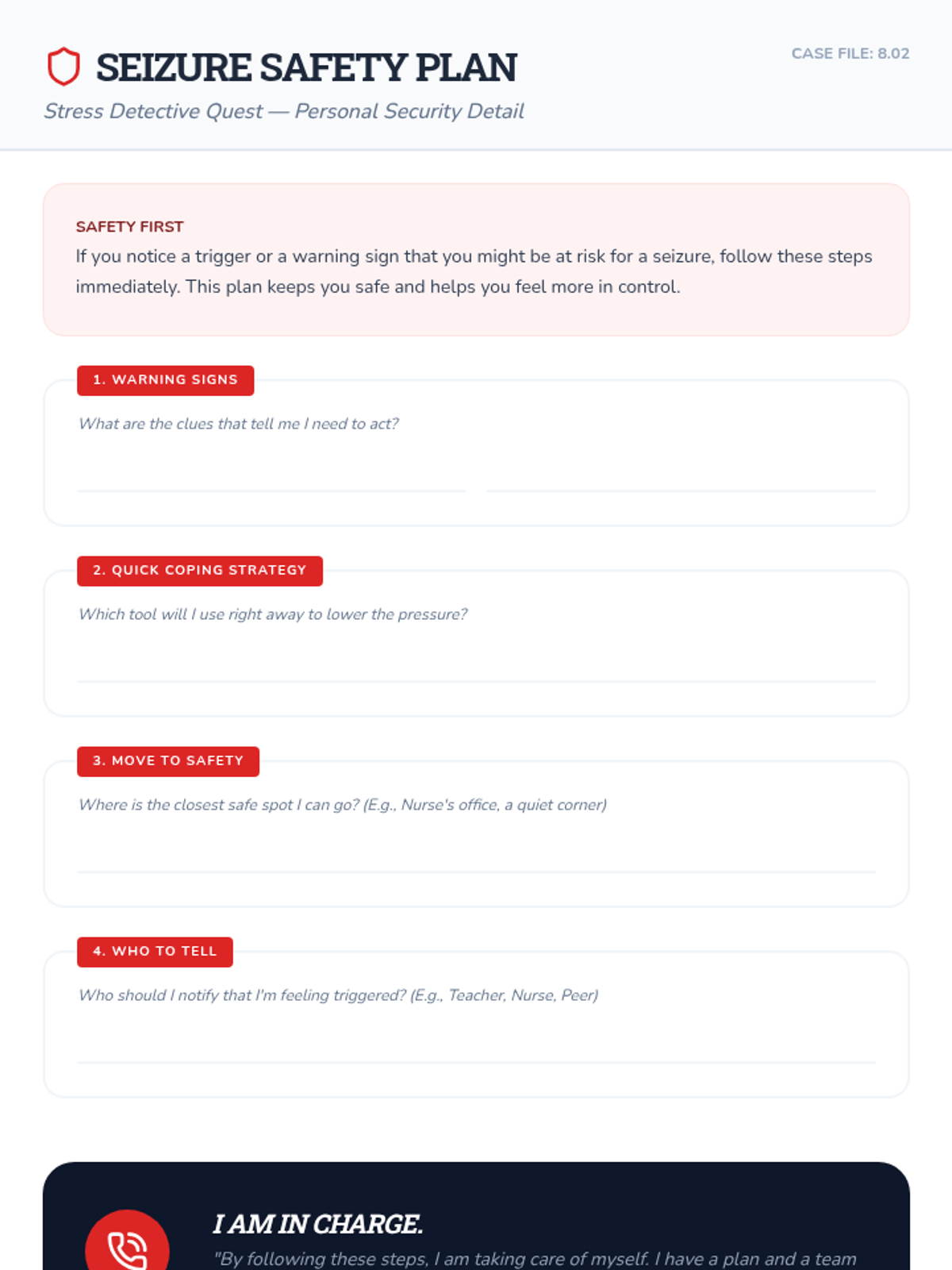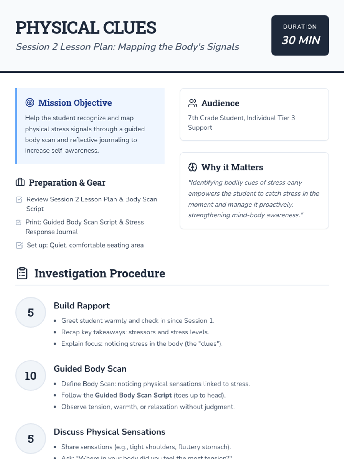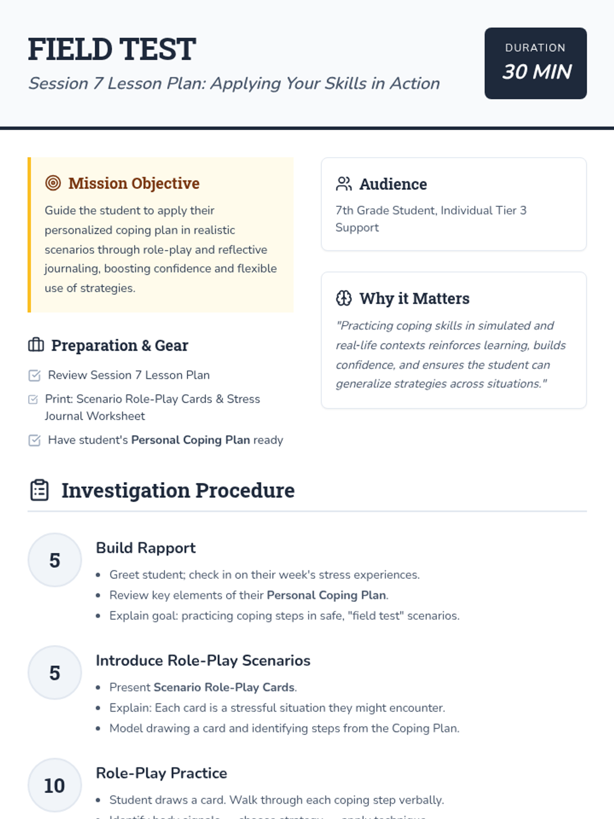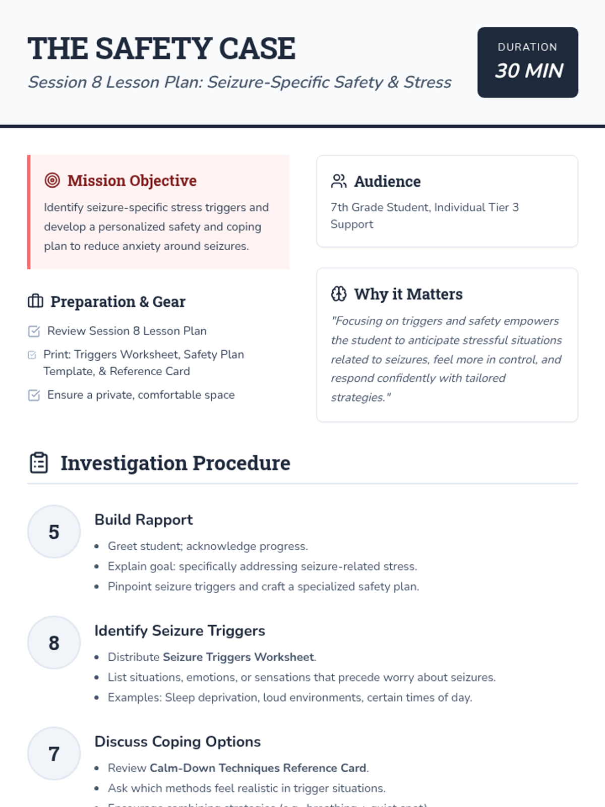 A 10-session, 30-minute individual Tier 3 support program for a 7th grader with a seizure history. Students will learn to identify personal stressors, understand emotional and physical reactions, and practice evidence-based coping strategies to build resilience and reduce stress.