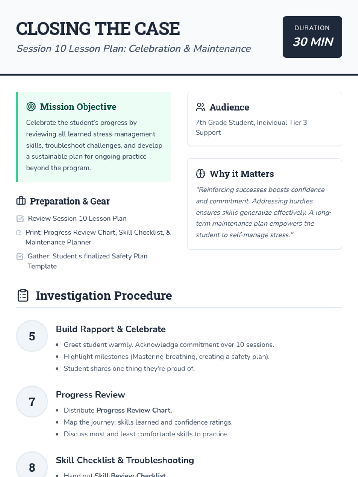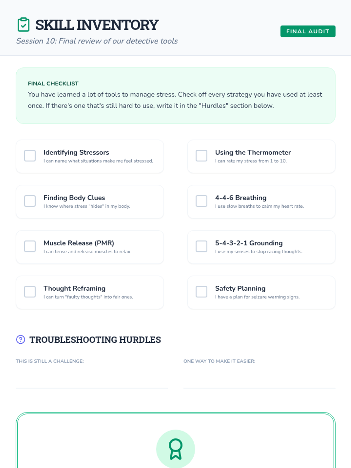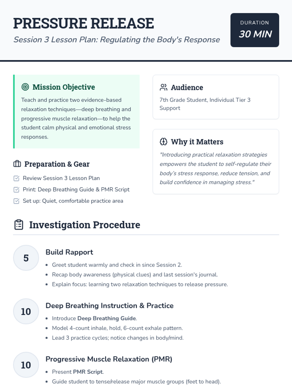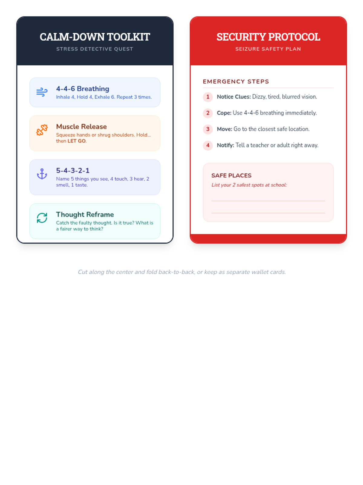 A 10-session, 30-minute individual Tier 3 support program for a 7th grader with a seizure history. Students will learn to identify personal stressors, understand emotional and physical reactions, and practice evidence-based coping strategies to build resilience and reduce stress.