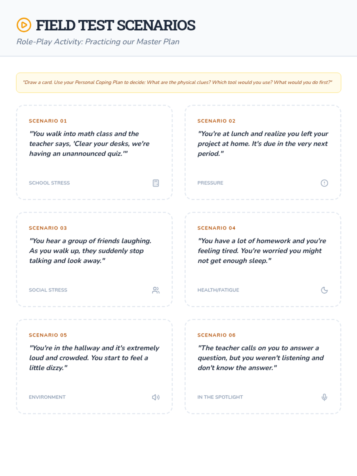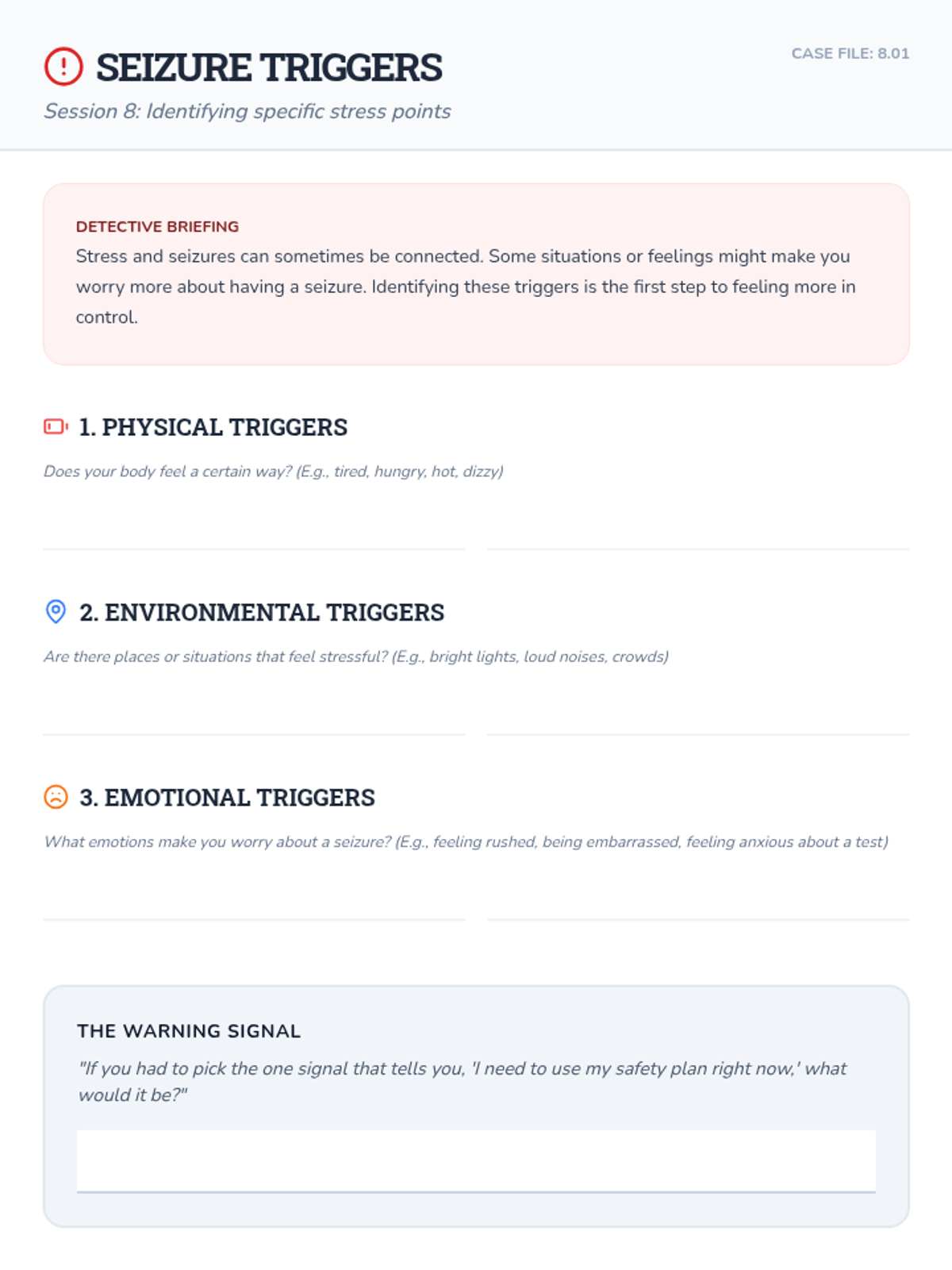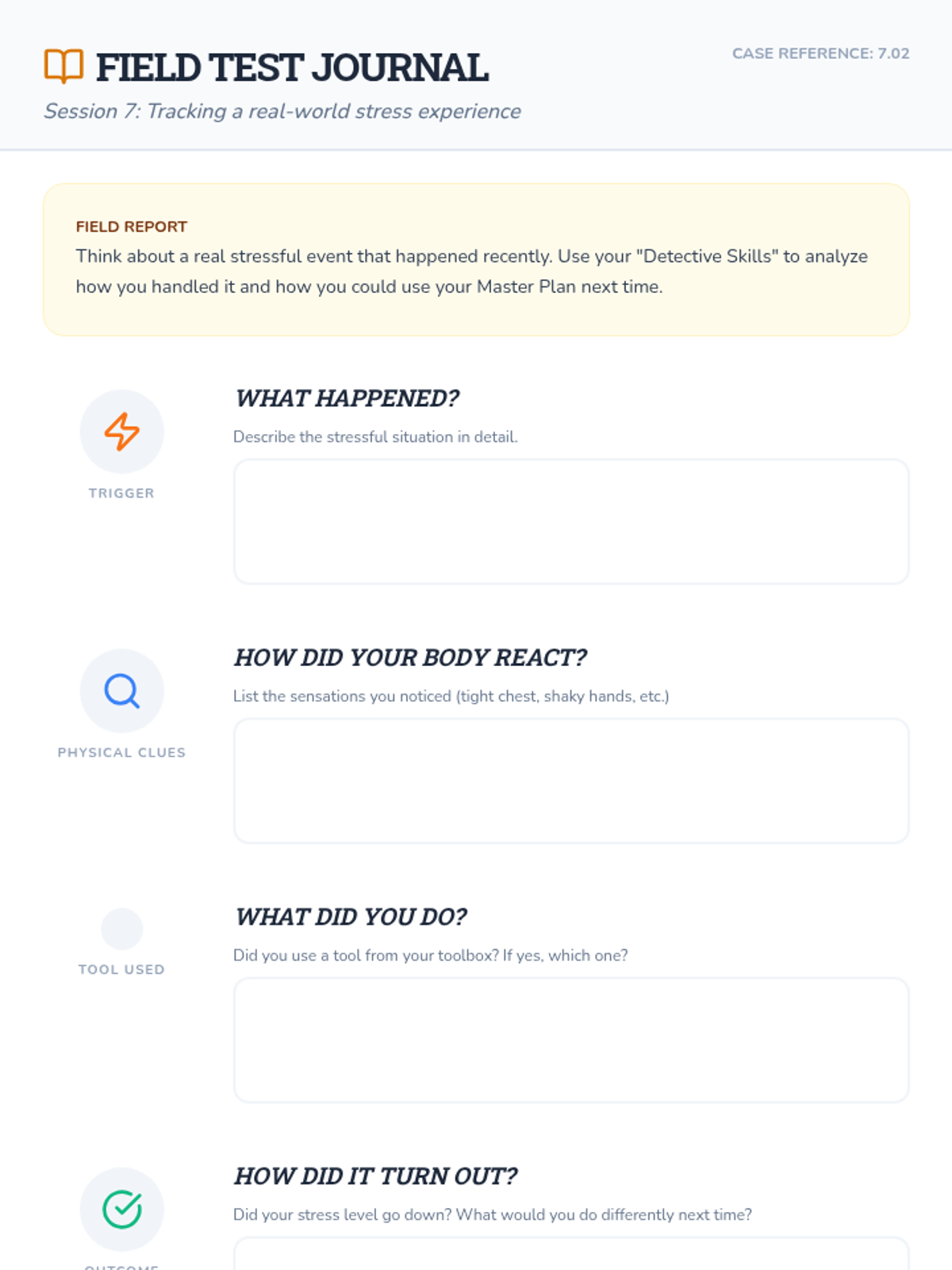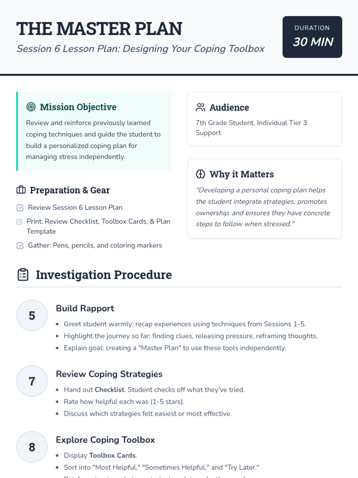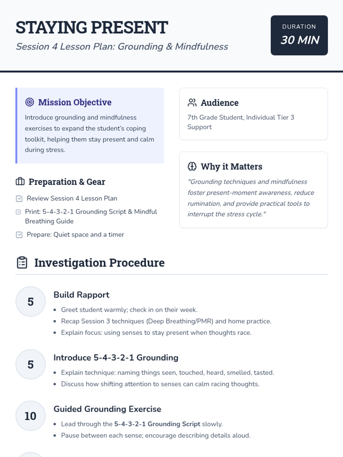 A 10-session, 30-minute individual Tier 3 support program for a 7th grader with a seizure history. Students will learn to identify personal stressors, understand emotional and physical reactions, and practice evidence-based coping strategies to build resilience and reduce stress.