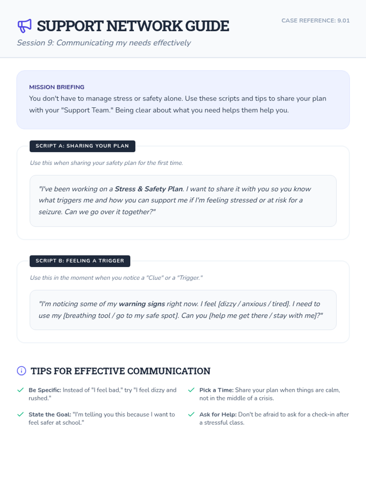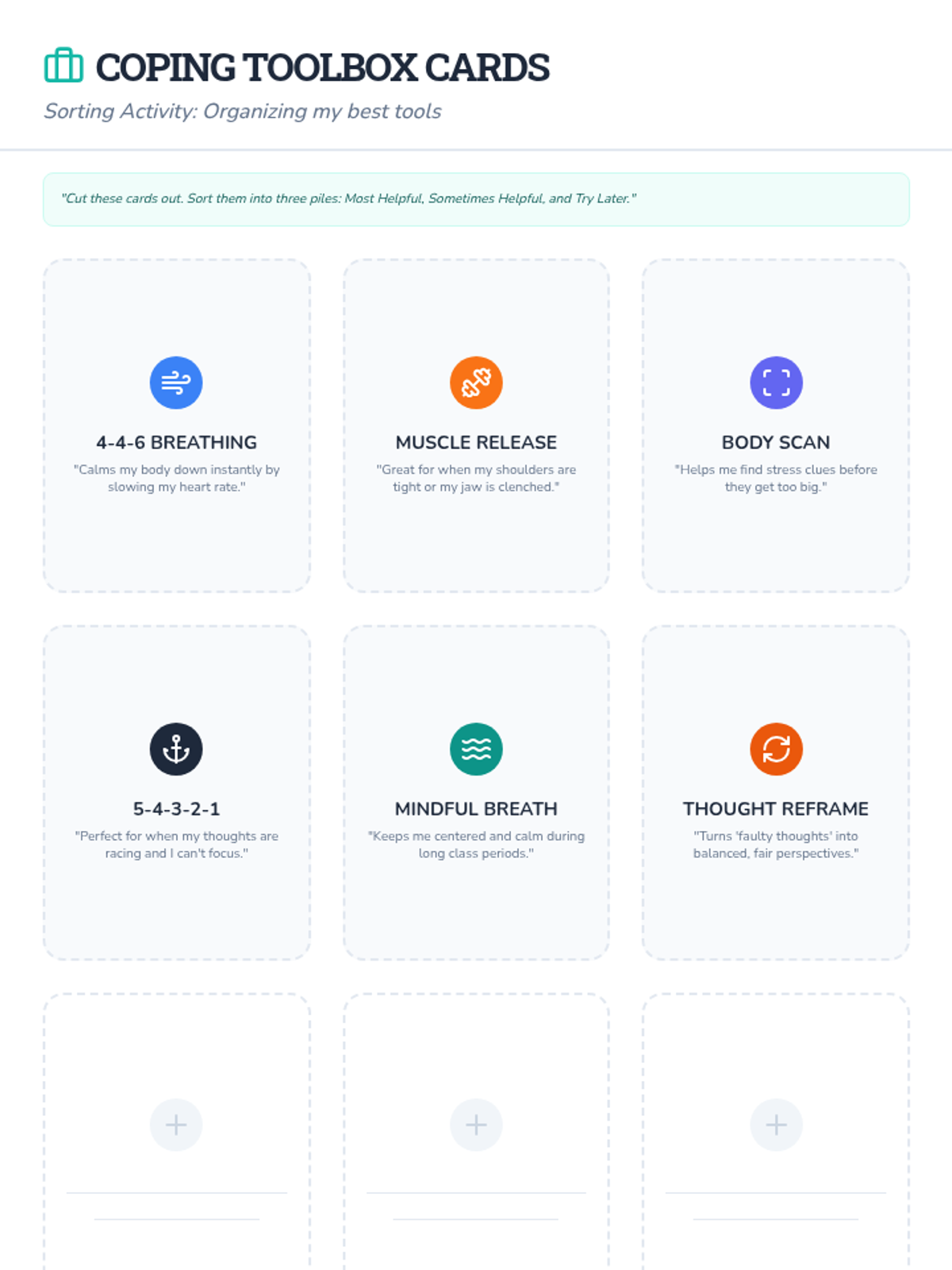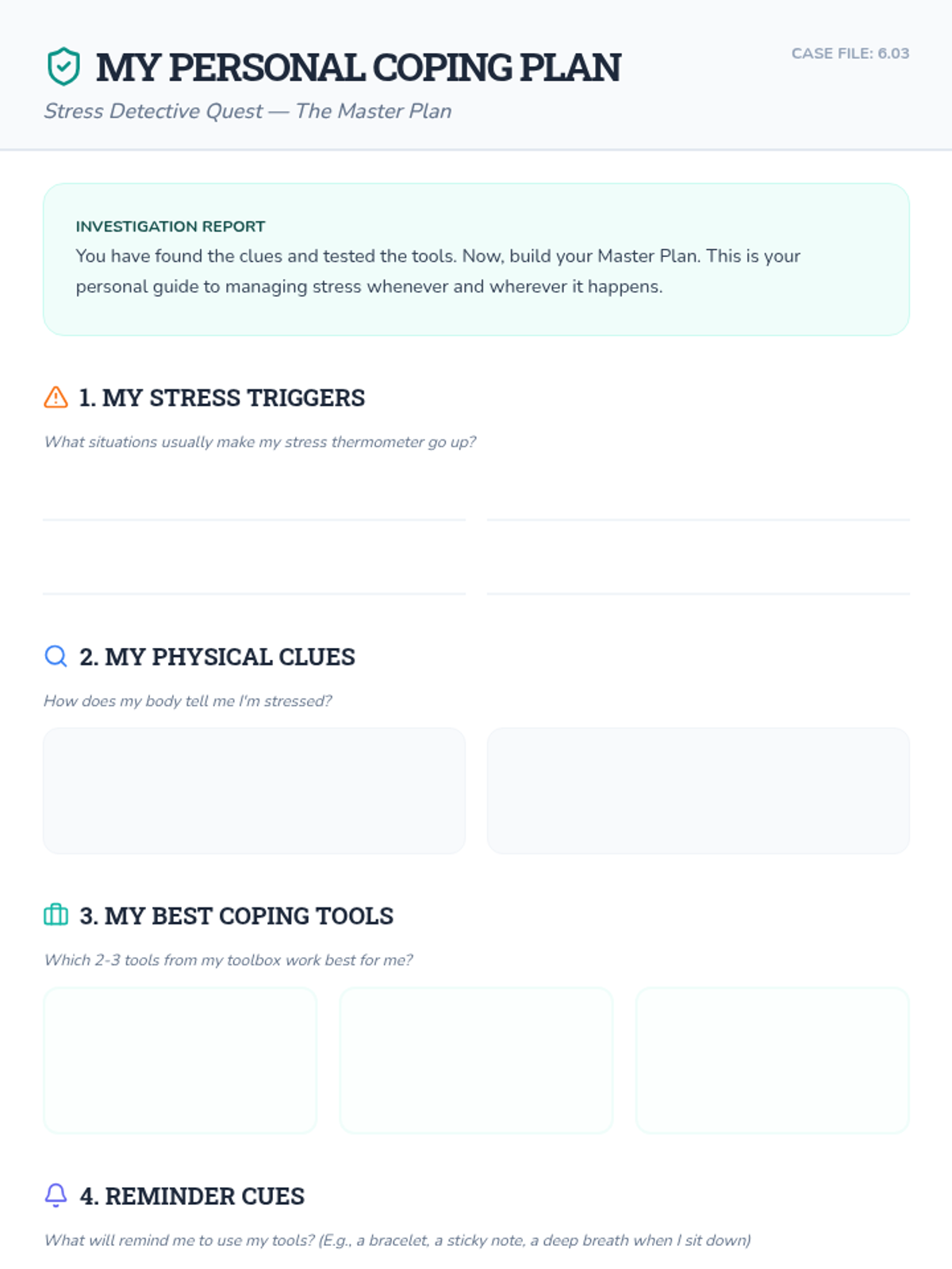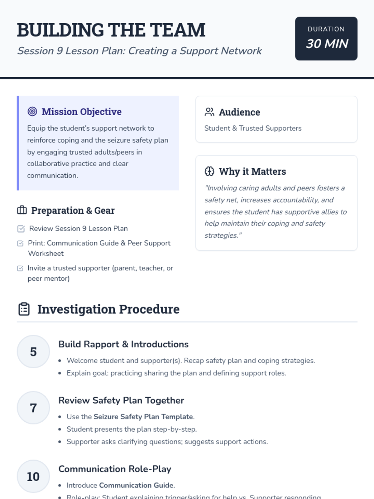 A 10-session, 30-minute individual Tier 3 support program for a 7th grader with a seizure history. Students will learn to identify personal stressors, understand emotional and physical reactions, and practice evidence-based coping strategies to build resilience and reduce stress.