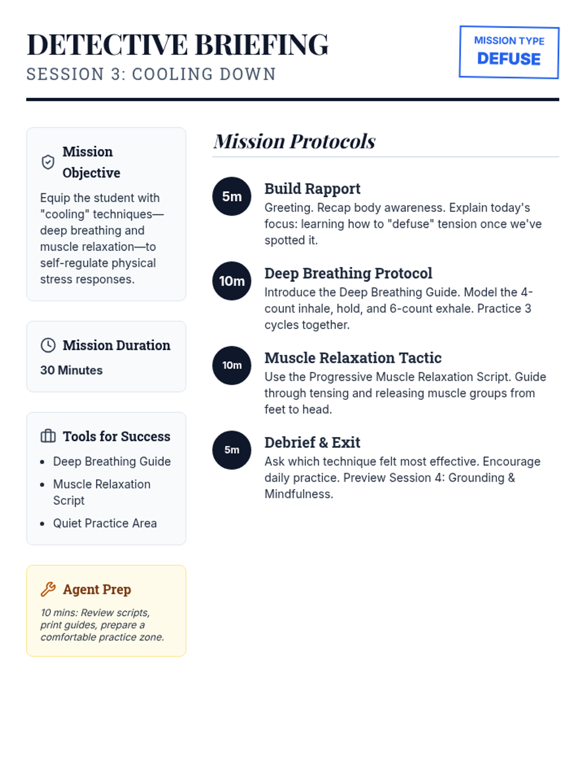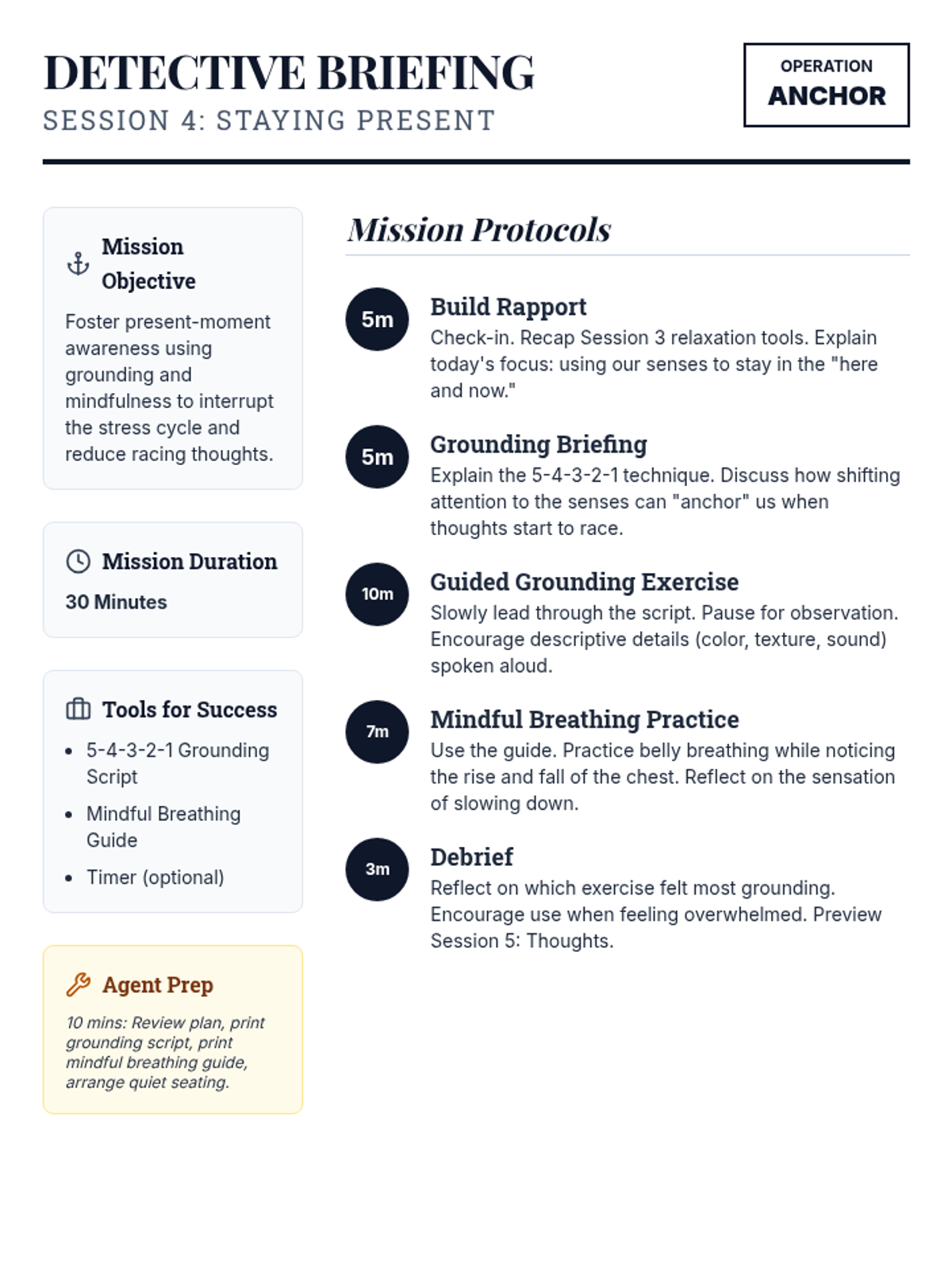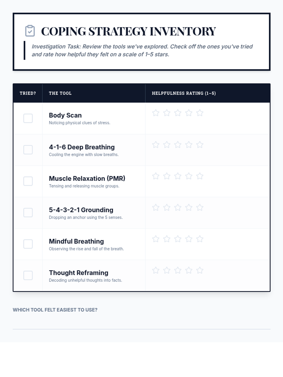 A 6-session counseling group designed to help students identify triggers, understand physical symptoms of anxiety, and build a personalized toolkit of coping strategies through a 'Calm Explorer' theme.