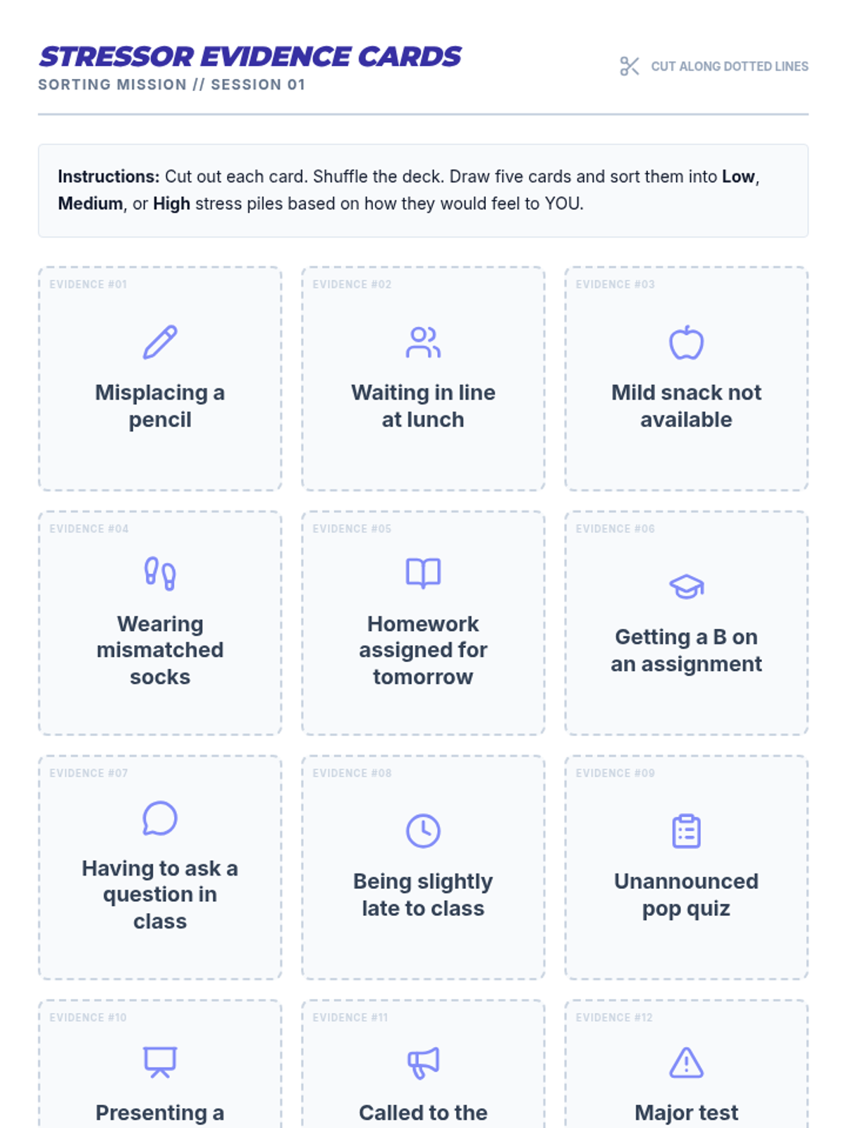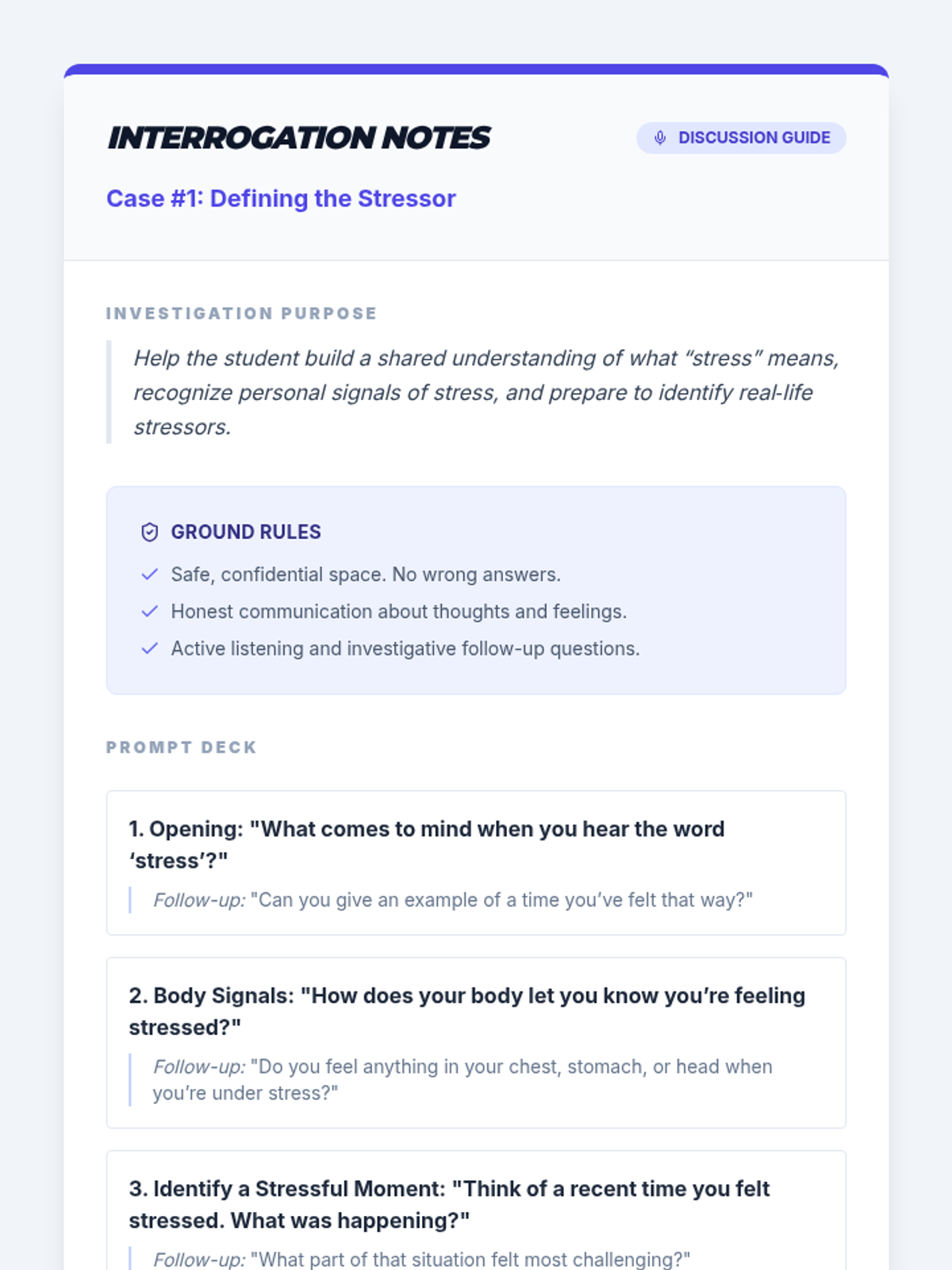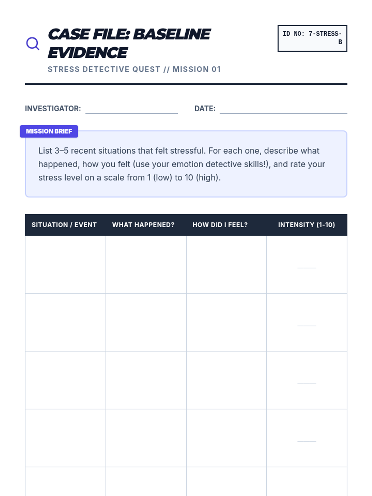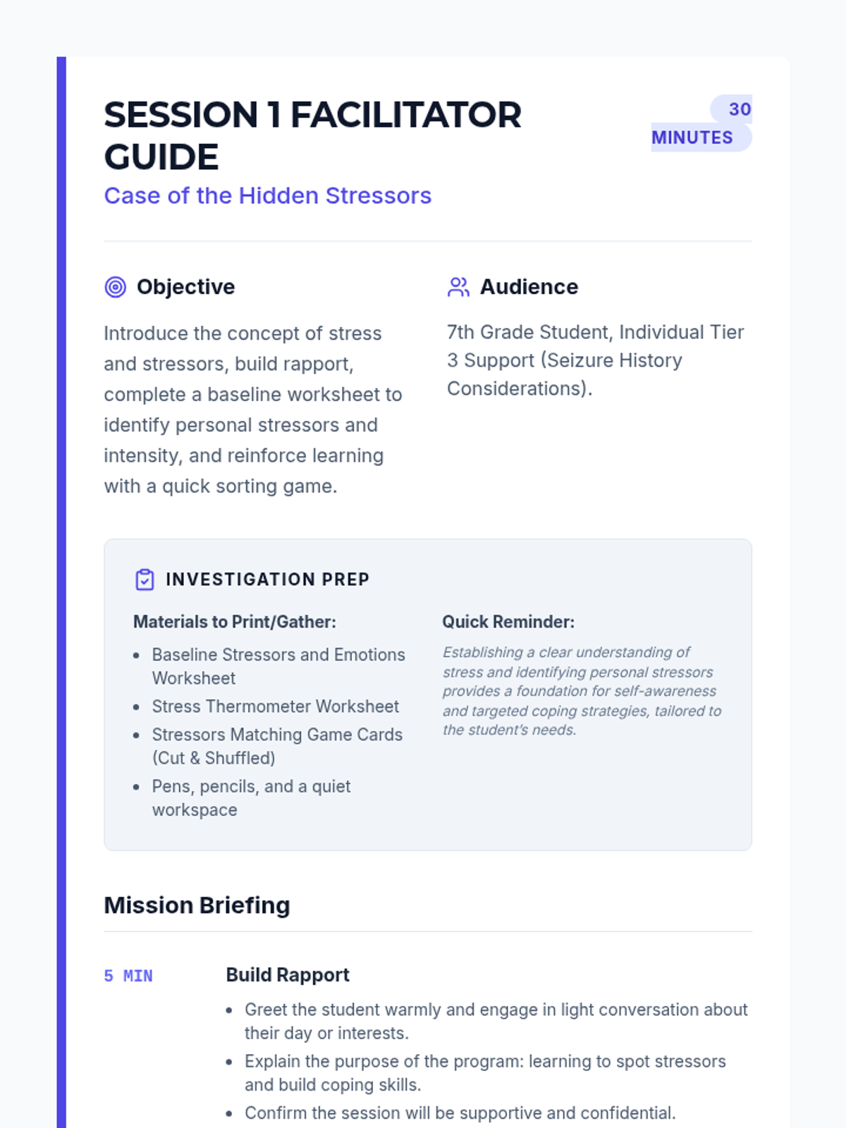 A 10-session Tier 3 support program designed for a 7th-grade student with a seizure history to identify personal stressors, understand physiological reactions, and master evidence-based coping strategies through a detective-themed exploration.