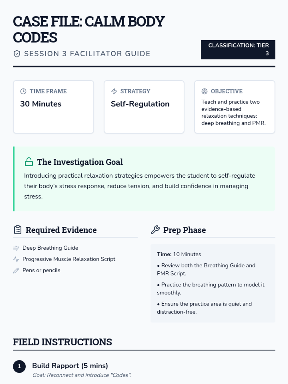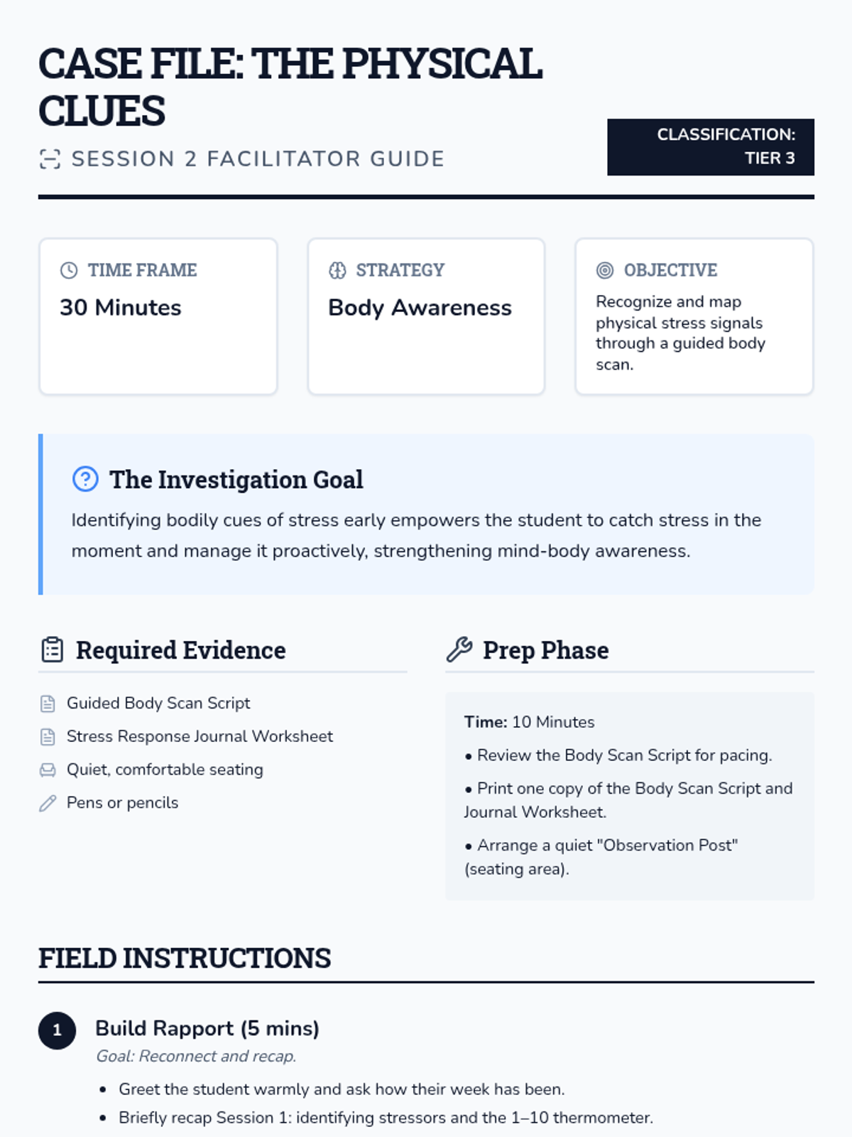 A 10-session individual Tier 3 support program for 7th graders to manage stress and anxiety, specifically tailored for students with a history of seizures. The program uses a detective theme to help students investigate their stress triggers and build a personalized toolkit of coping strategies.
