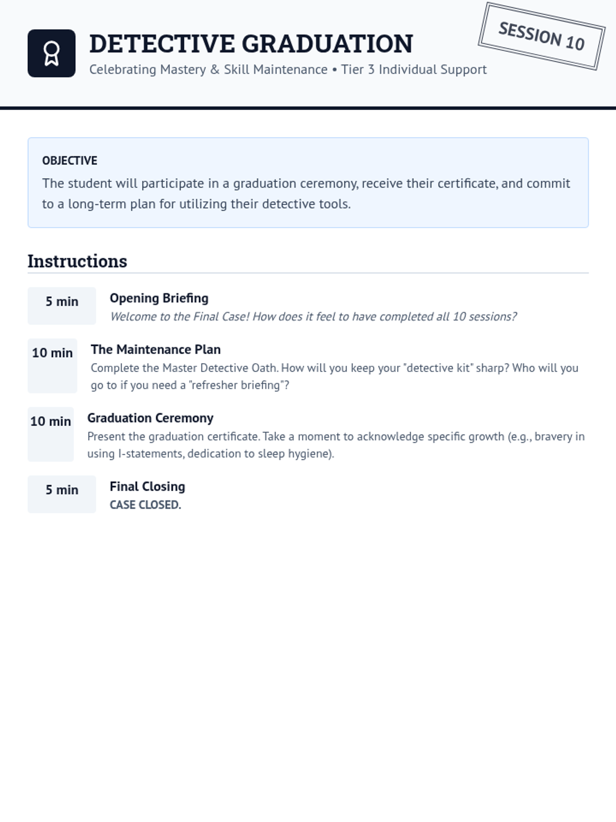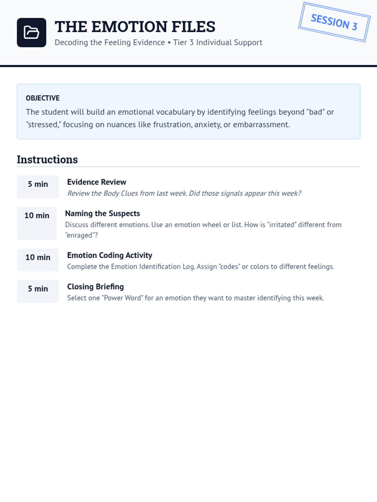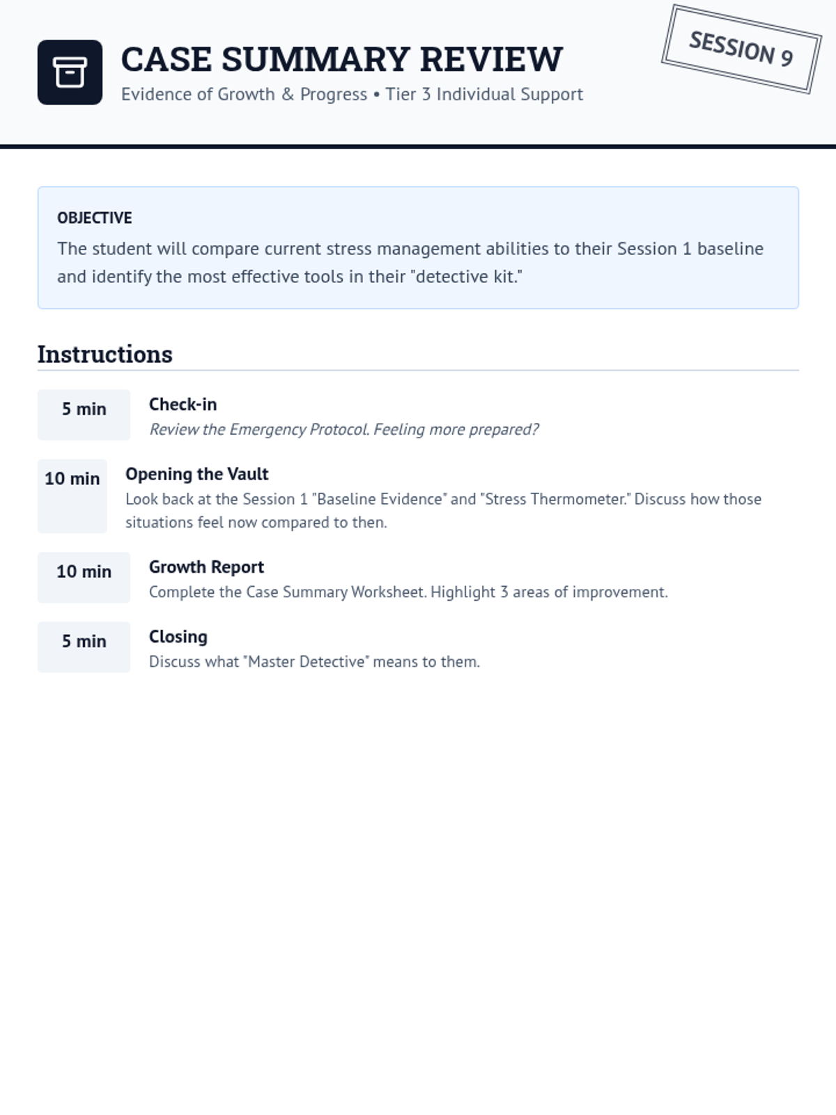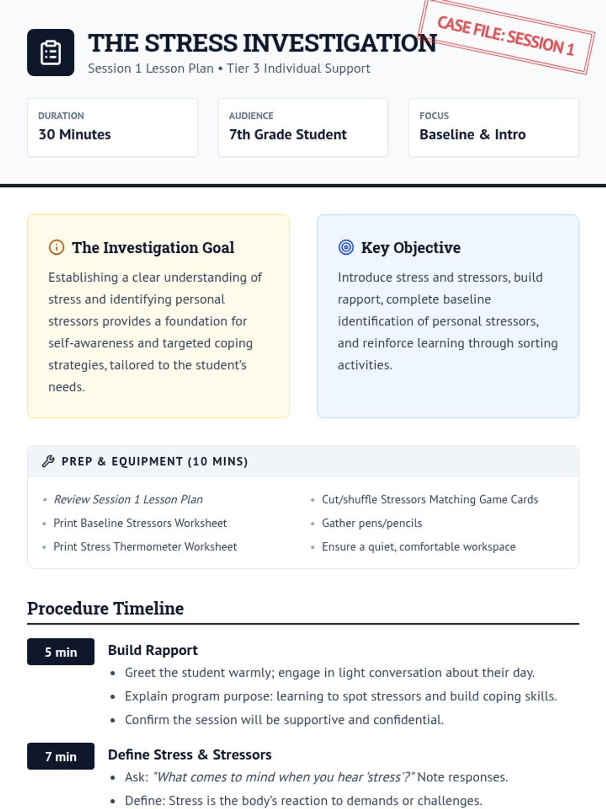 A 10-session individual Tier 3 program for a 7th grader to identify stressors, manage emotions, and develop coping strategies, themed as a detective investigation.