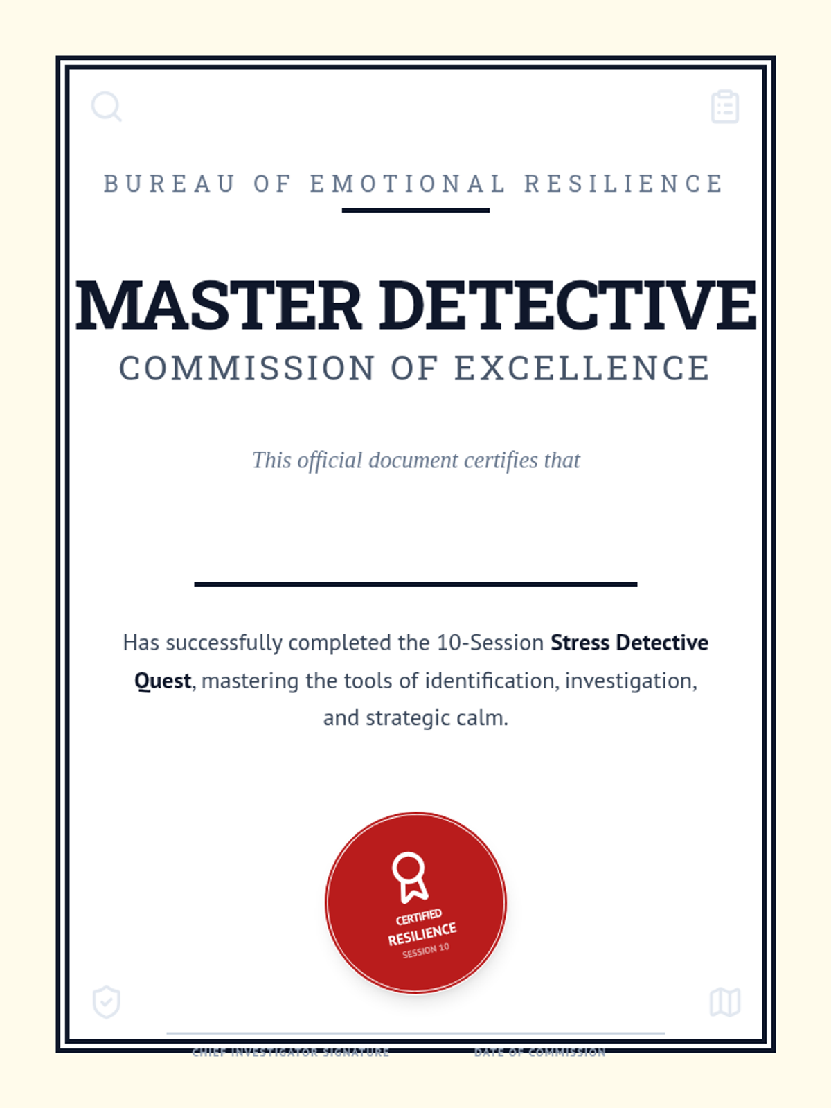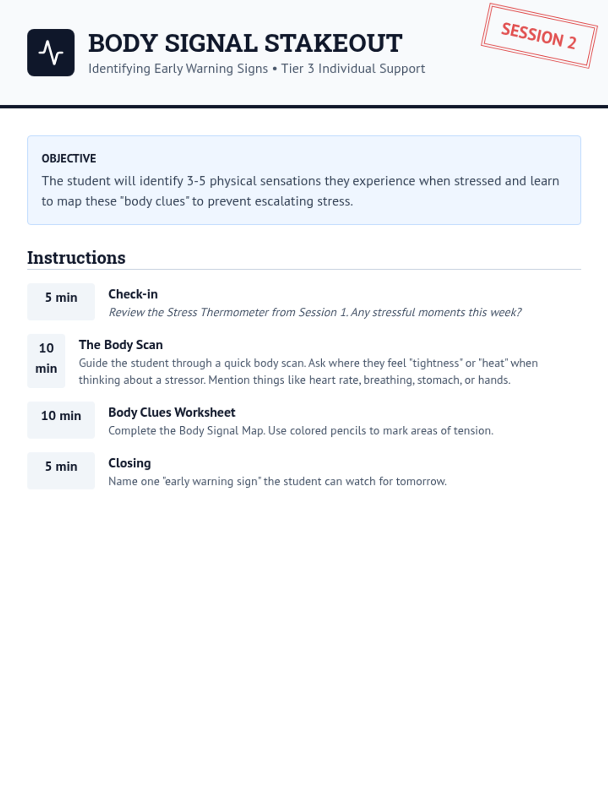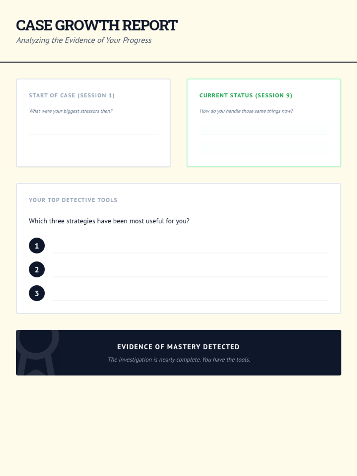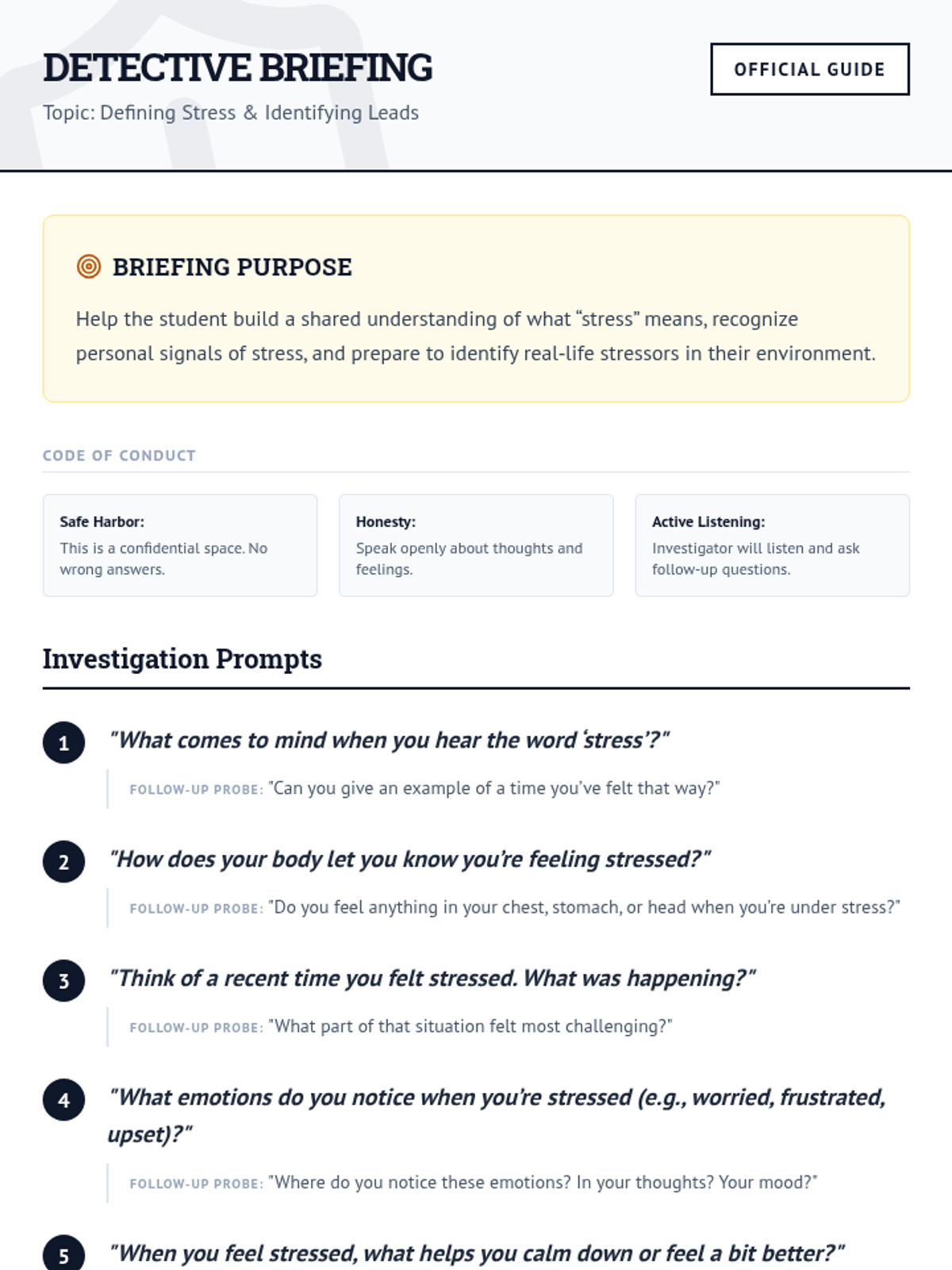 A 10-session individual Tier 3 program for a 7th grader to identify stressors, manage emotions, and develop coping strategies, themed as a detective investigation.