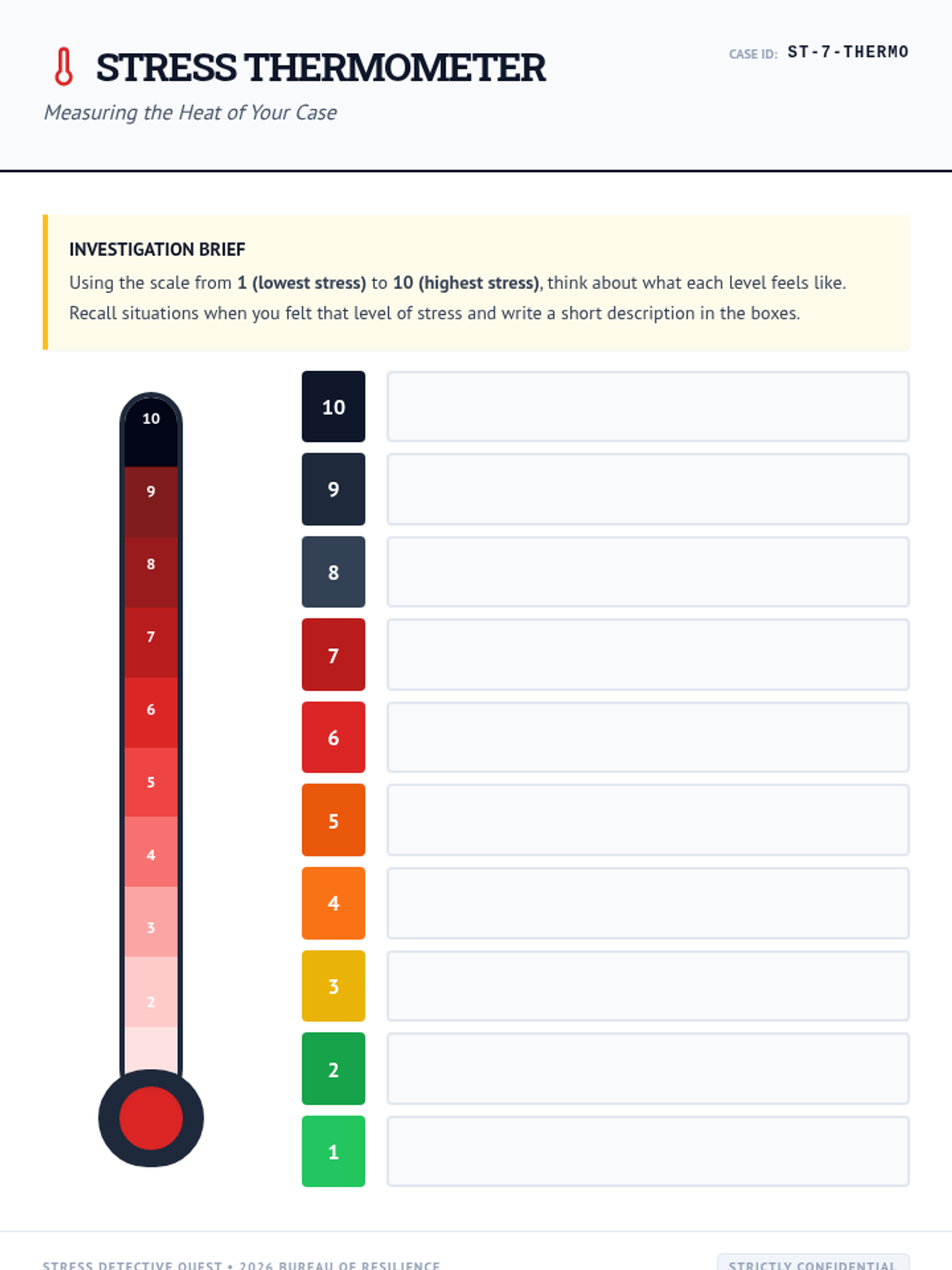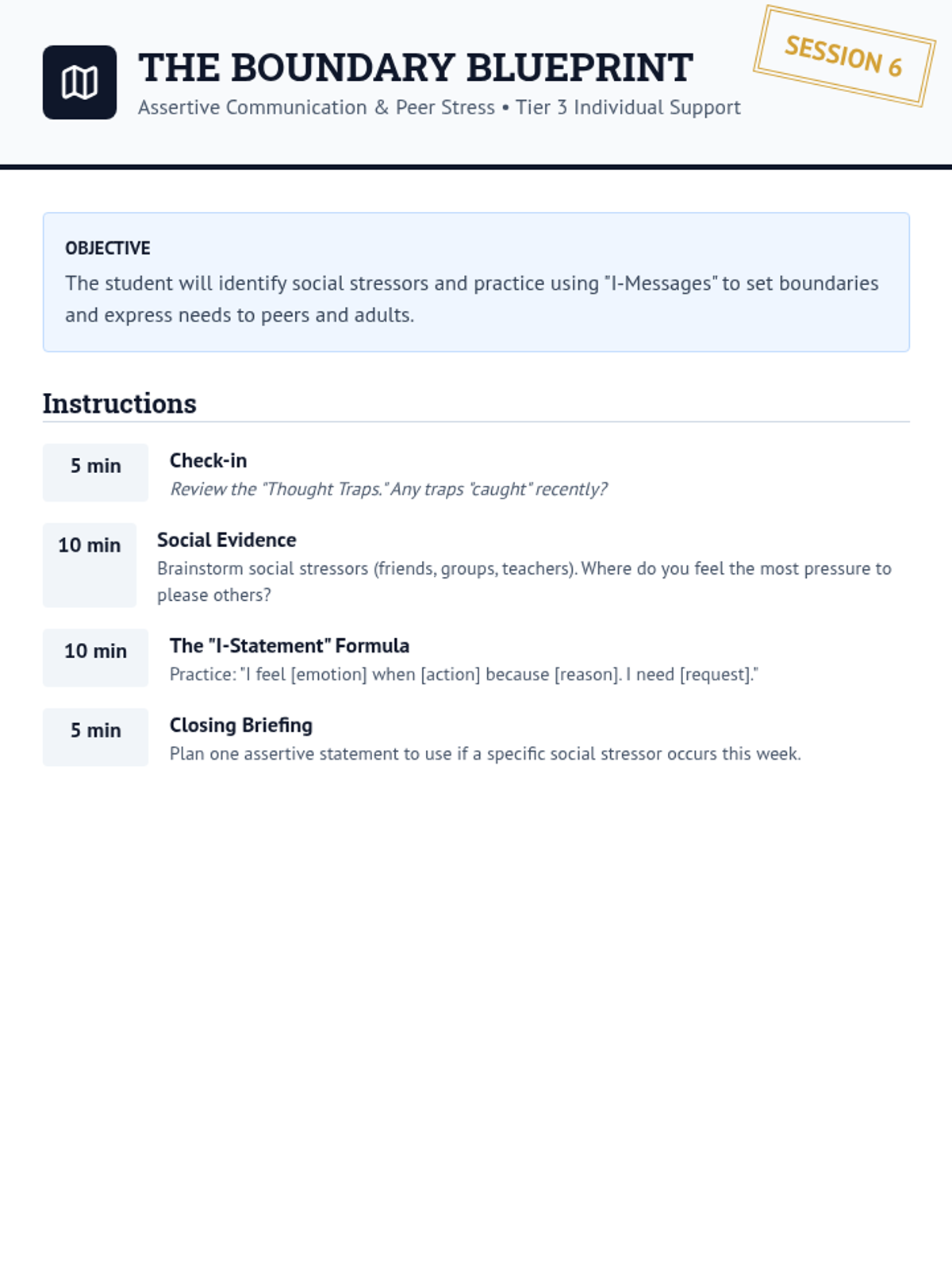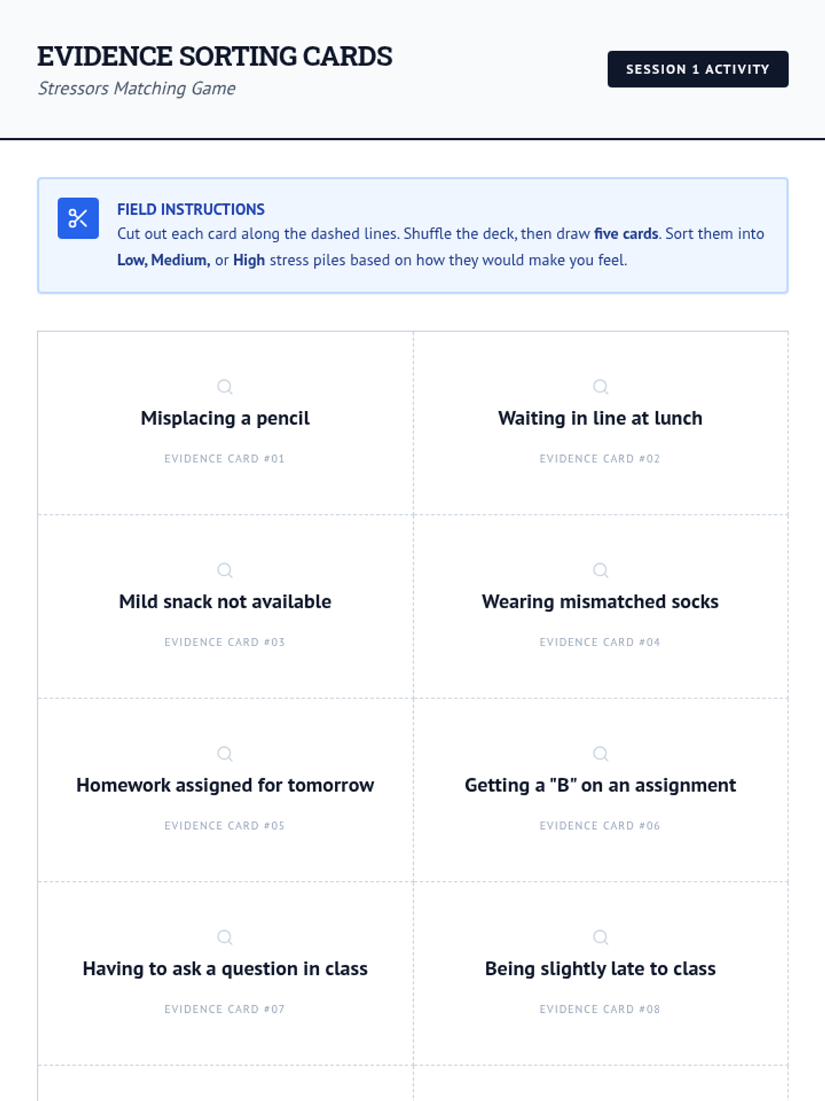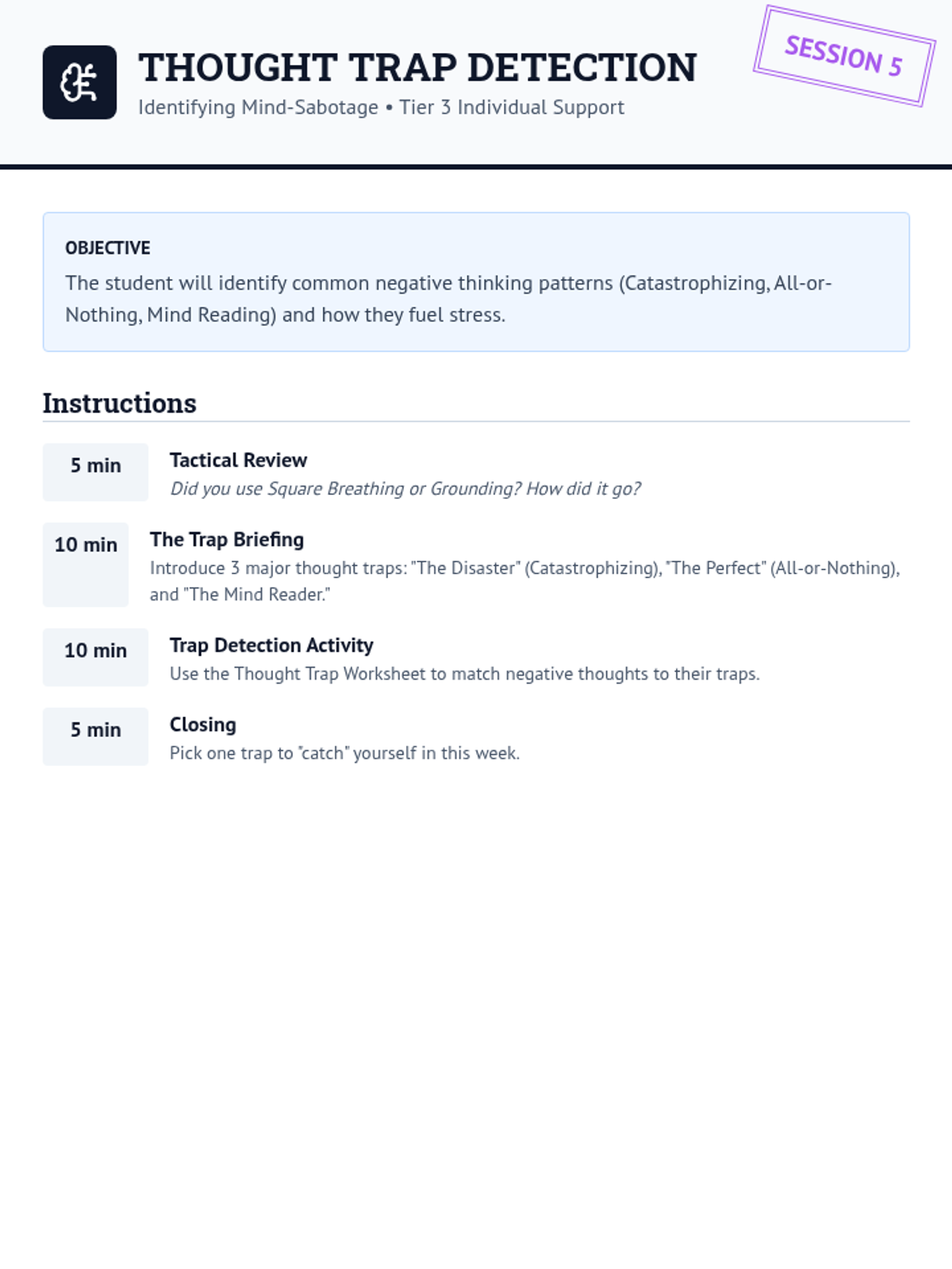 A 10-session individual Tier 3 program for a 7th grader to identify stressors, manage emotions, and develop coping strategies, themed as a detective investigation.