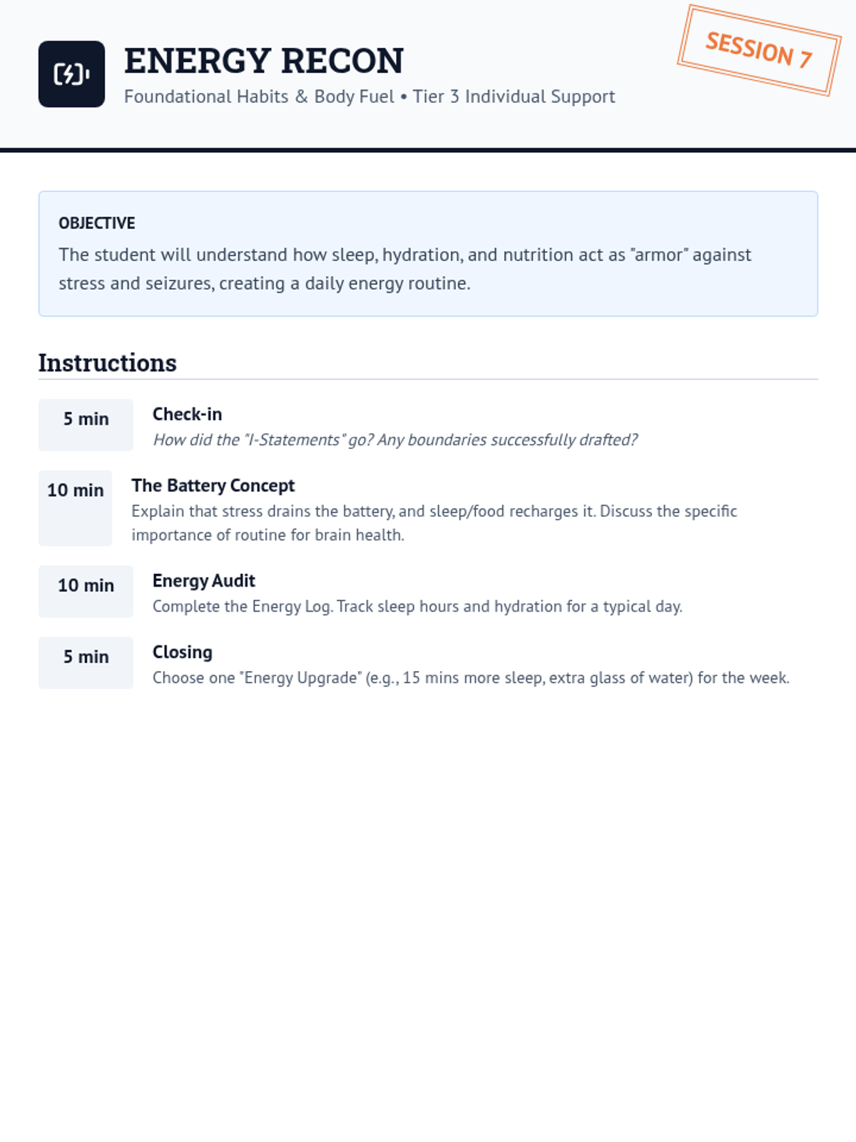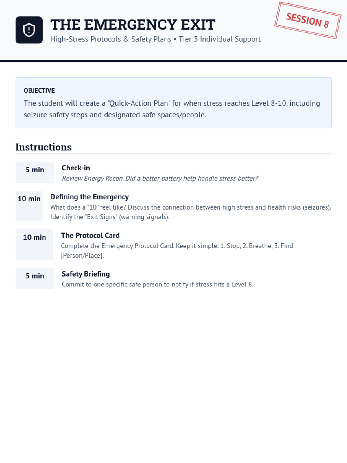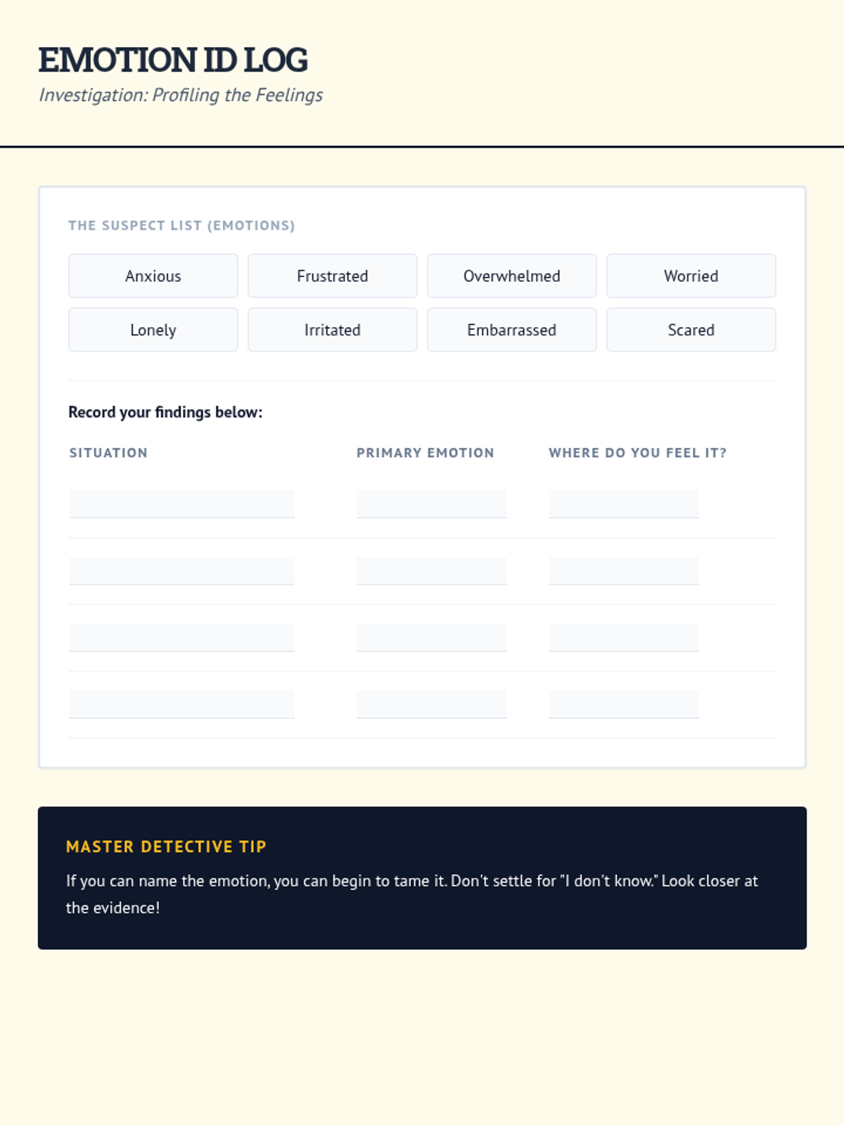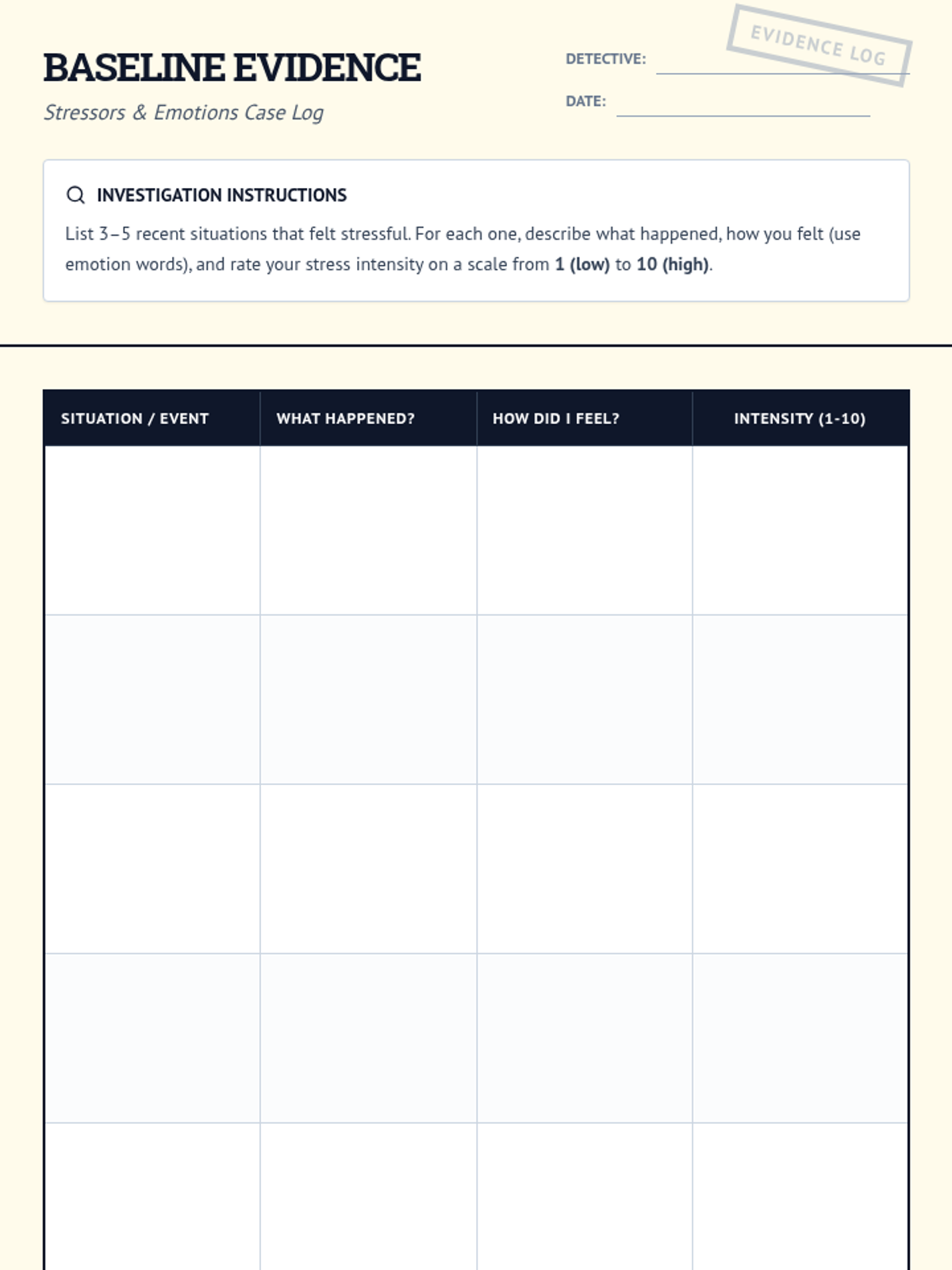 A 10-session individual Tier 3 program for a 7th grader to identify stressors, manage emotions, and develop coping strategies, themed as a detective investigation.