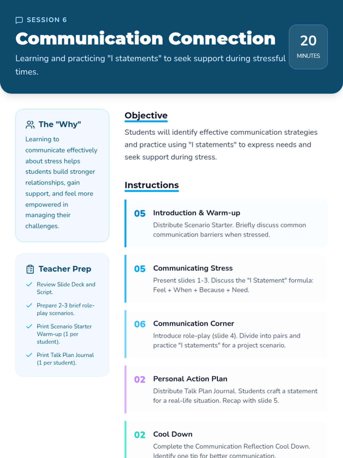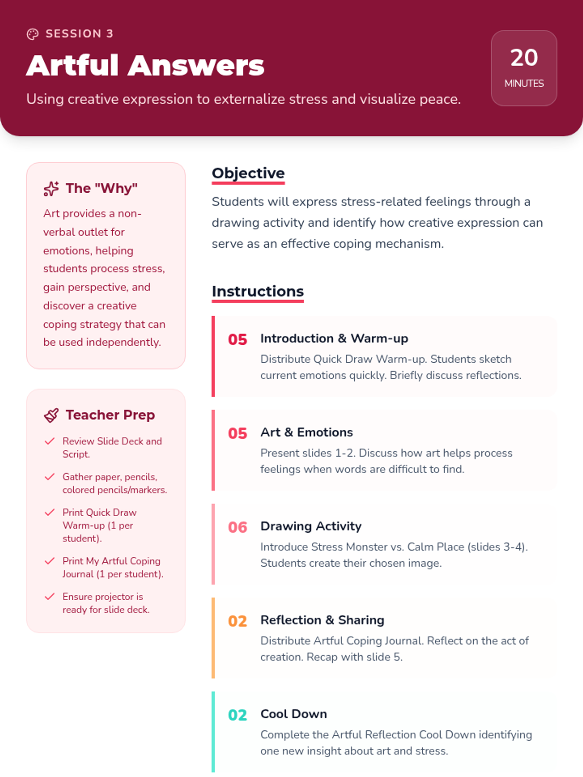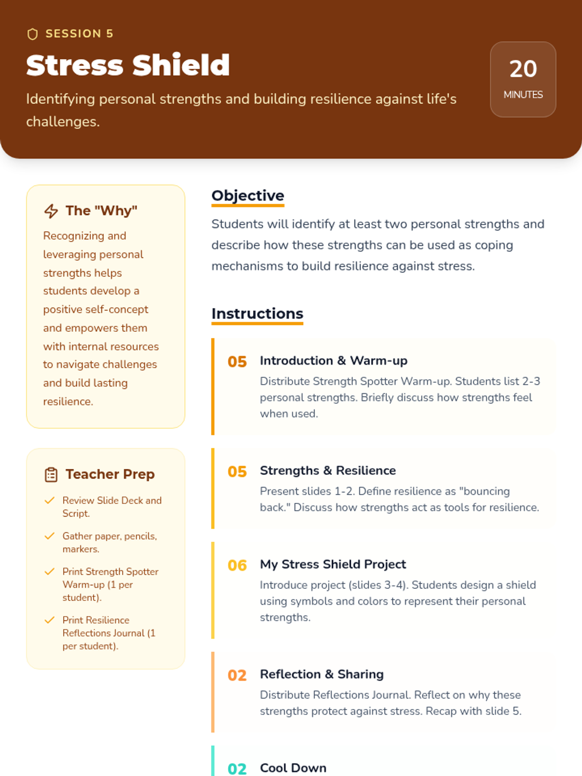 A 6-session Tier 2 small group sequence for 8th graders designed to build stress management skills and resilience through various creative and mindfulness-based strategies.