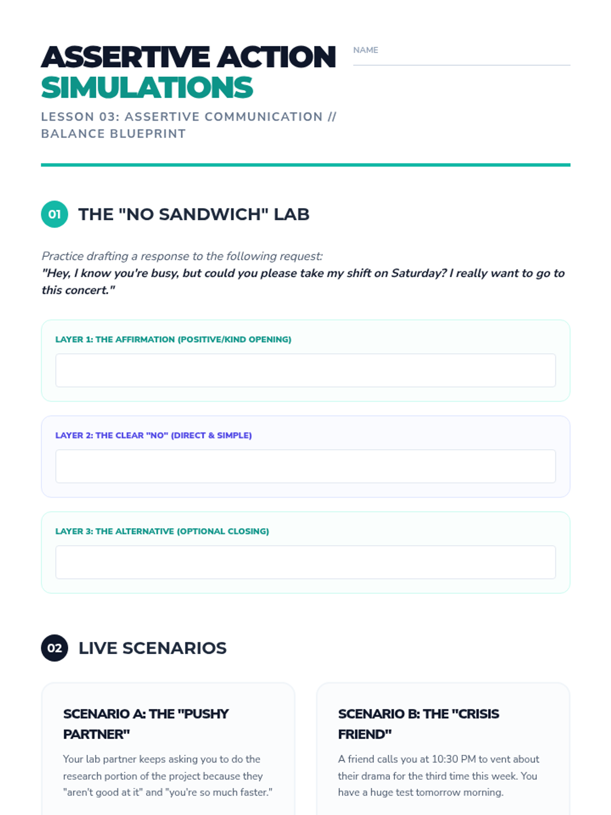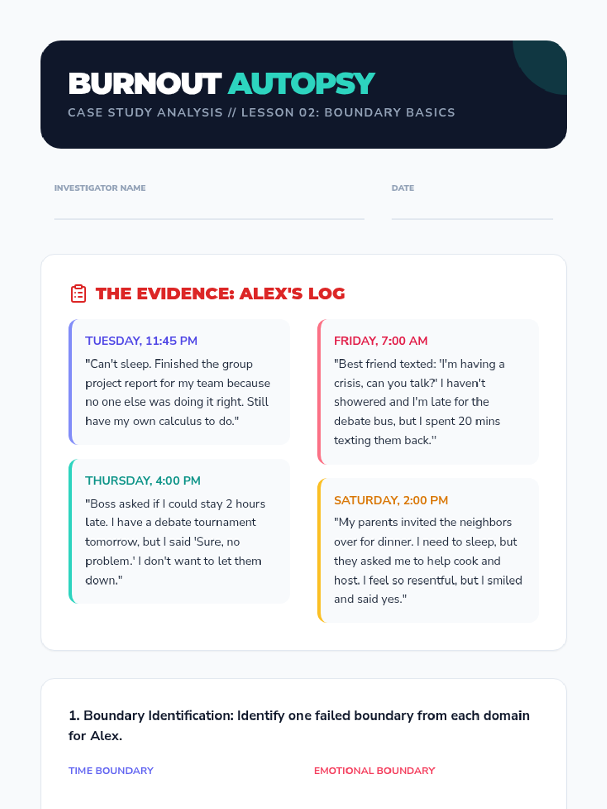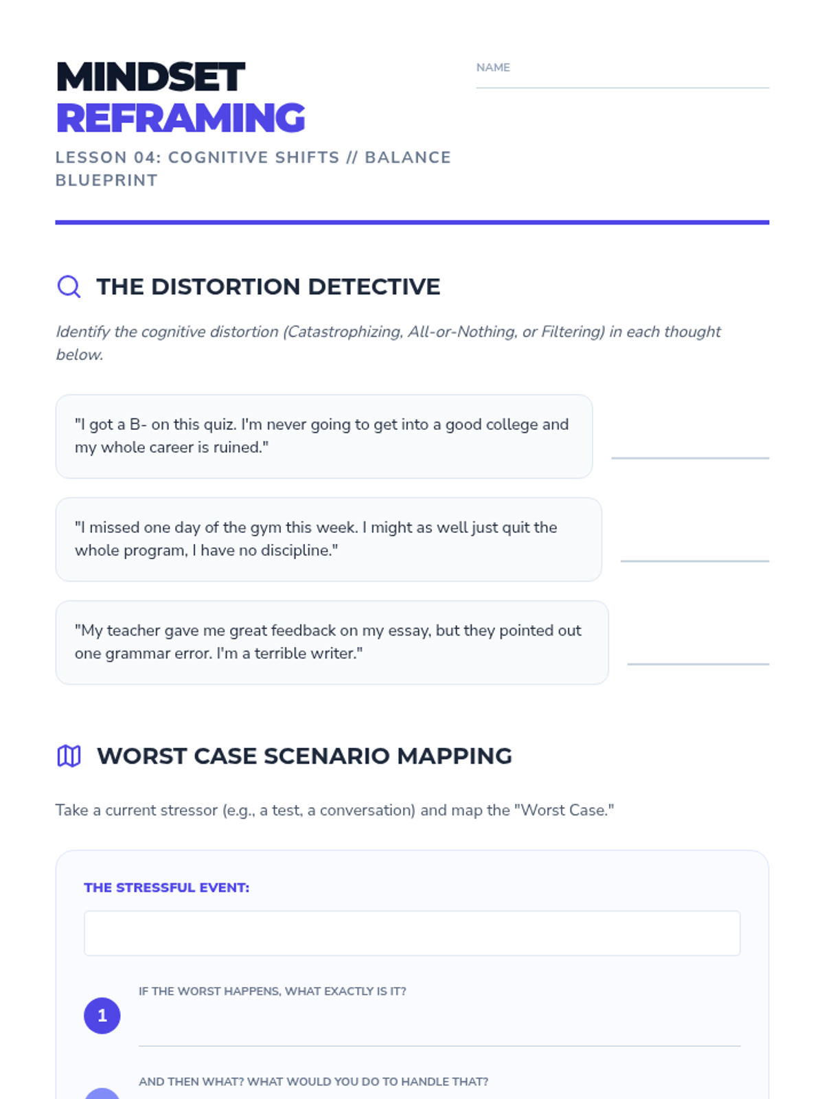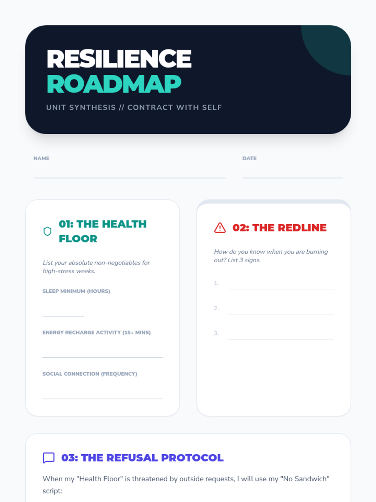 A comprehensive 11th-grade mental health sequence focusing on the external and internal management of stress through strategic time auditing, boundary setting, and cognitive reframing. Students develop a sustainable resilience framework to balance academic pressure with personal well-being.