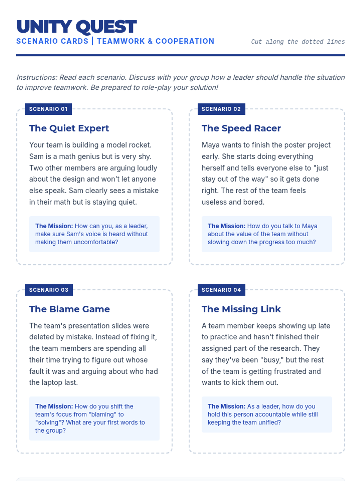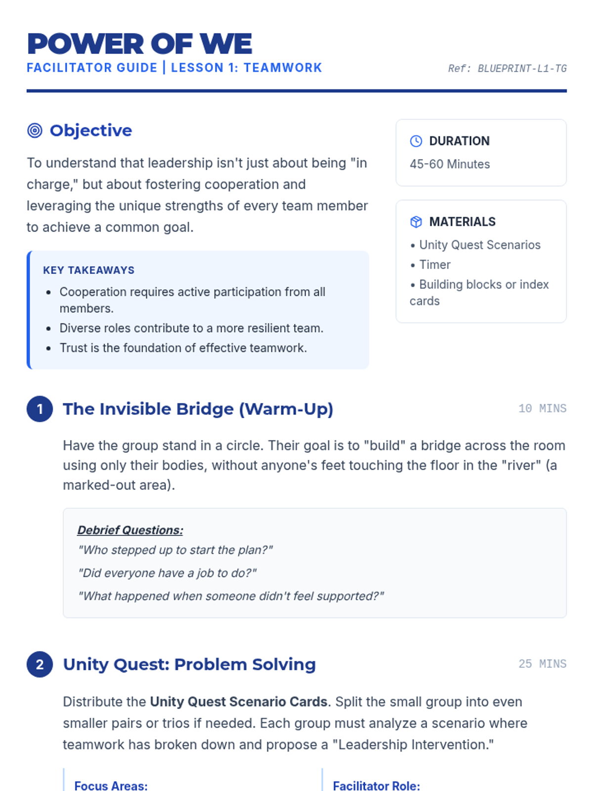 A 4-part small group leadership curriculum focusing on teamwork, communication, problem-solving, and initiative through hands-on activities and role-playing.