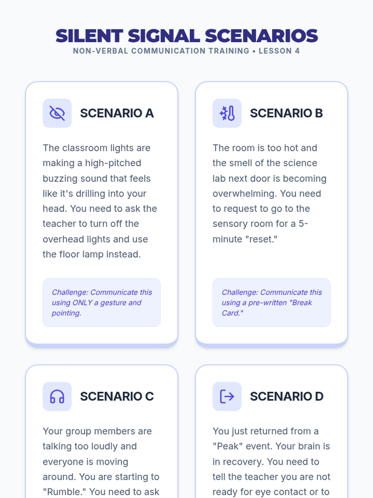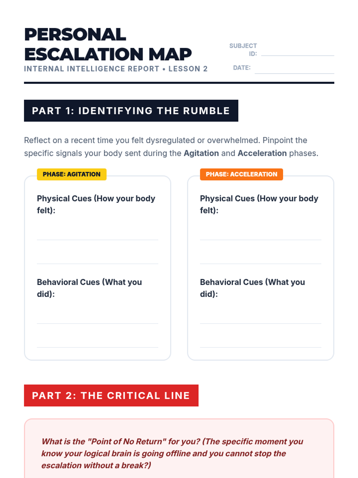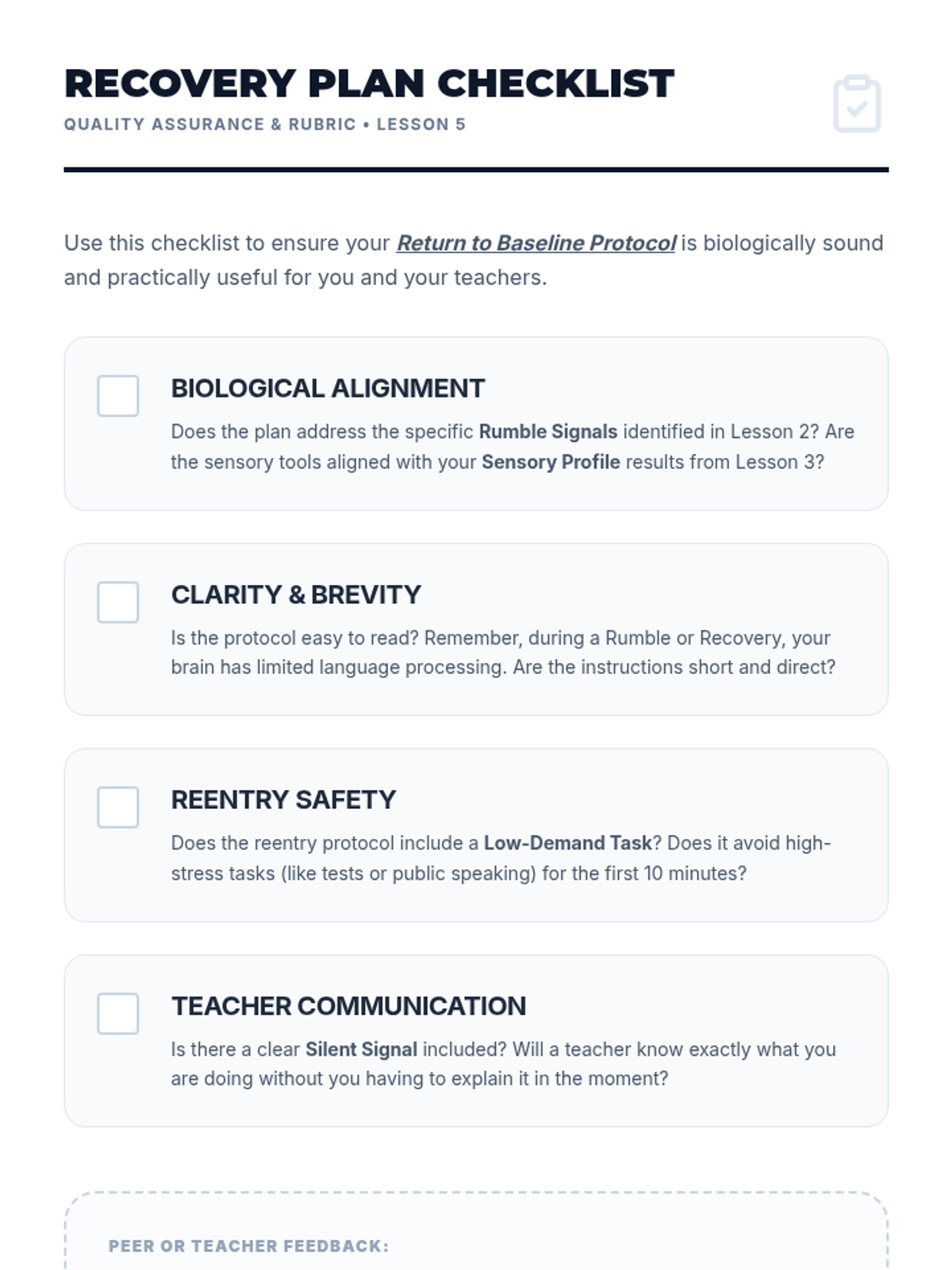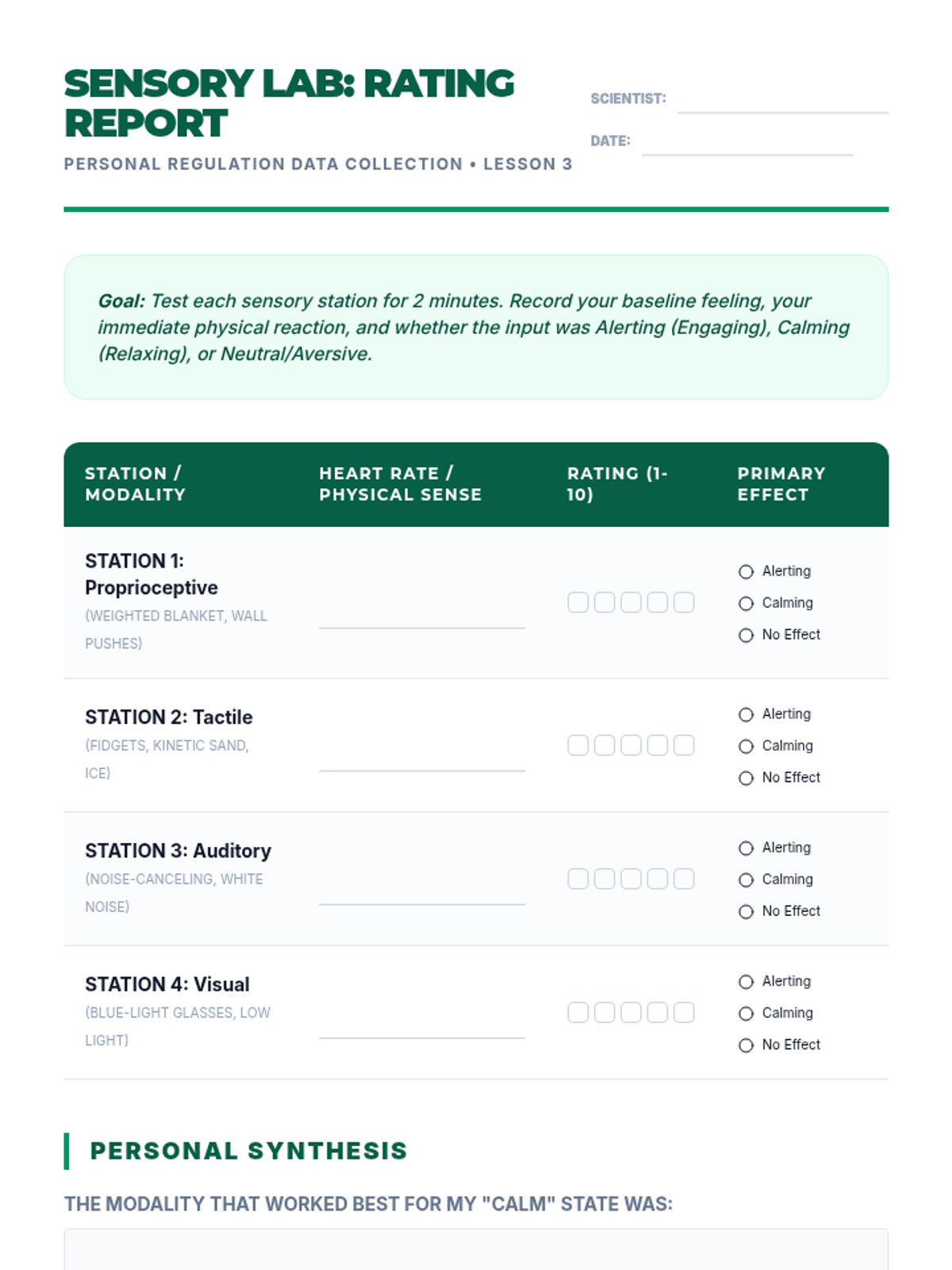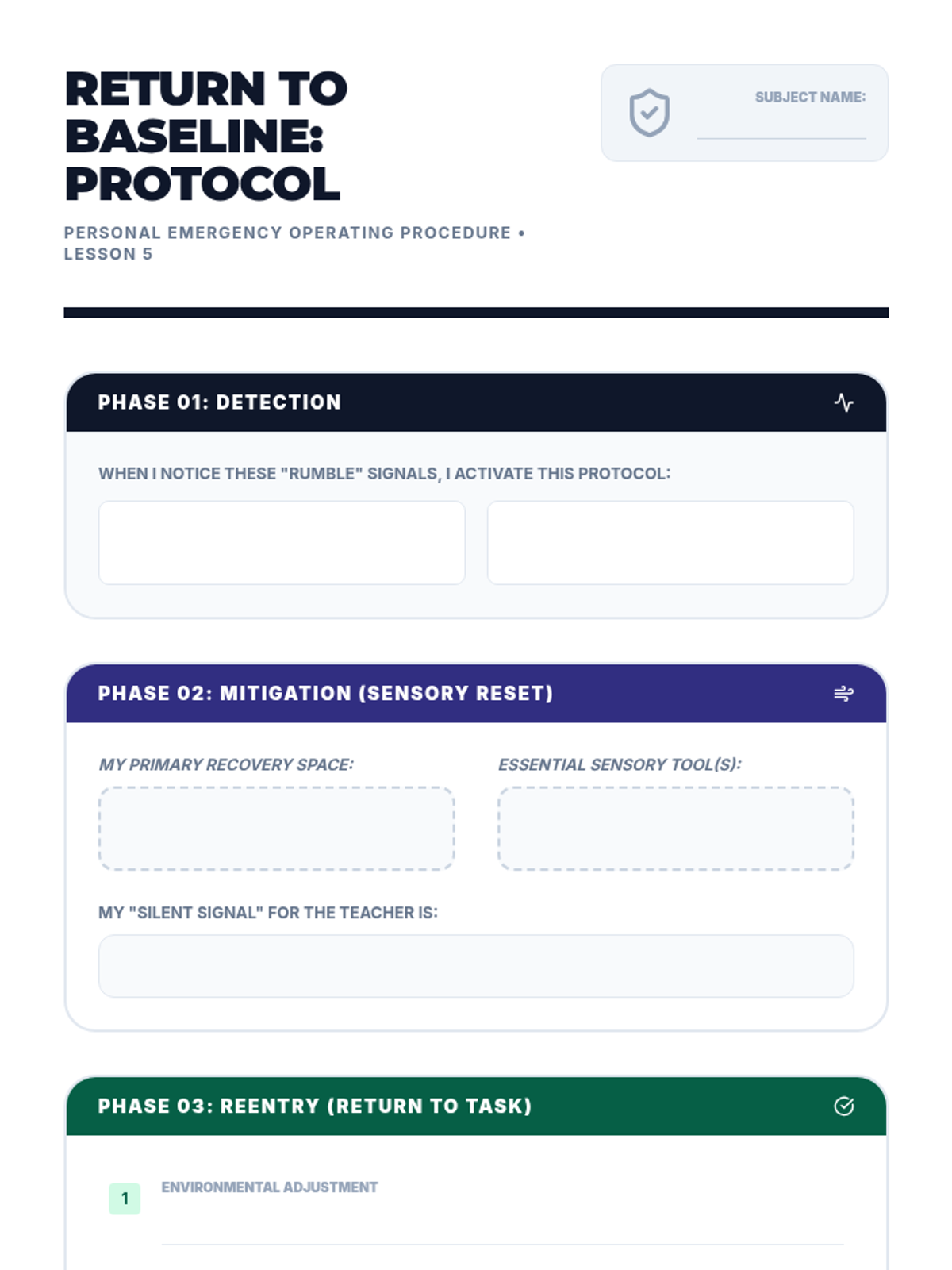 A comprehensive 5-lesson unit for 10th-grade students on the biological mechanisms of stress, the escalation cycle, and the creation of personalized sensory recovery protocols. Students explore the autonomic nervous system, map their physical cues, test sensory tools, and design 'Return to Baseline' plans.