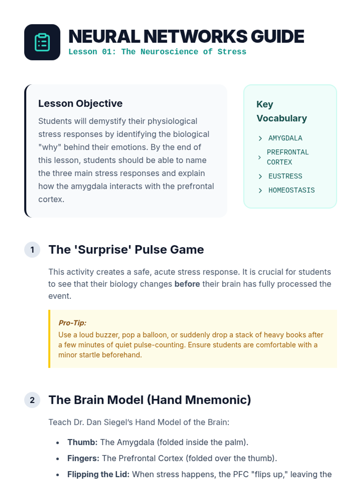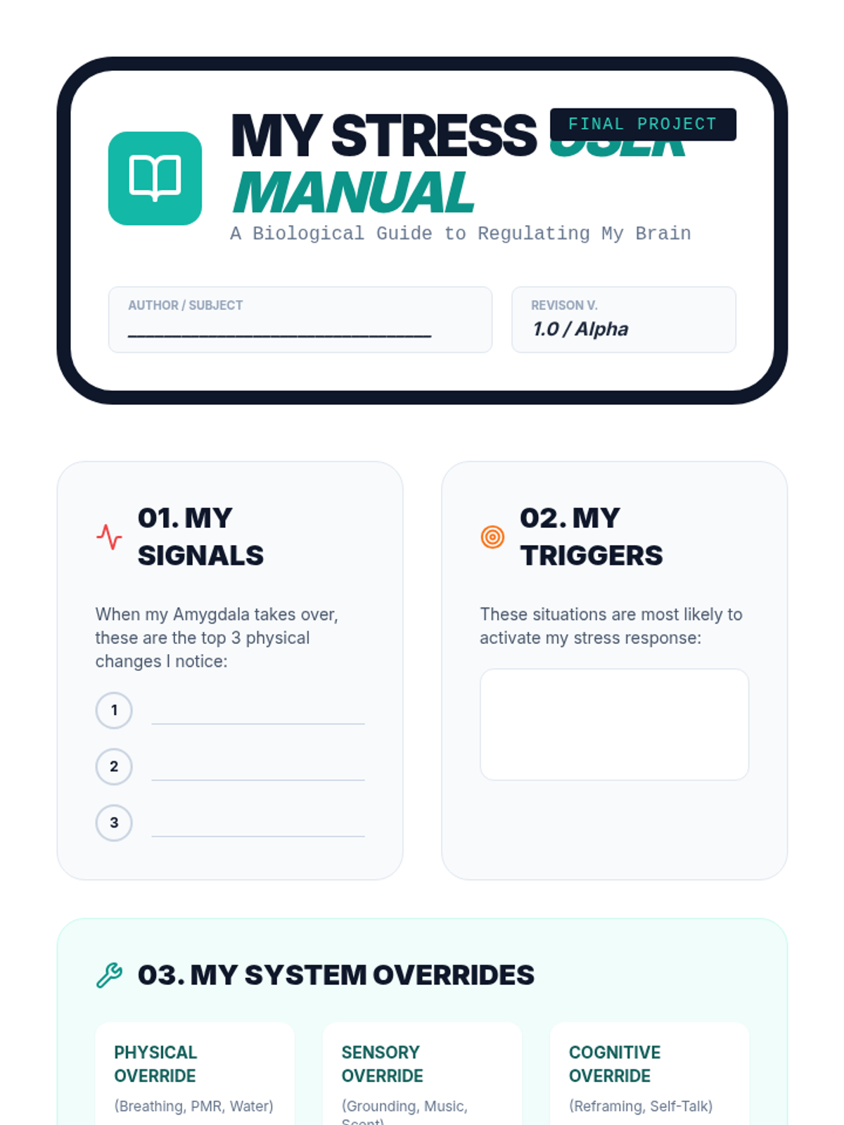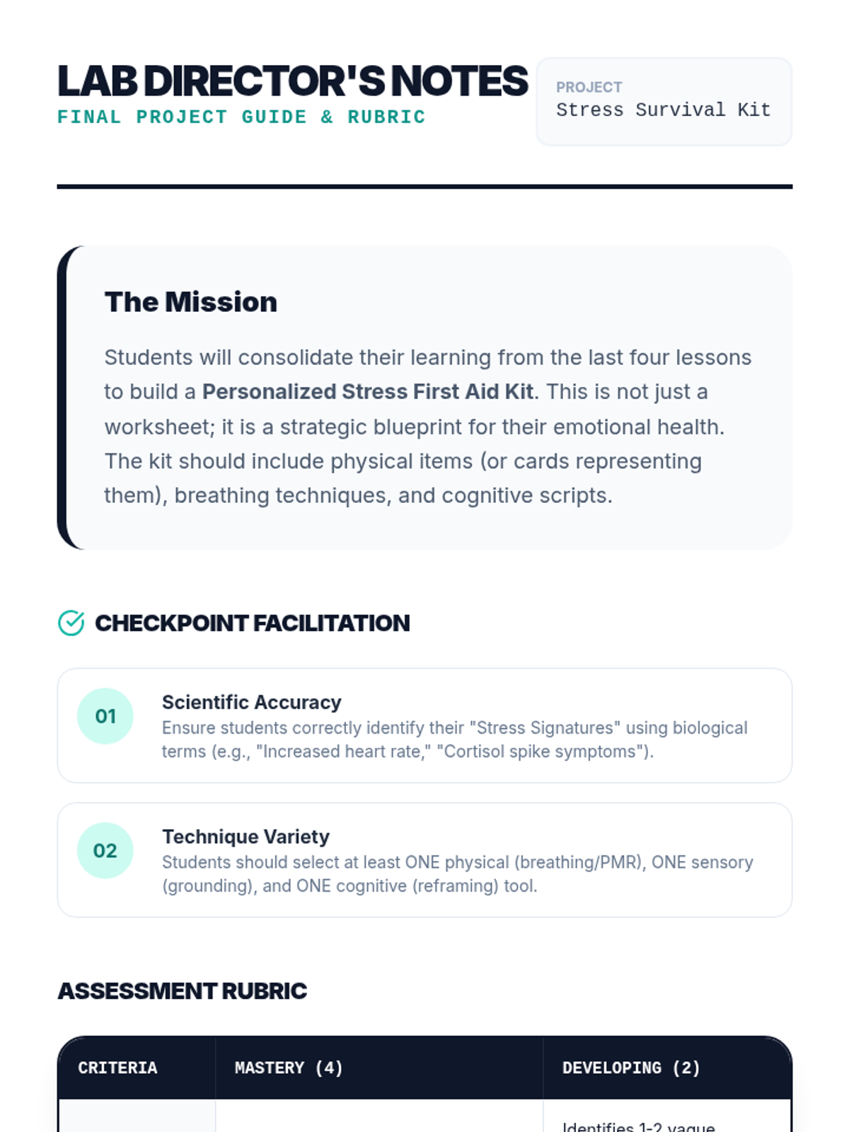 A biological approach to stress management for 8th graders, focusing on the neuroscience of the stress response and practical regulation techniques. Students move from understanding the 'fight-flight-freeze' mechanism to building a personalized coping toolkit.