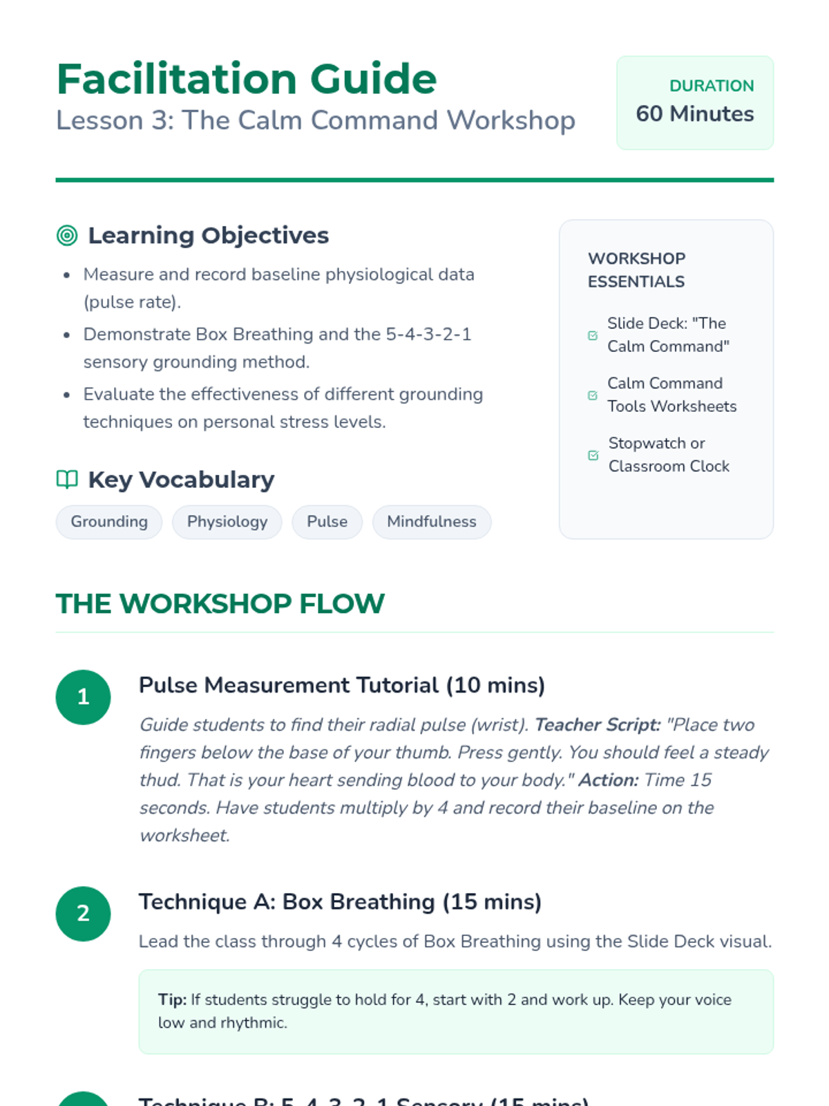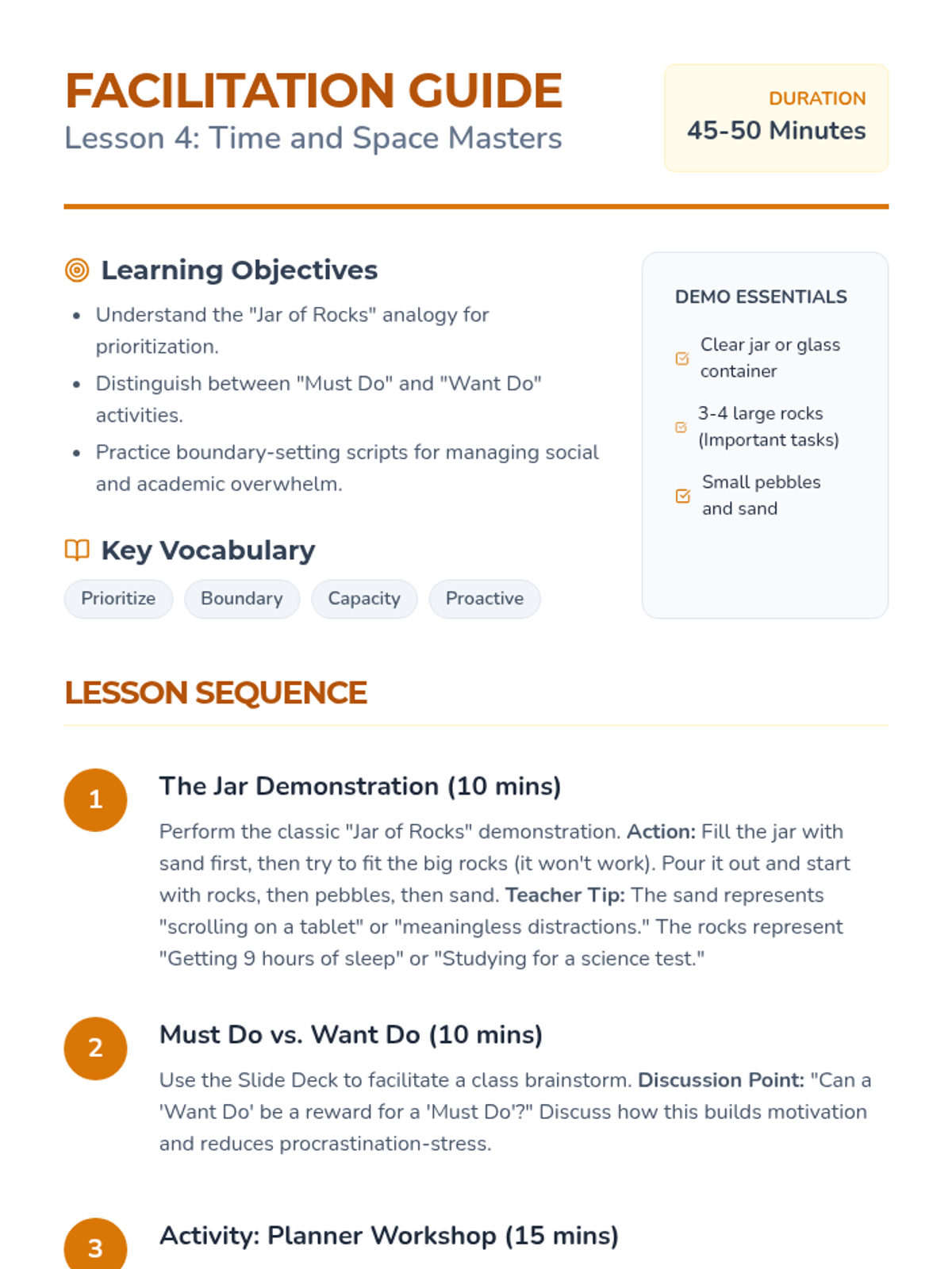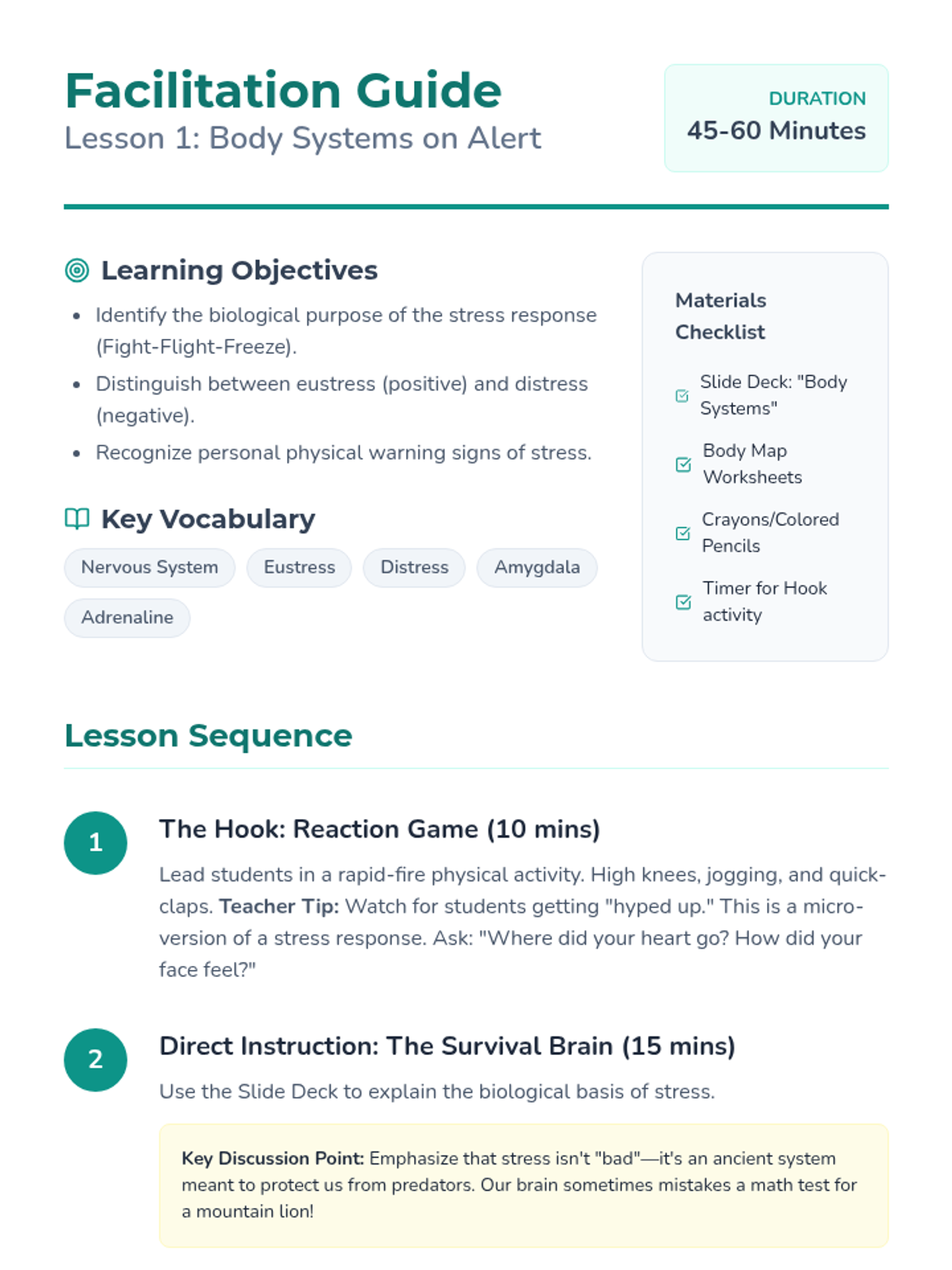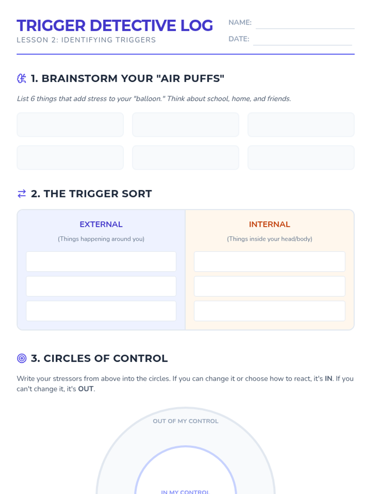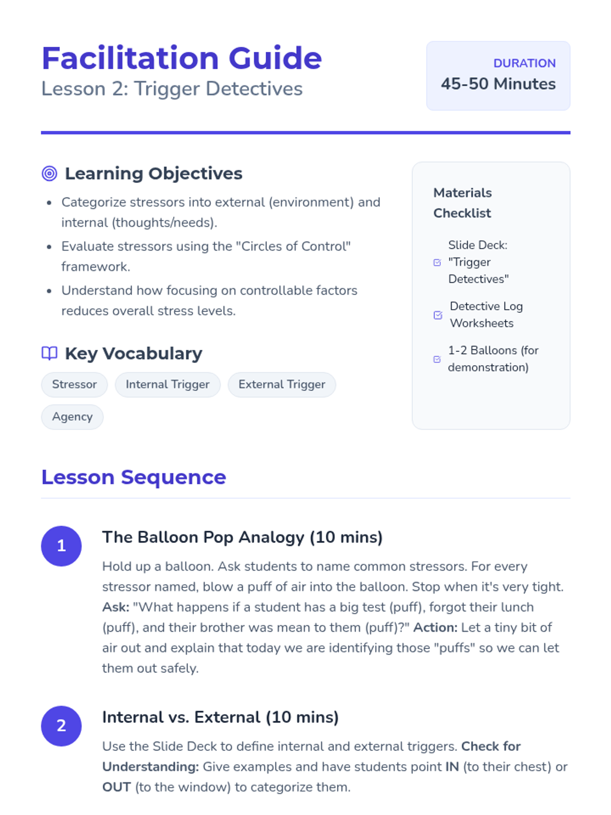 A comprehensive 5-lesson series for 5th graders to understand the biology of stress, identify personal triggers, and build a personalized toolkit of mindfulness, time-management, and resilience strategies.