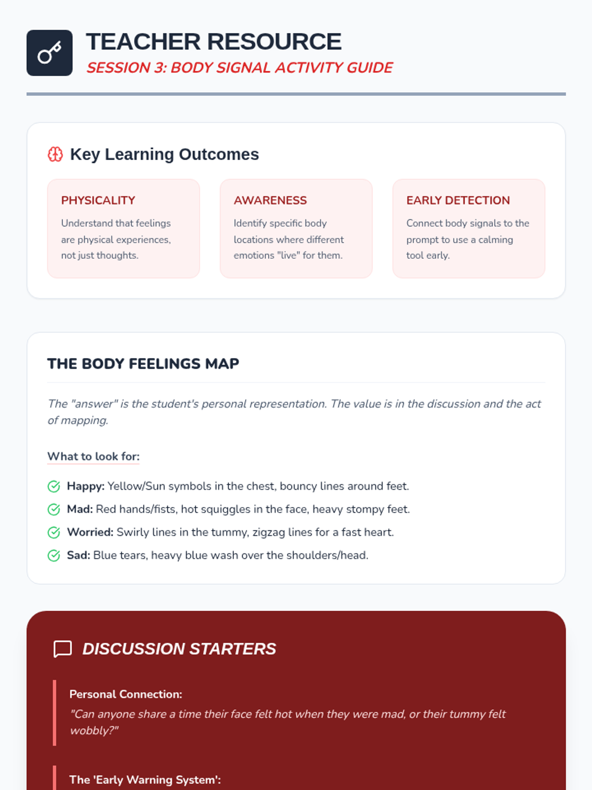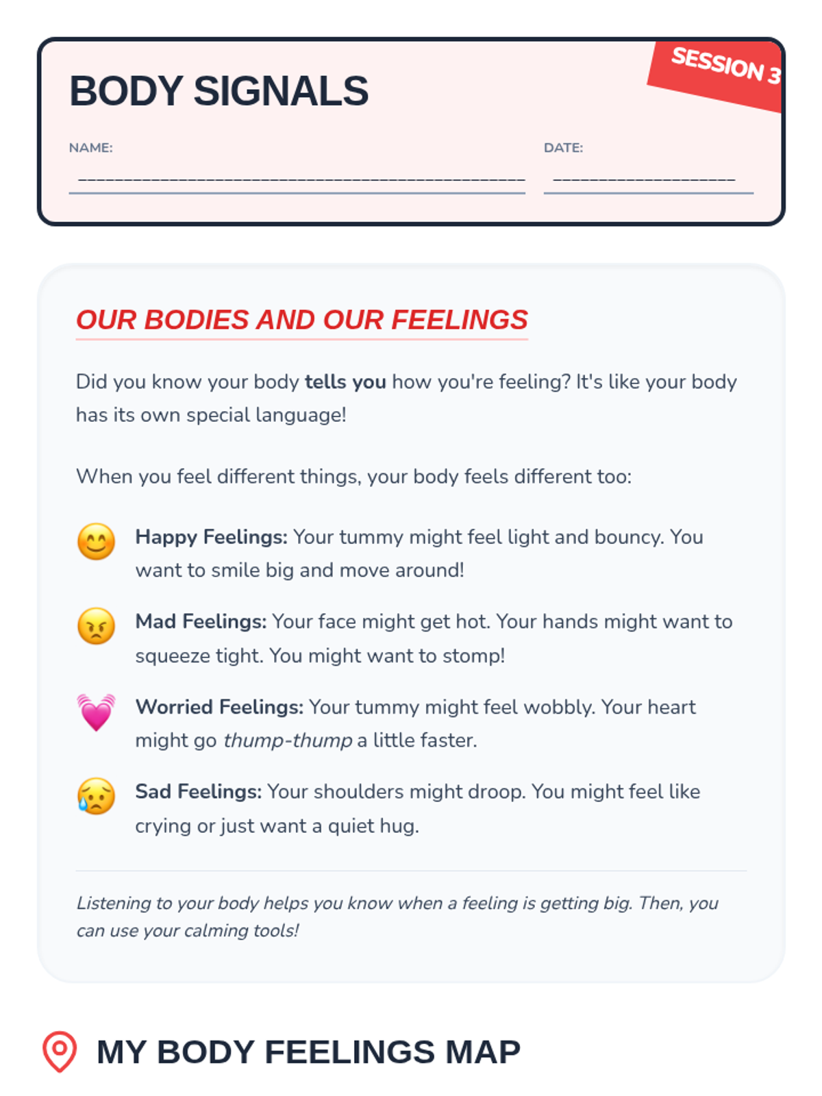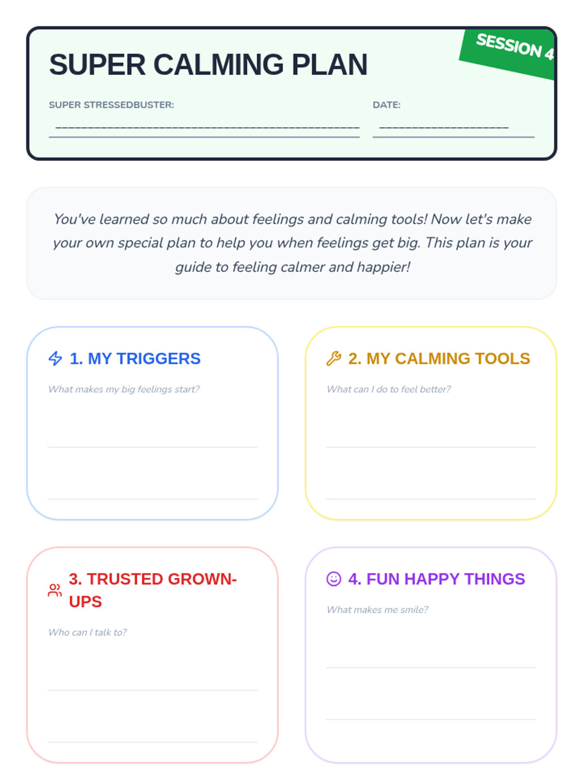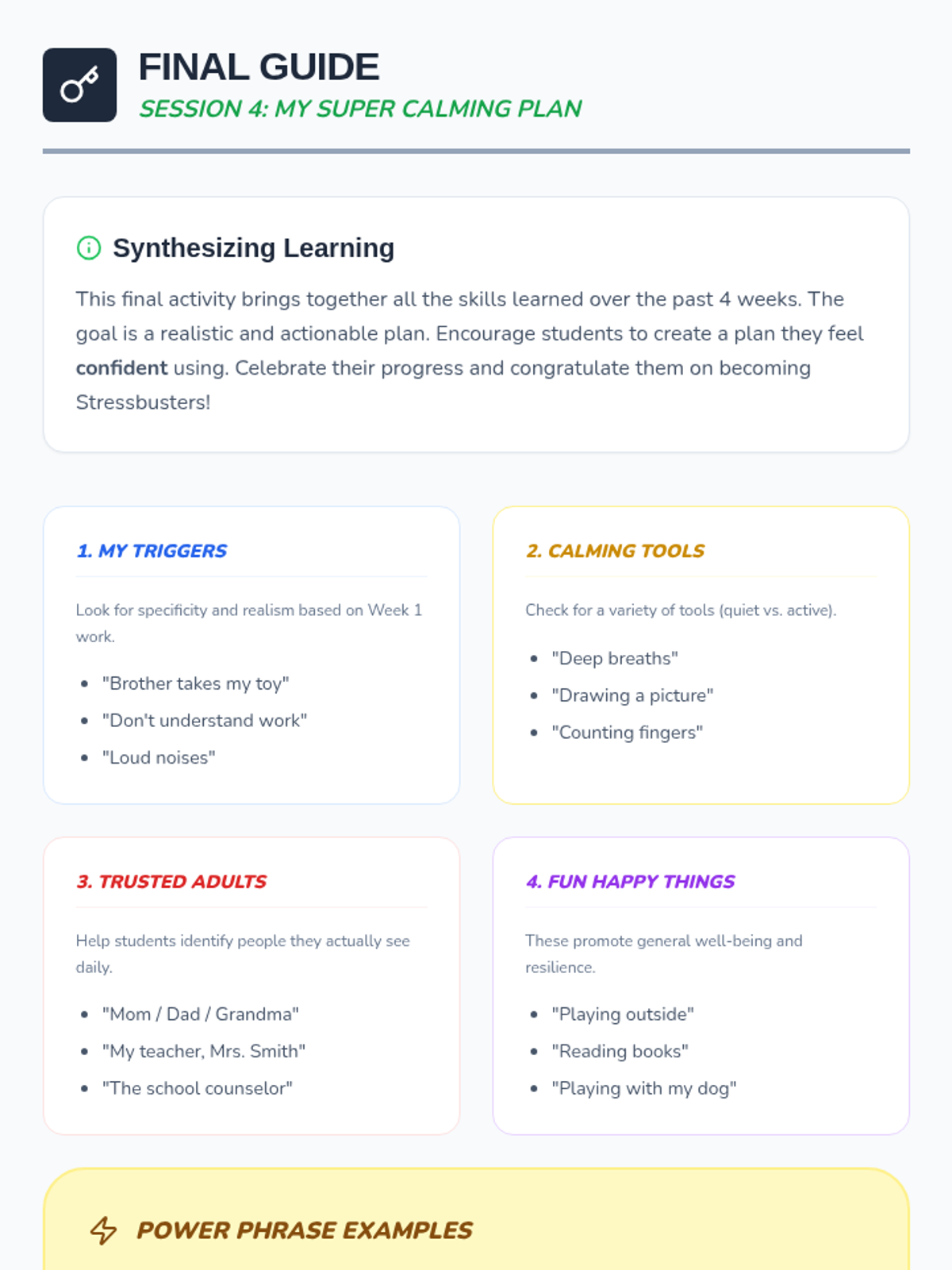 A 4-week emotional regulation series that helps young students identify feeling triggers, discover calming tools, understand body signals, and create a personalized 'Super Calming Plan'.