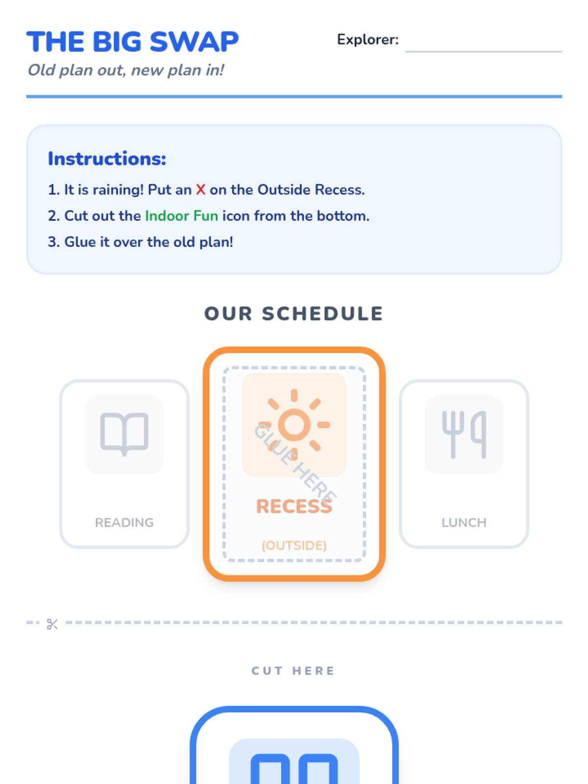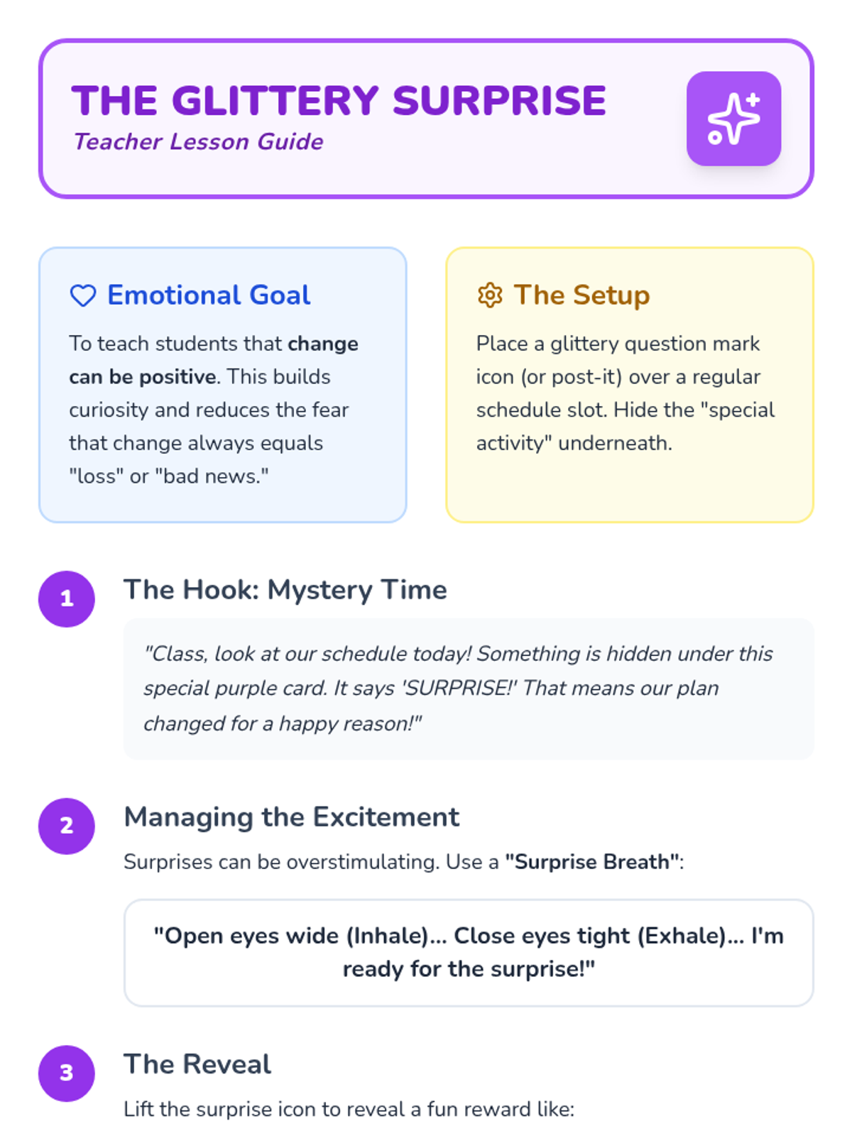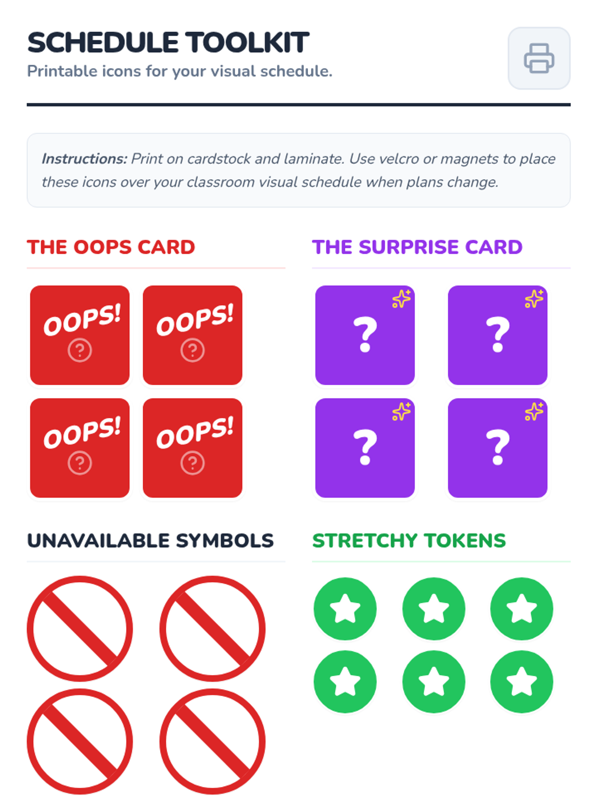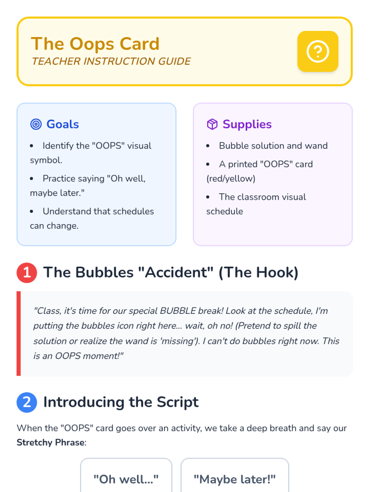 A Kindergarten sequence focused on building cognitive flexibility and emotional regulation when visual schedules change. Students learn to use specific visuals like 'Oops' cards, substitution icons, and 'Surprise' markers to navigate transitions and unexpected events calmly.
