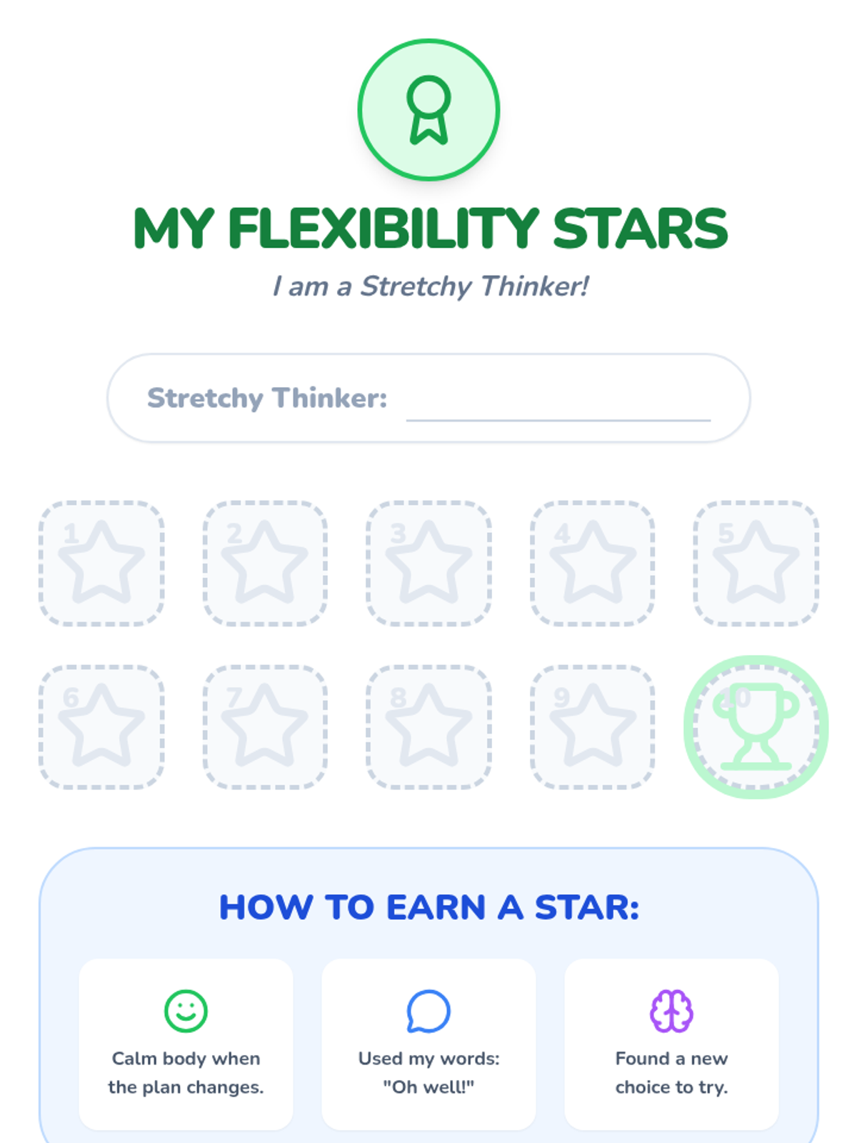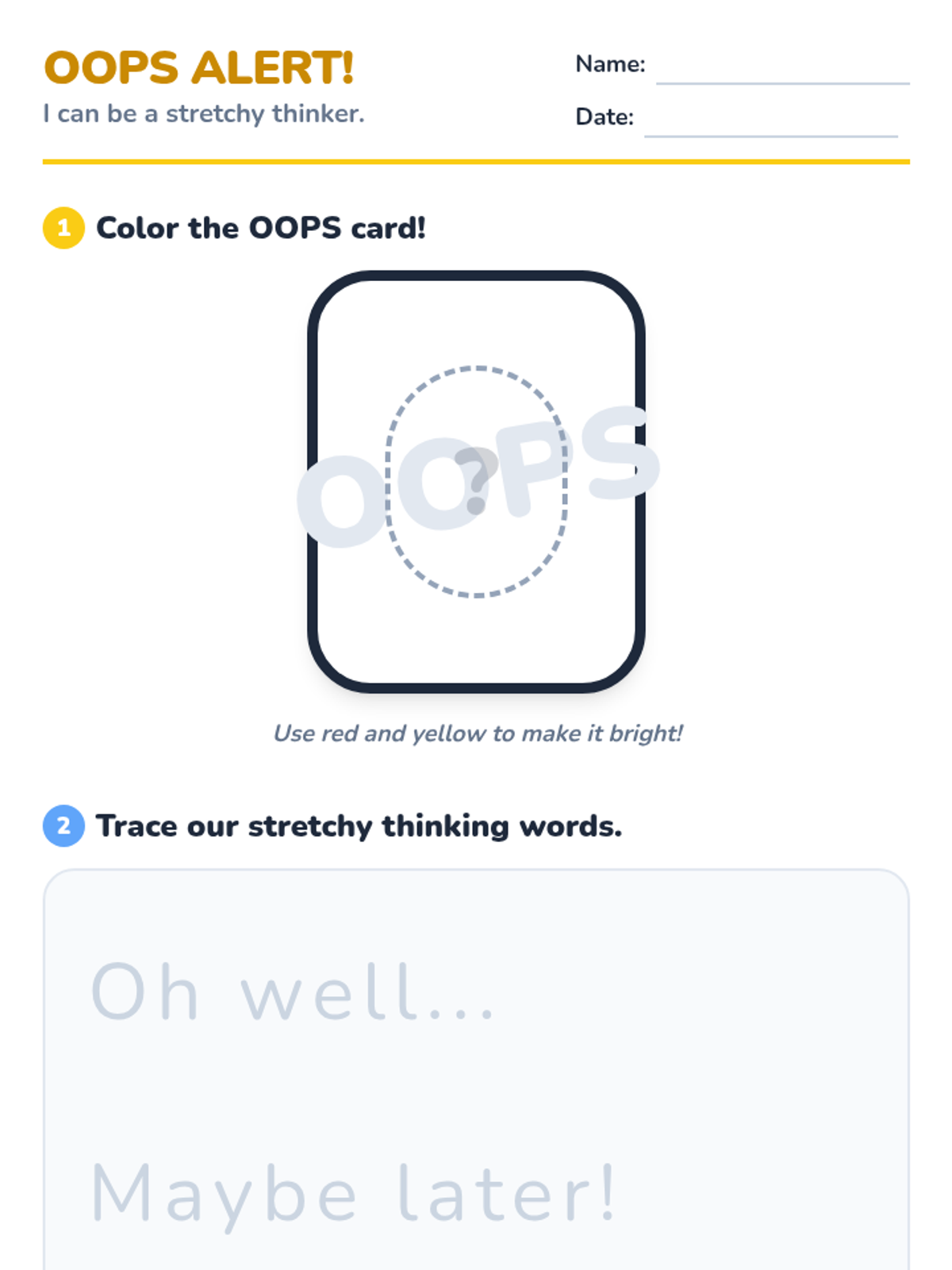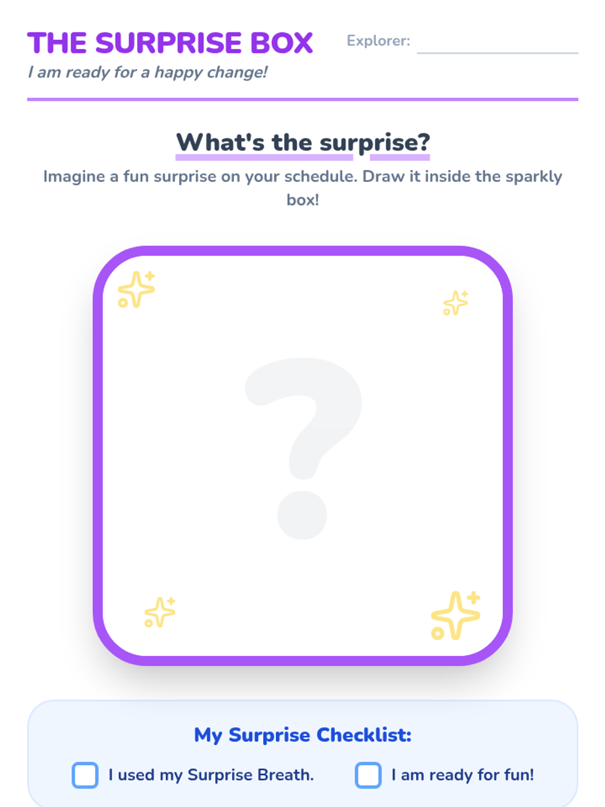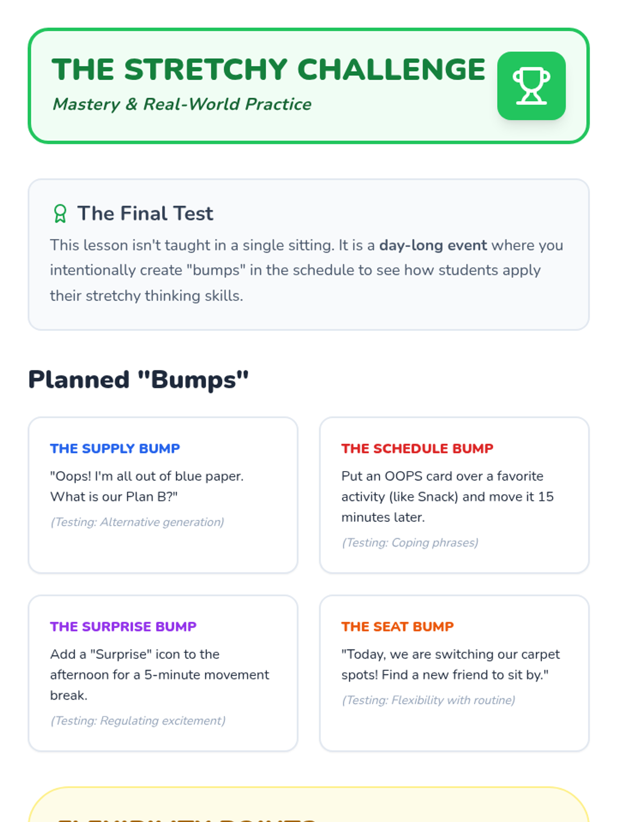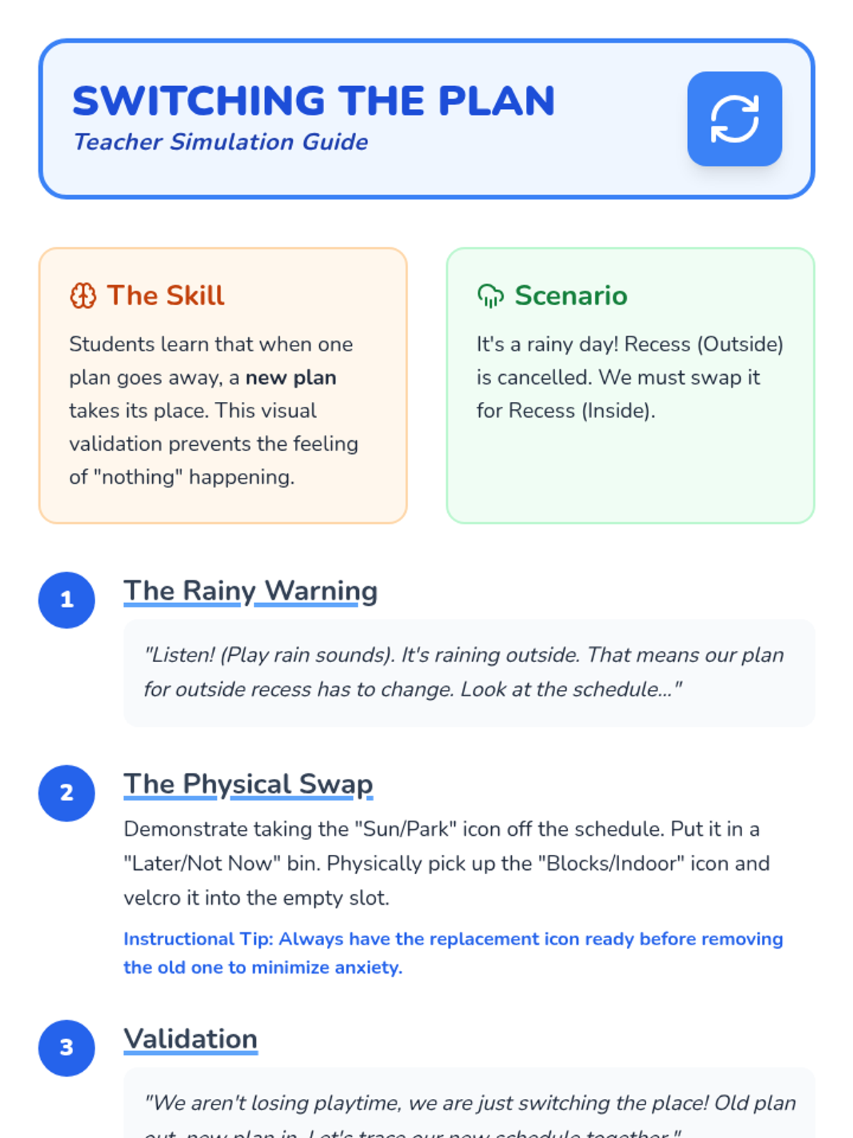 A Kindergarten sequence focused on building cognitive flexibility and emotional regulation when visual schedules change. Students learn to use specific visuals like 'Oops' cards, substitution icons, and 'Surprise' markers to navigate transitions and unexpected events calmly.