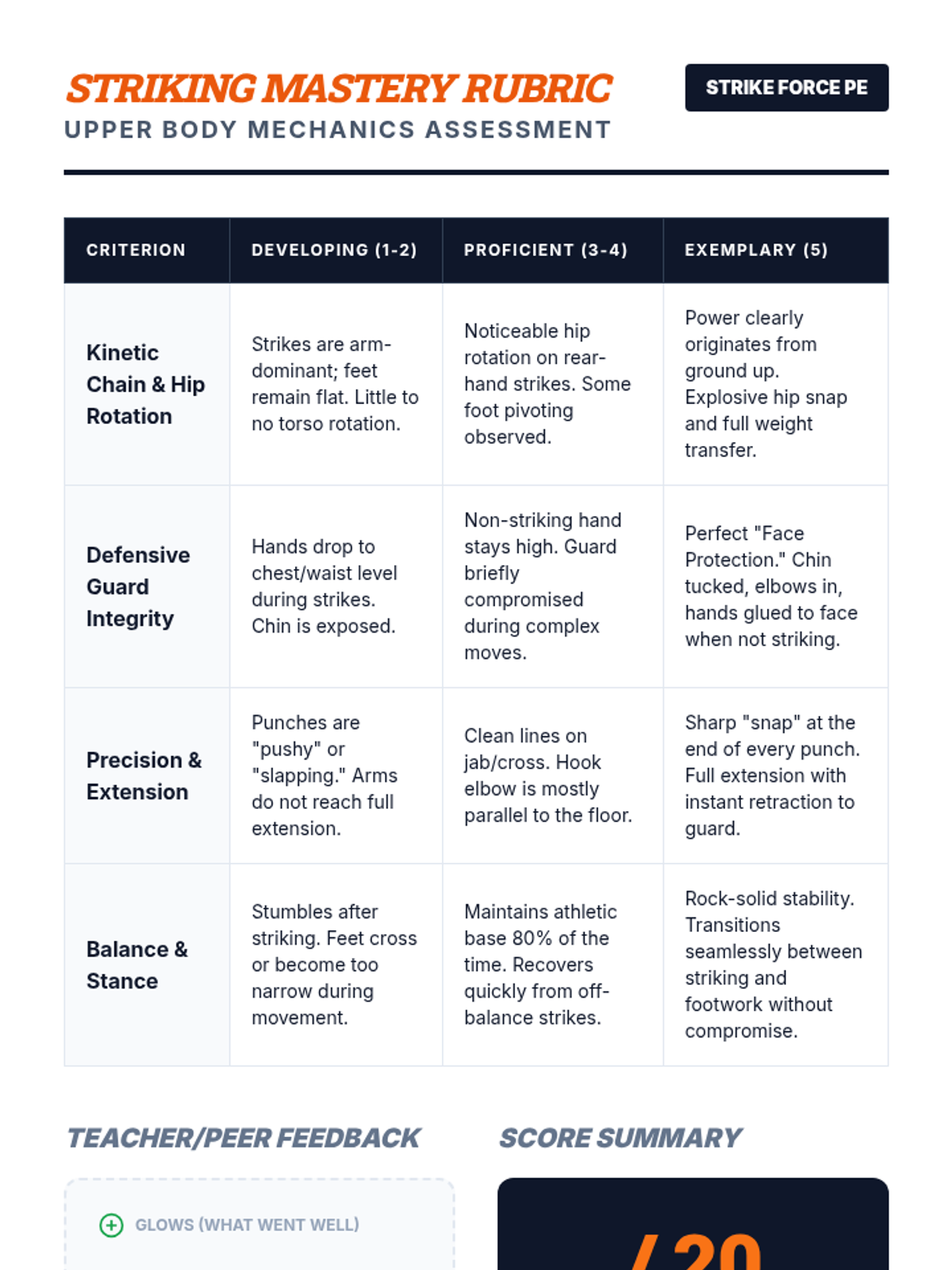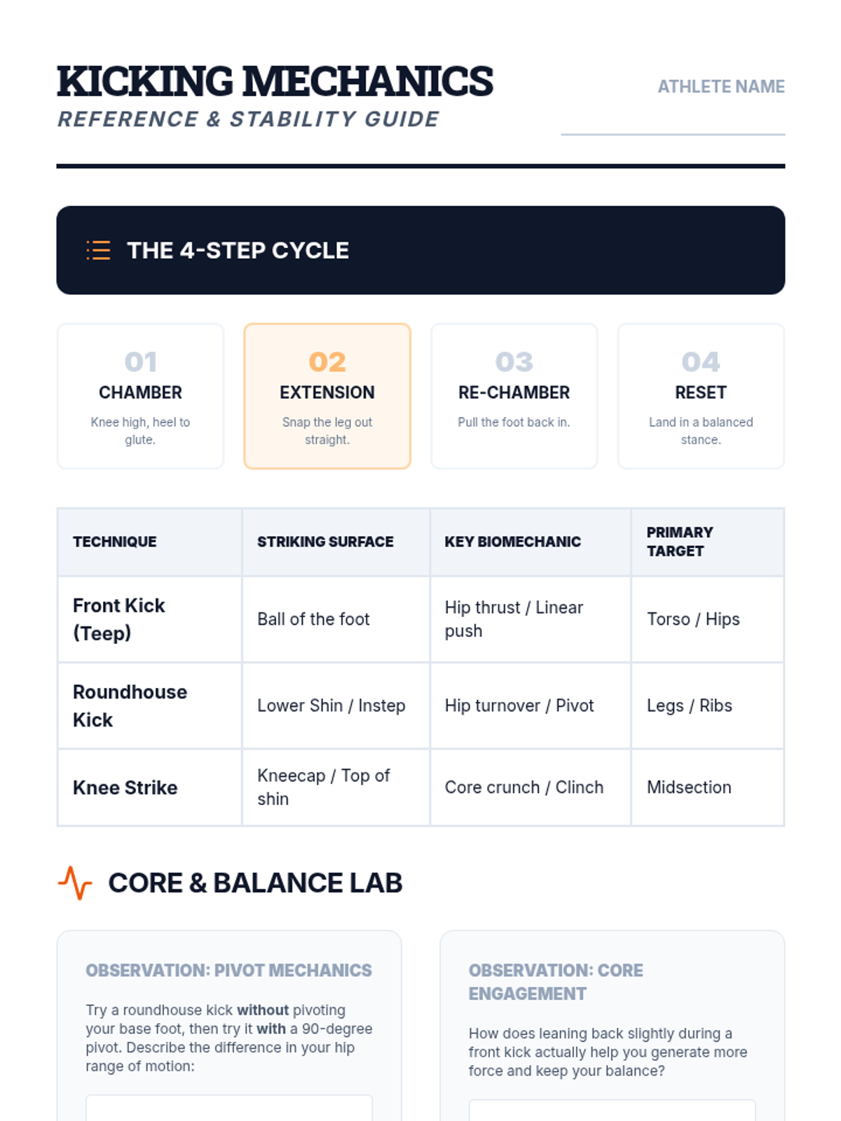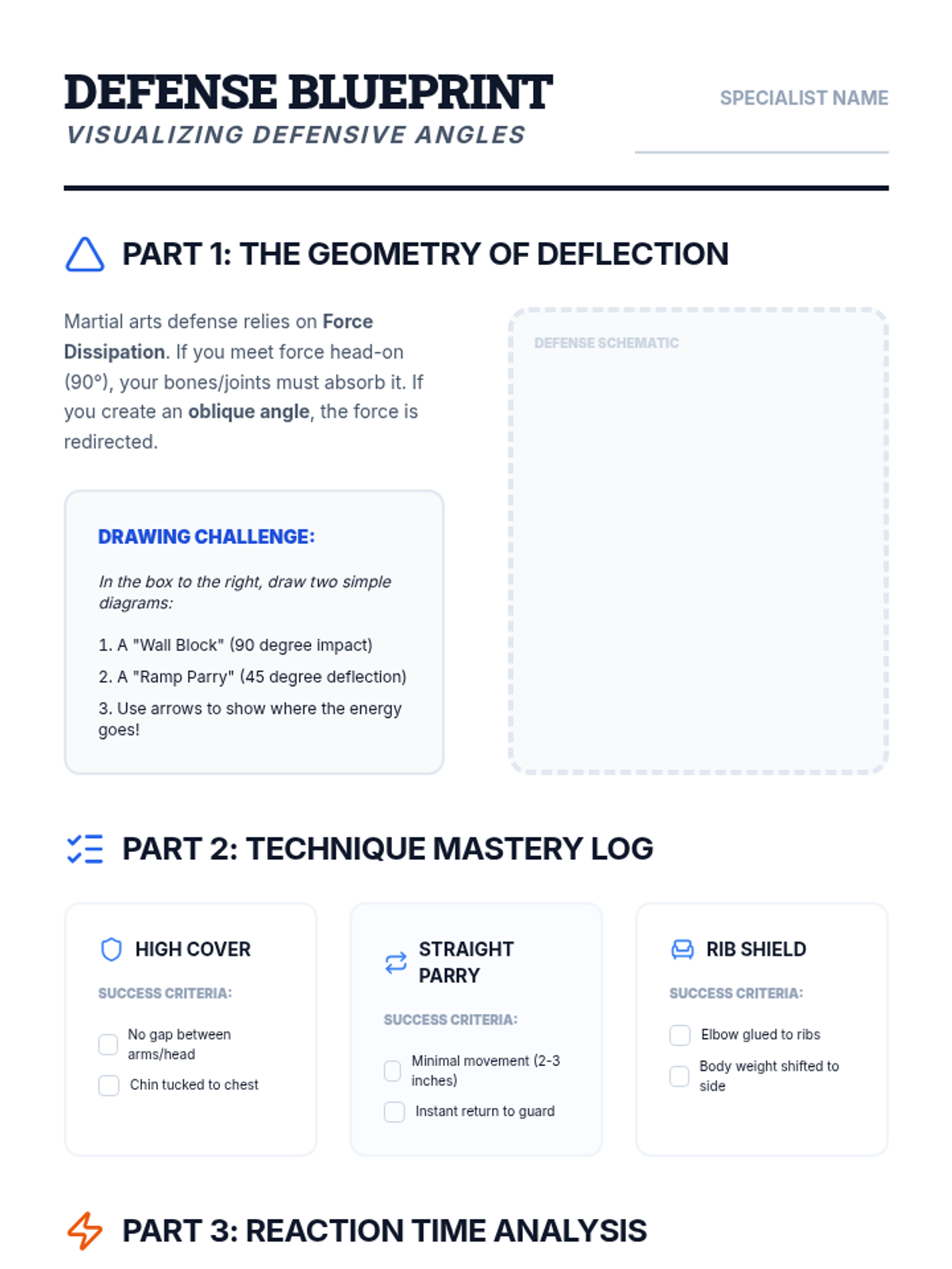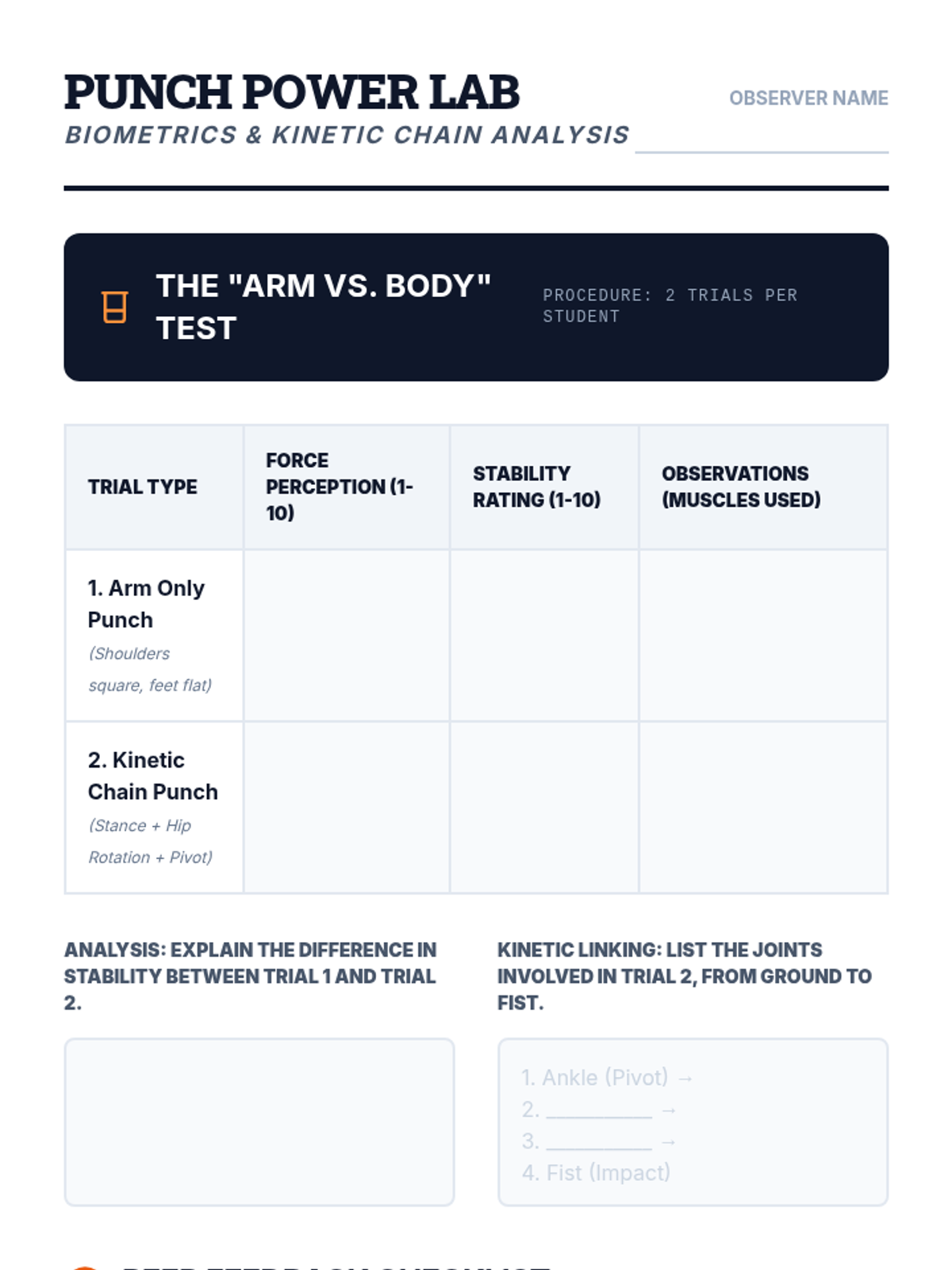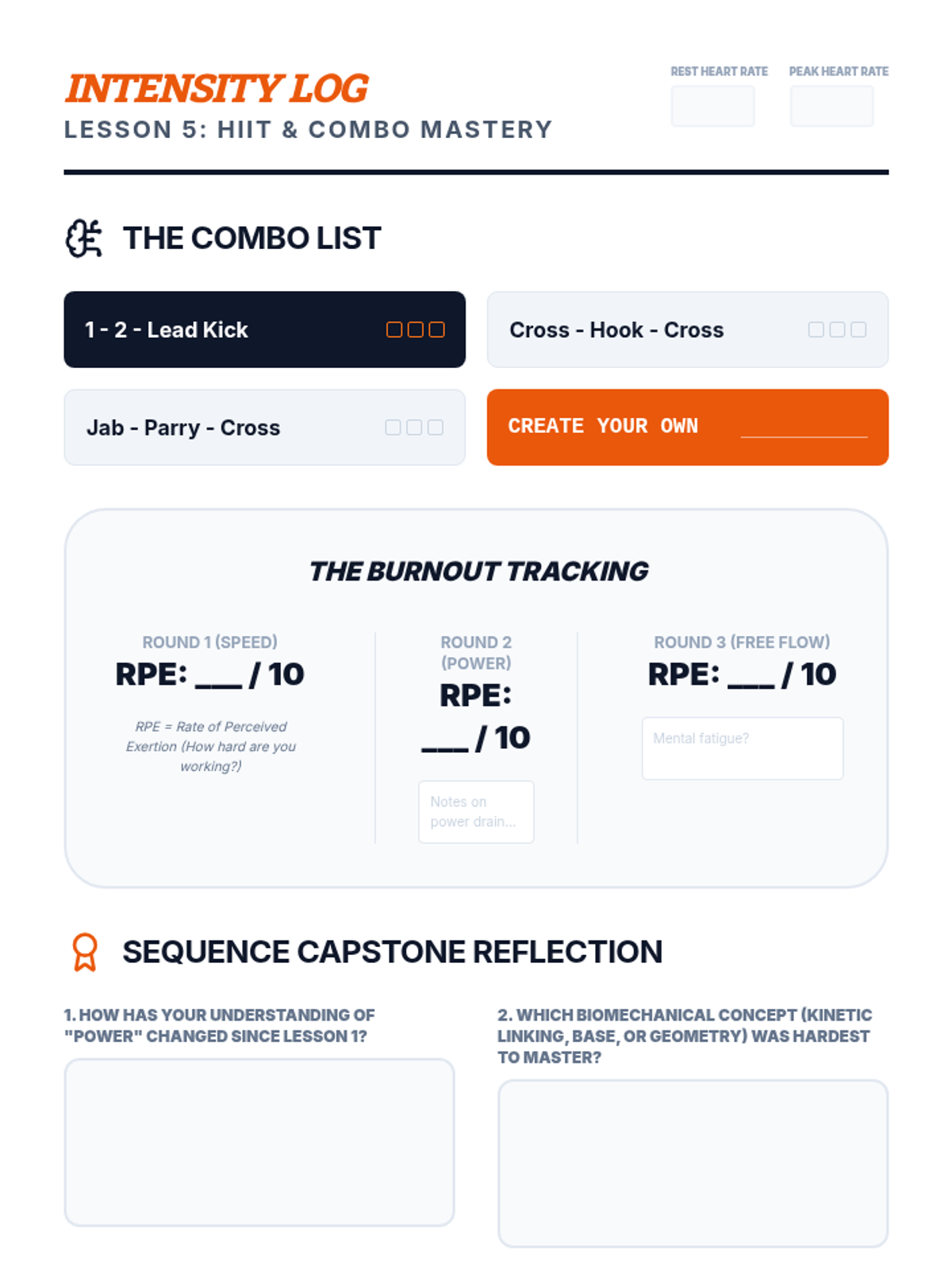 A 5-lesson sequence exploring the biomechanics and physics of martial arts strikes and blocks. Students progress from foundational footwork to complex combinations, focusing on kinetic linking and power generation.