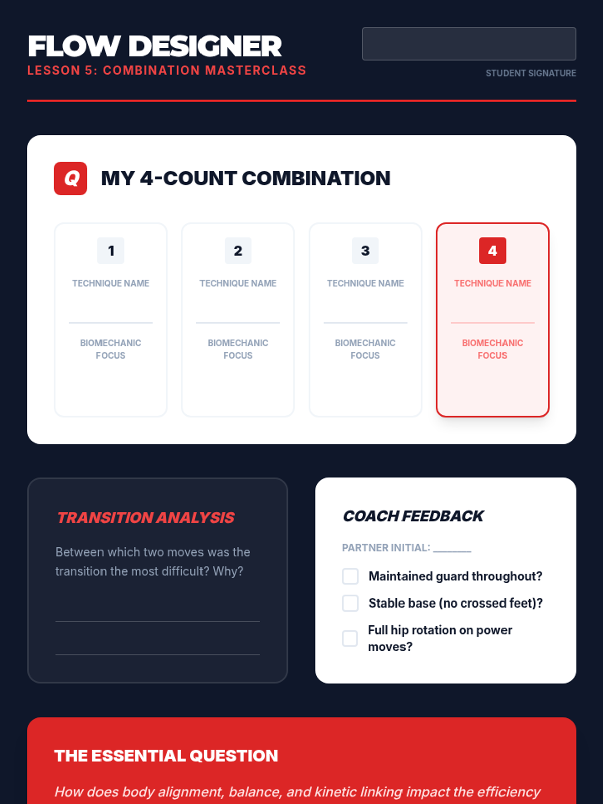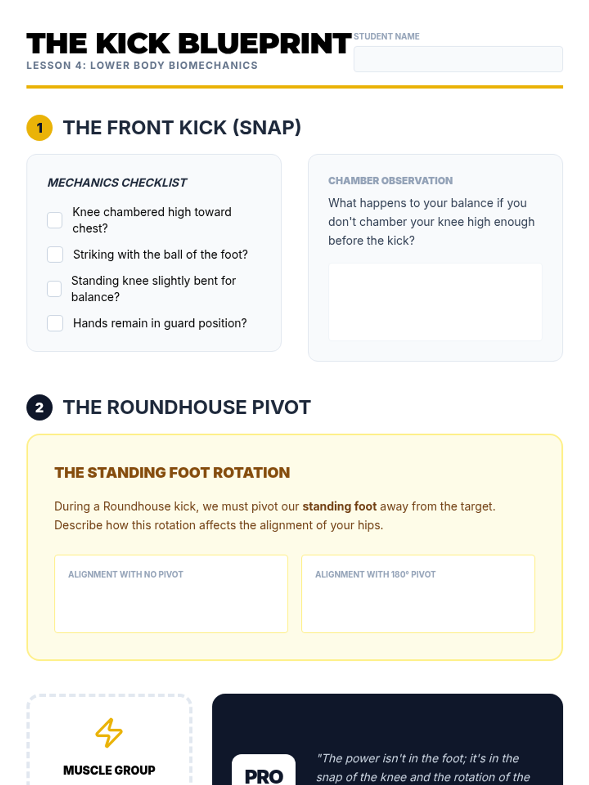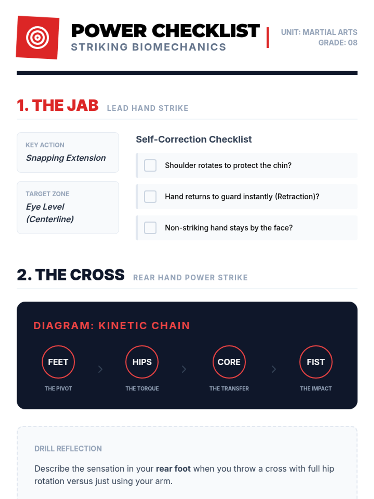 A comprehensive 8th-grade physical education sequence focusing on the biomechanics of martial arts striking and blocking. Students explore kinetic linking, balance, and precision through five progressive lessons.