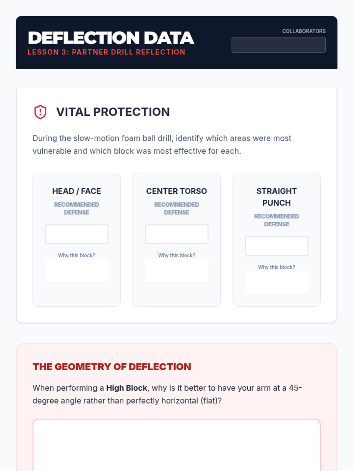 This sequence shifts focus from physical combat to the mental and verbal aspects of self-defense, prioritizing conflict avoidance. Students learn threat assessment, assertive communication, and environmental scanning through Cooper's Color Code and role-playing scenarios.