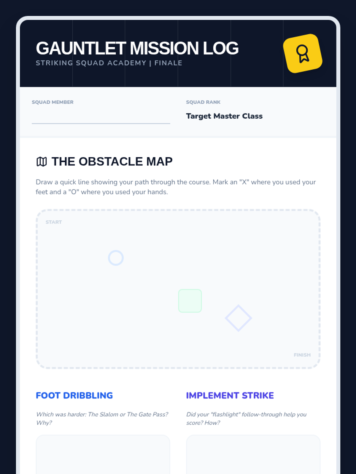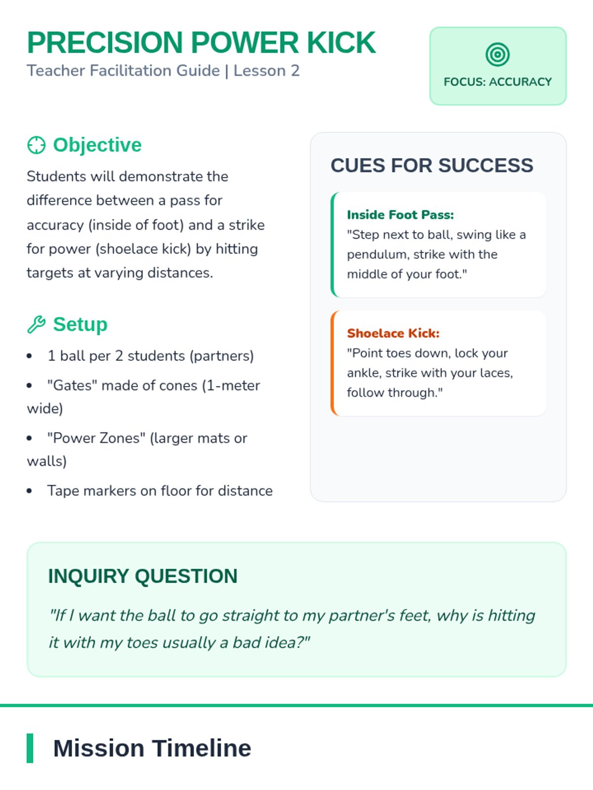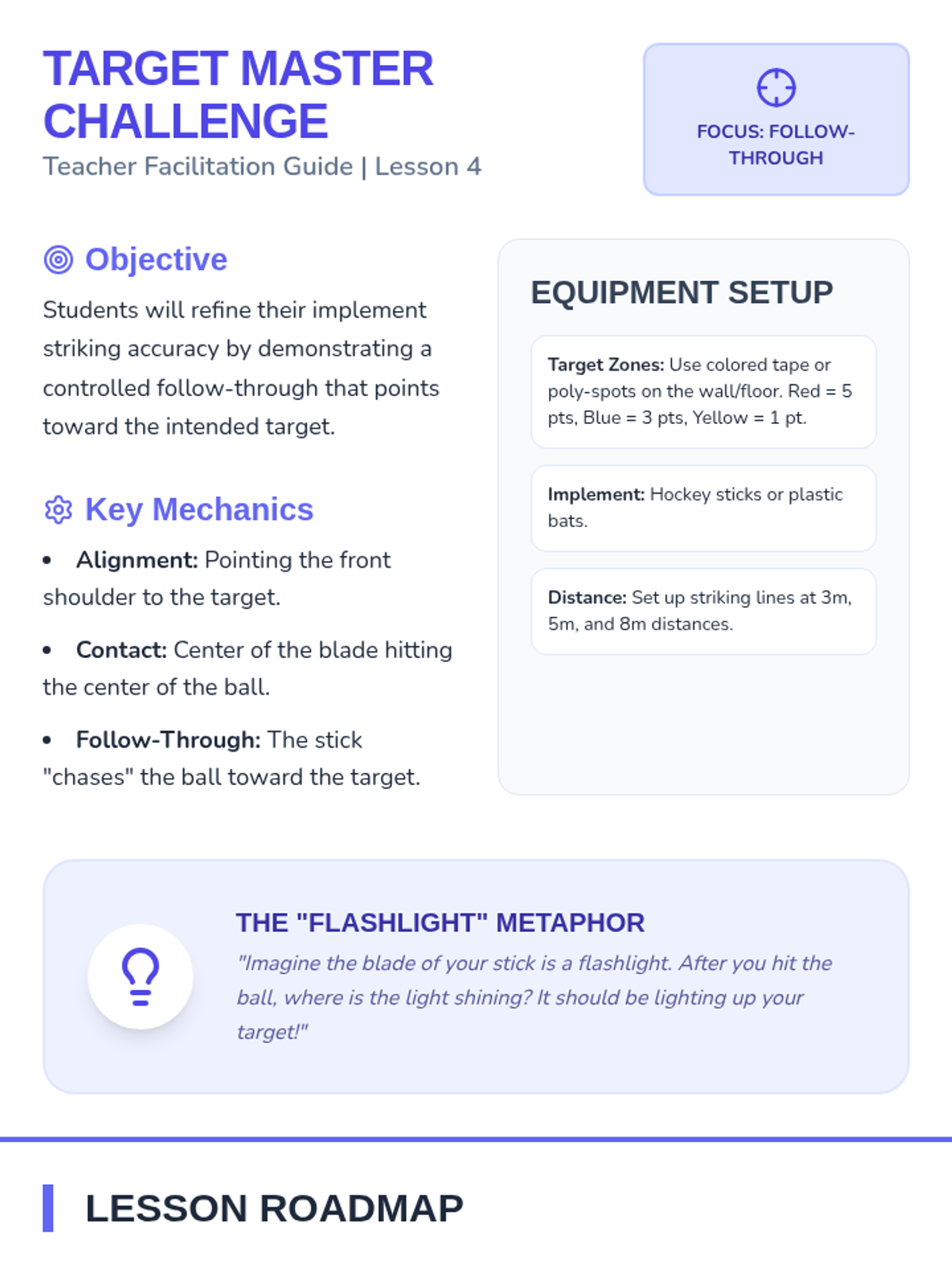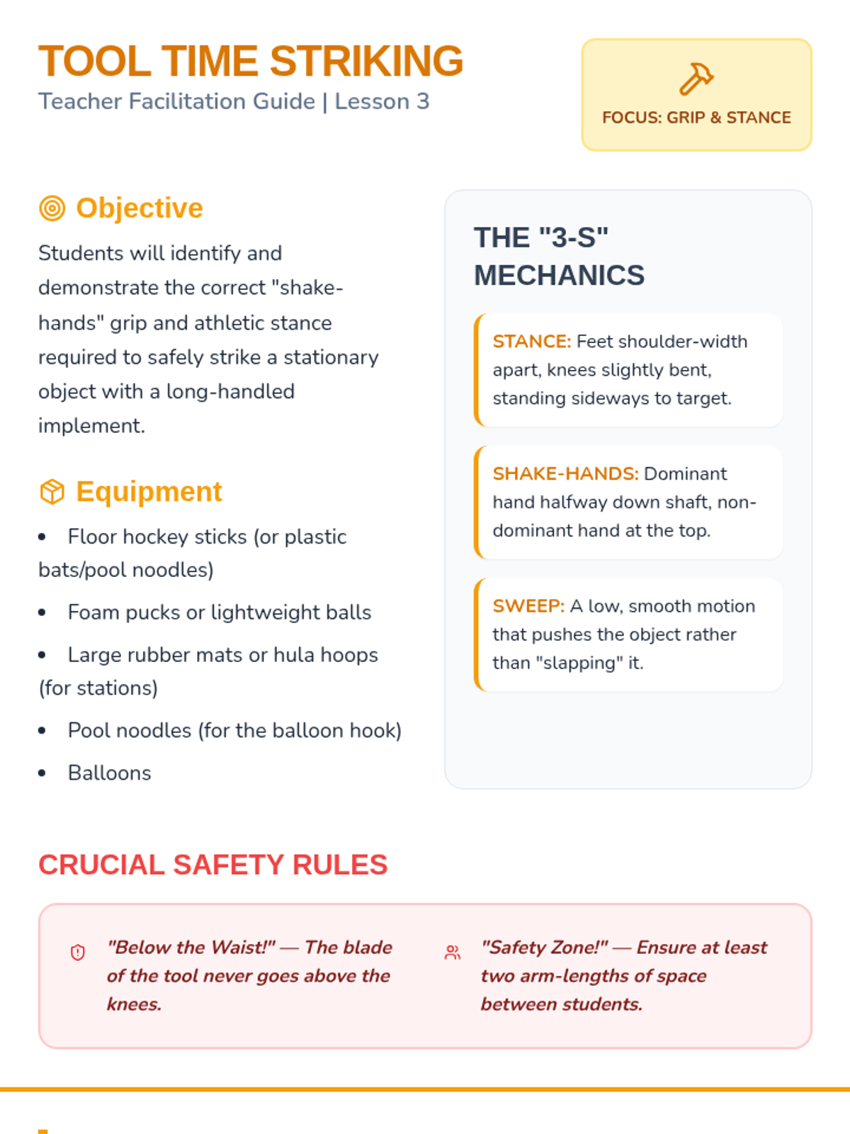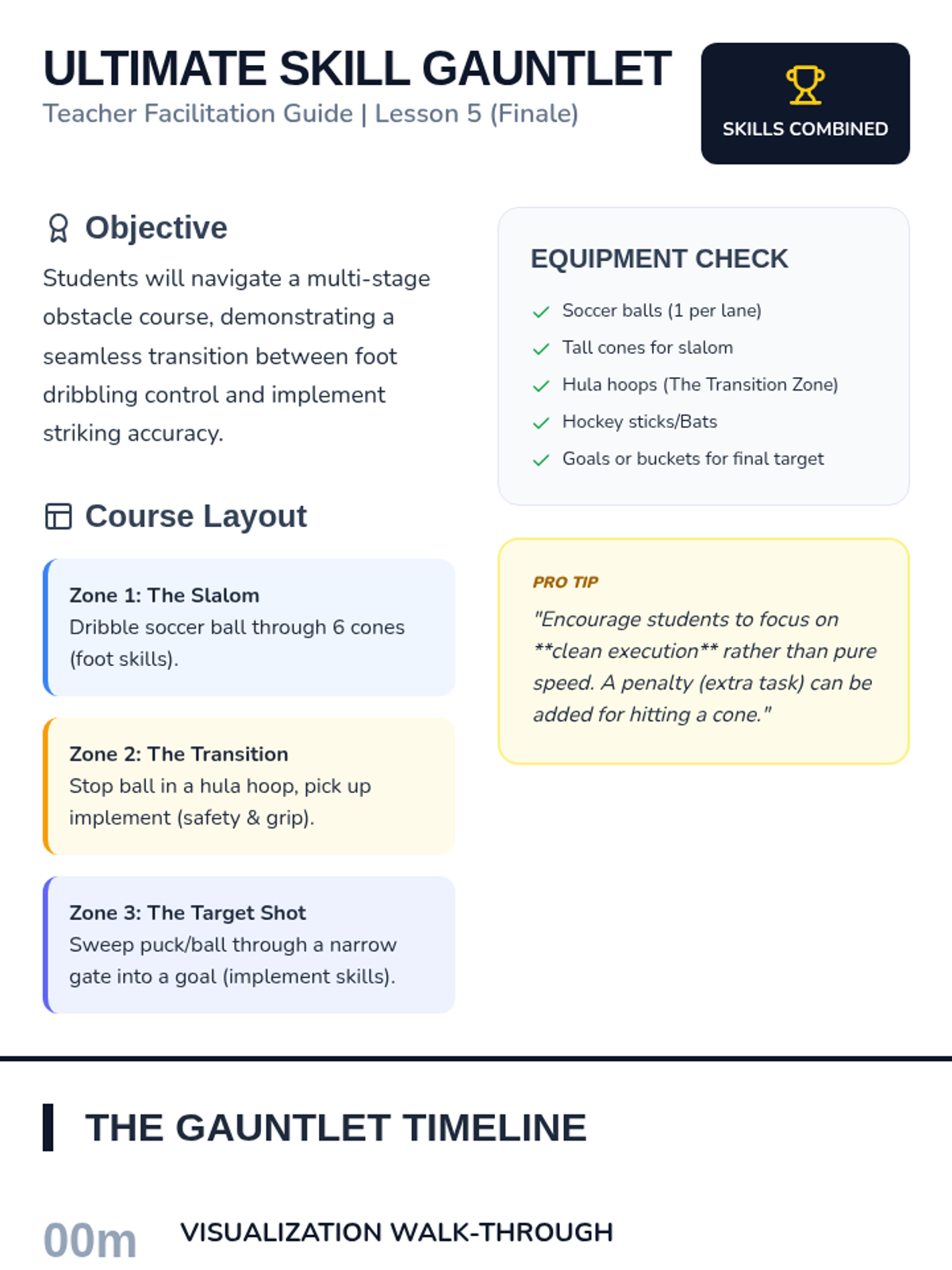 A comprehensive 5-lesson sequence for 3rd-grade students focused on manipulative skills, specifically kicking and striking with implements. Students progress from basic foot control to complex implement striking and accuracy, ending in a combined obstacle course.