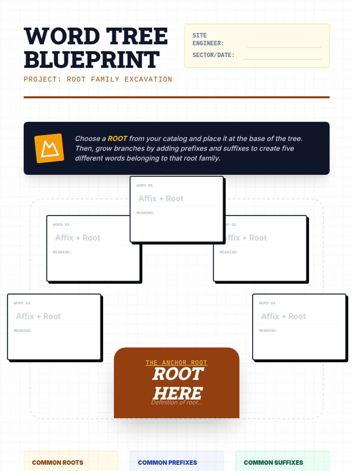 A comprehensive sequence for 6th-grade students exploring word morphology through an architectural lens. Students learn to dismantle and assemble words using prefixes, roots, and suffixes to unlock meaning and grammatical function.