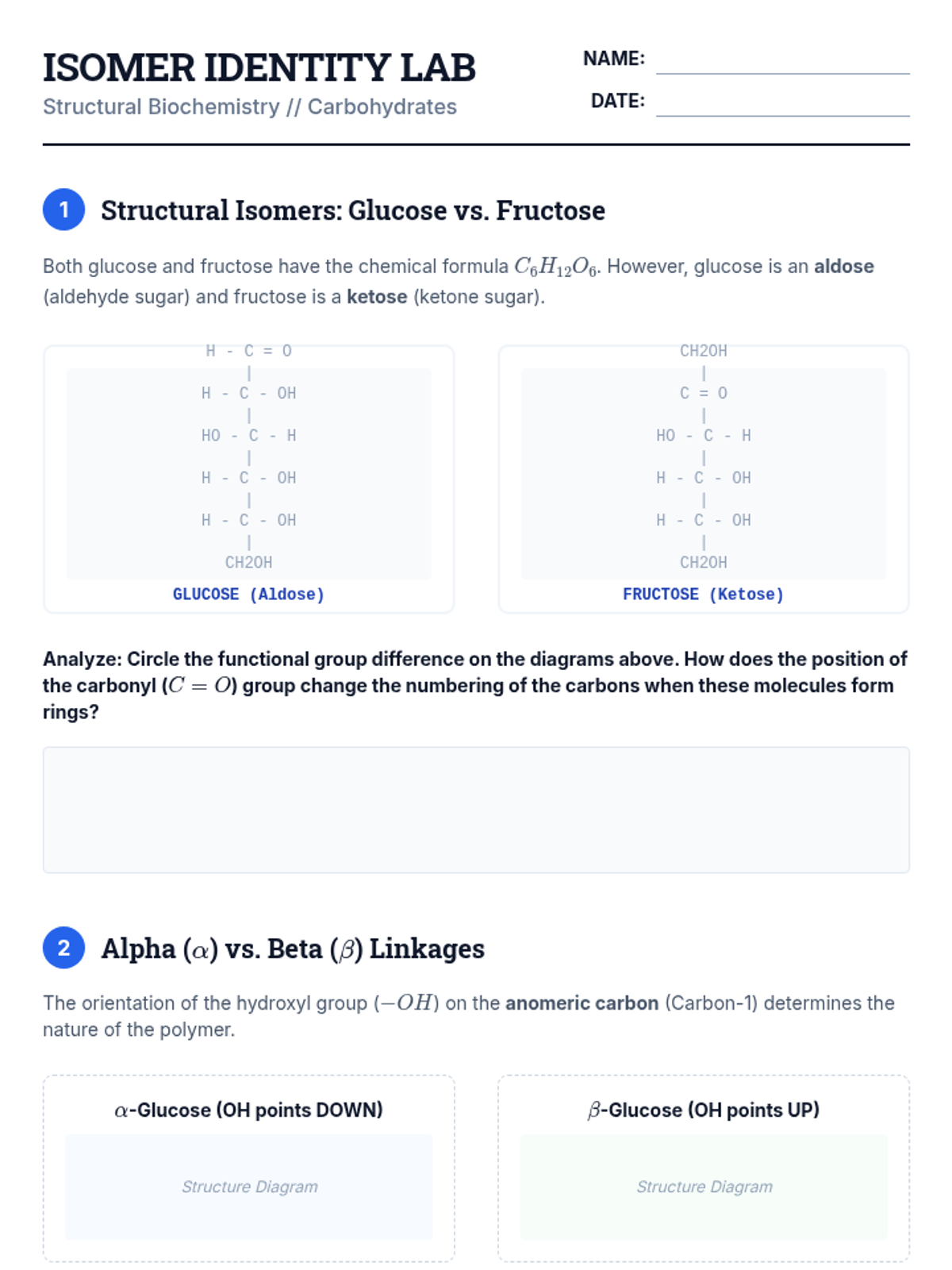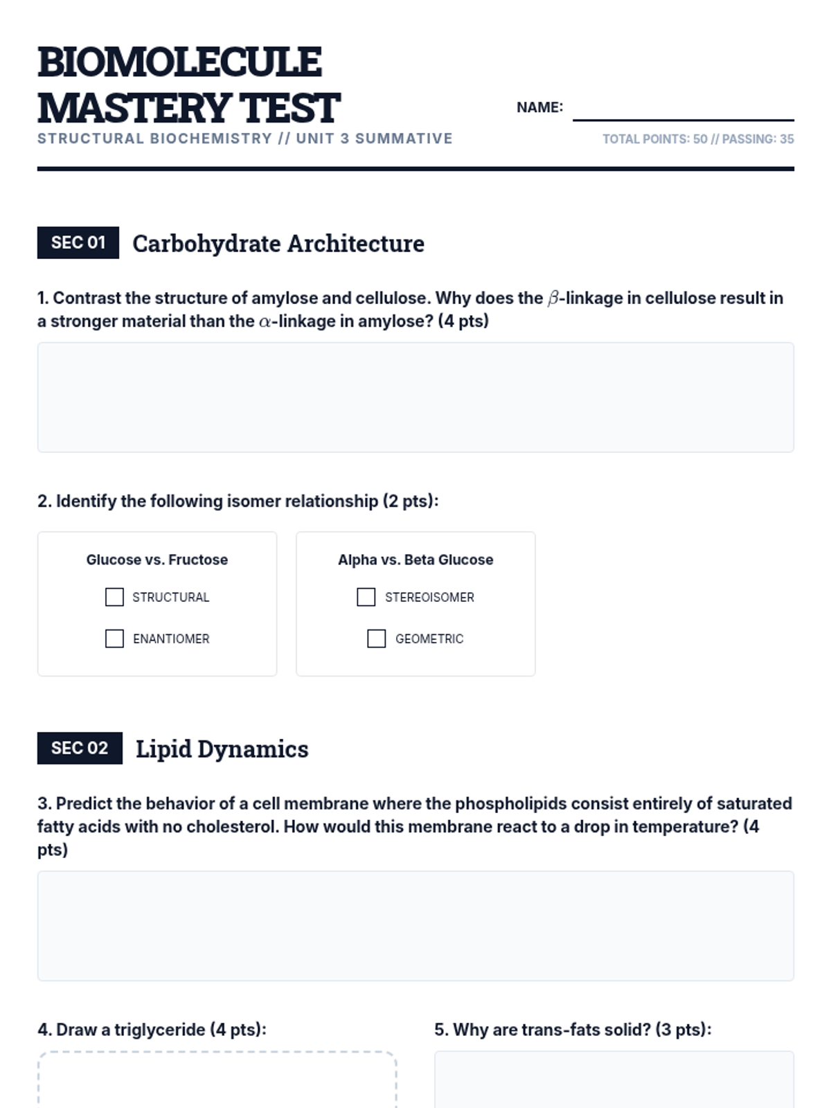 A comprehensive 12th-grade biology unit exploring the structural biochemistry of carbohydrates and lipids. Students analyze molecular structures, isomeric forms, and chemical mechanisms to understand how these macromolecules function in energy storage and cellular structure.