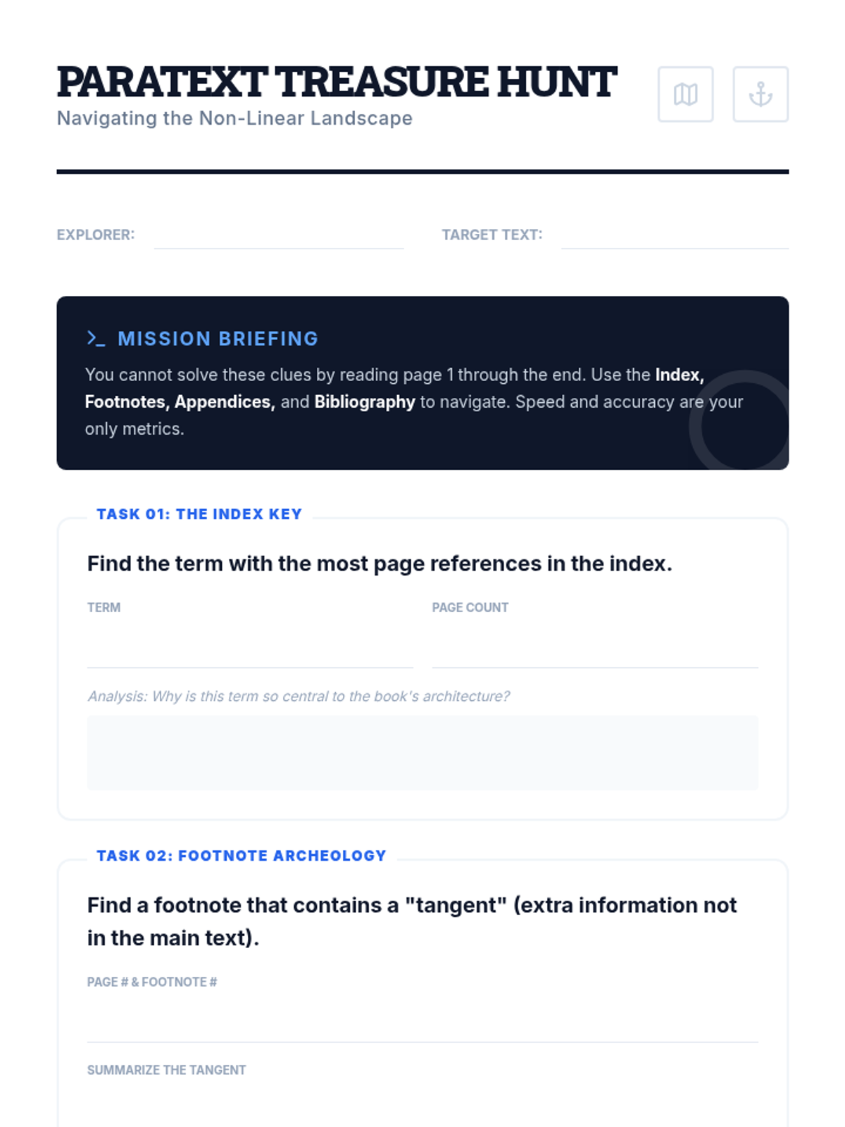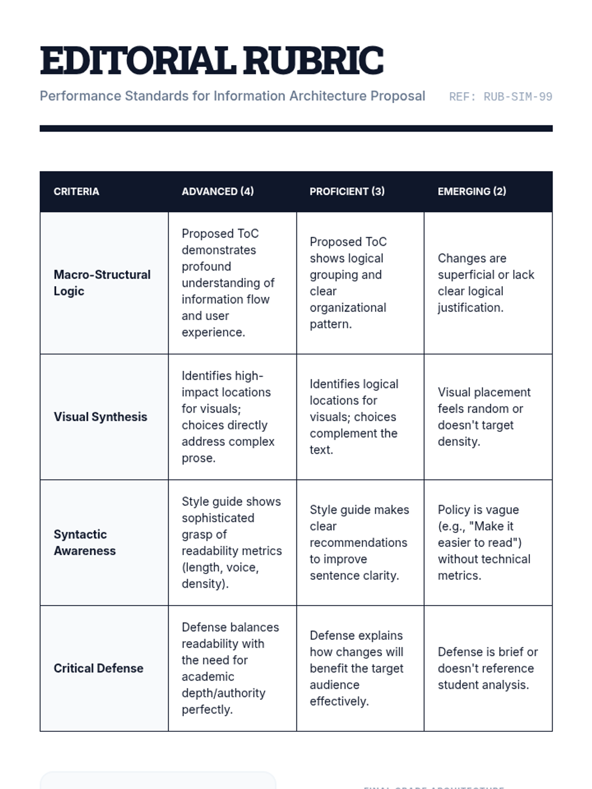 This sequence explores the technical and structural organization of nonfiction texts. Students act as professional editors, analyzing table of contents, paratextual features like footnotes, data visualizations, and syntactic complexity to understand how information architecture influences readability and impact.