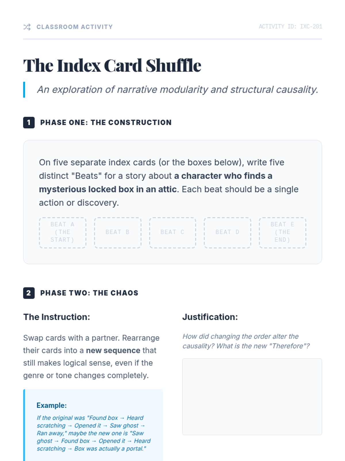 This project-based sequence guides students through the structural engineering of a narrative, moving from a raw premise to a developed one-act play. Students analyze the dramatic arc and apply these concepts to their own original scripts, focusing on pacing, high-stakes storytelling, and professional formatting.