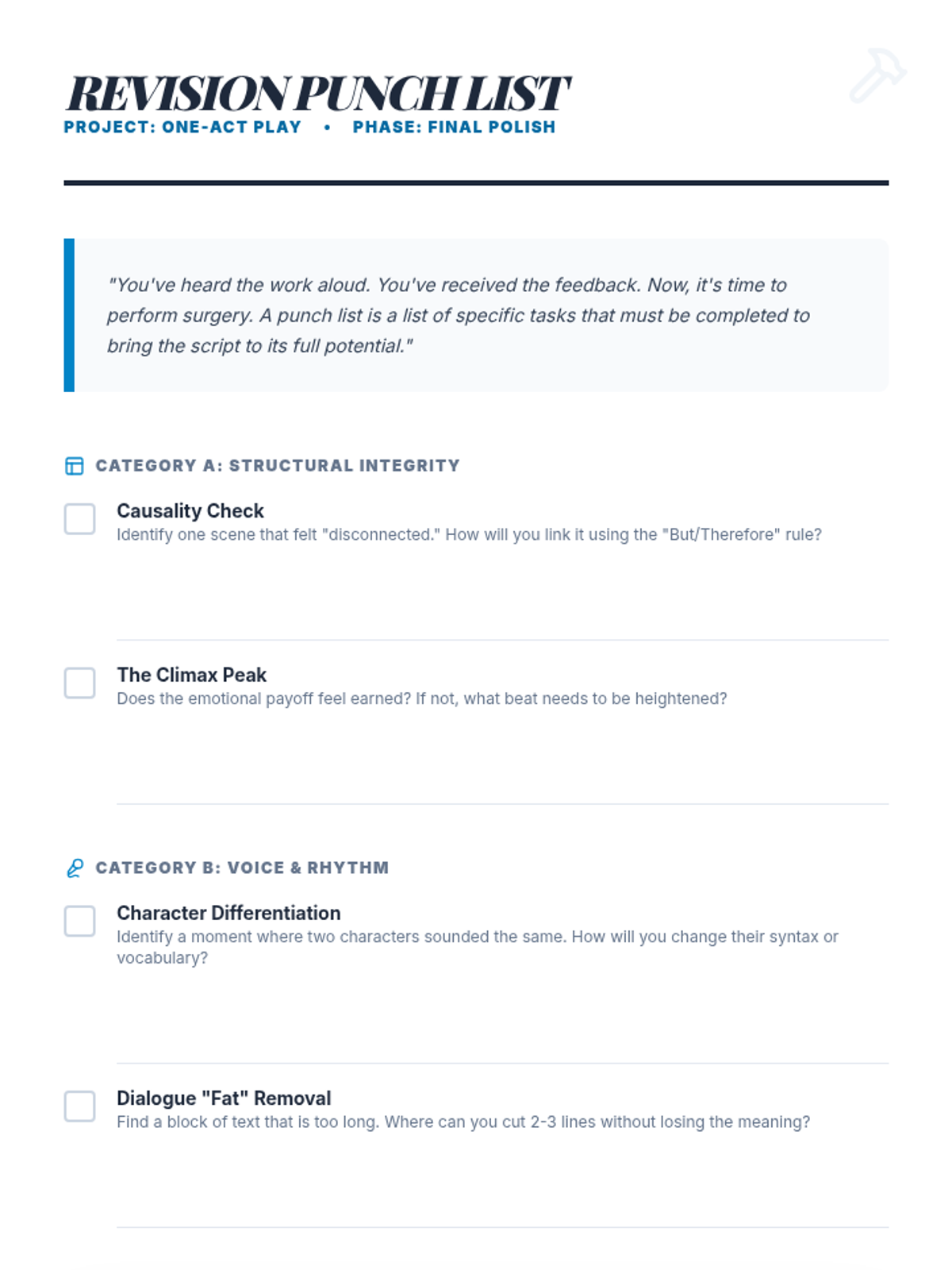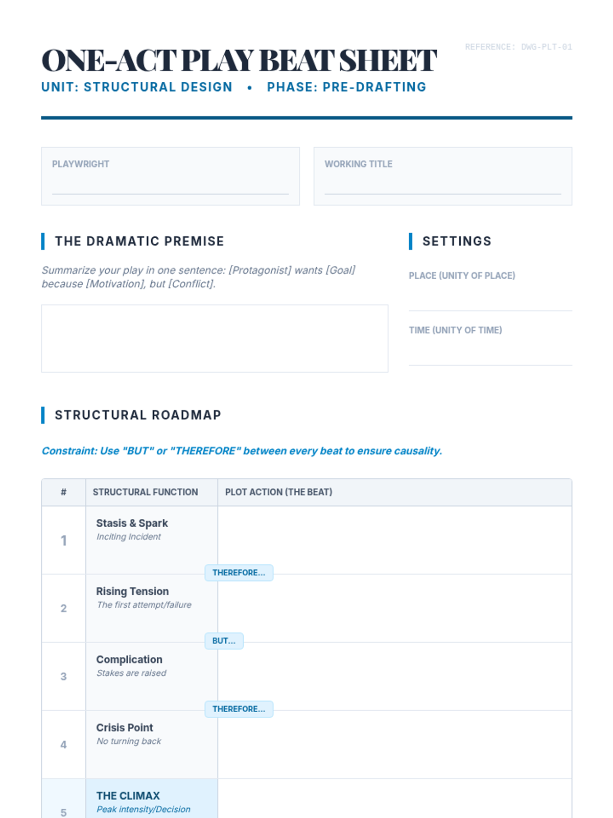 A comprehensive 12th-grade theater arts sequence focused on the structural engineering of dramatic writing. Students transition from structural analysis to drafting and revising an original one-act play through a professional workshop model.