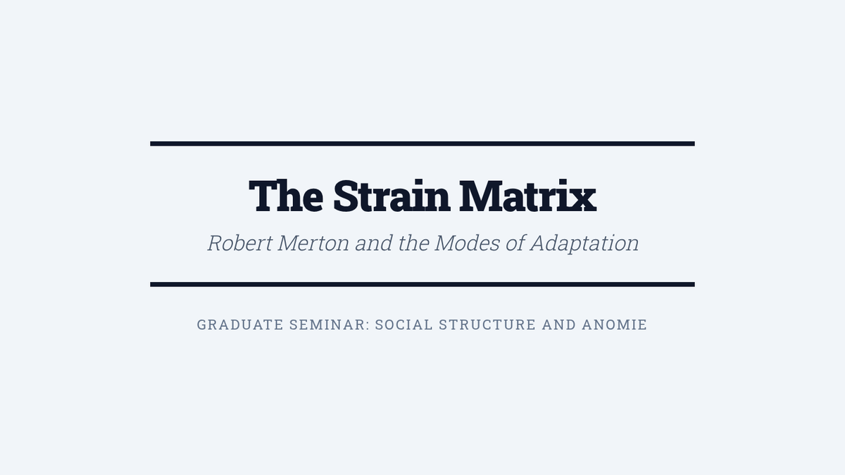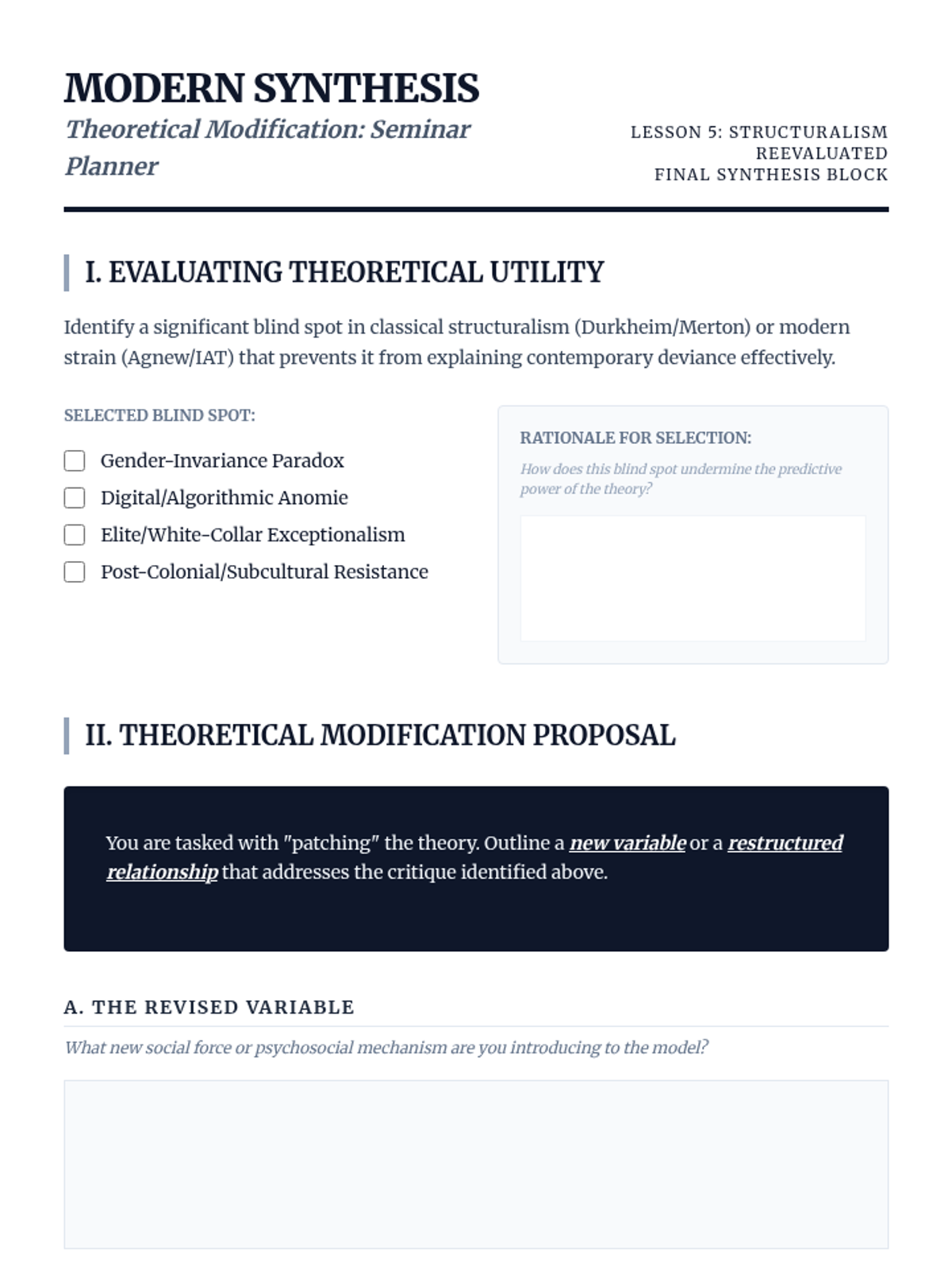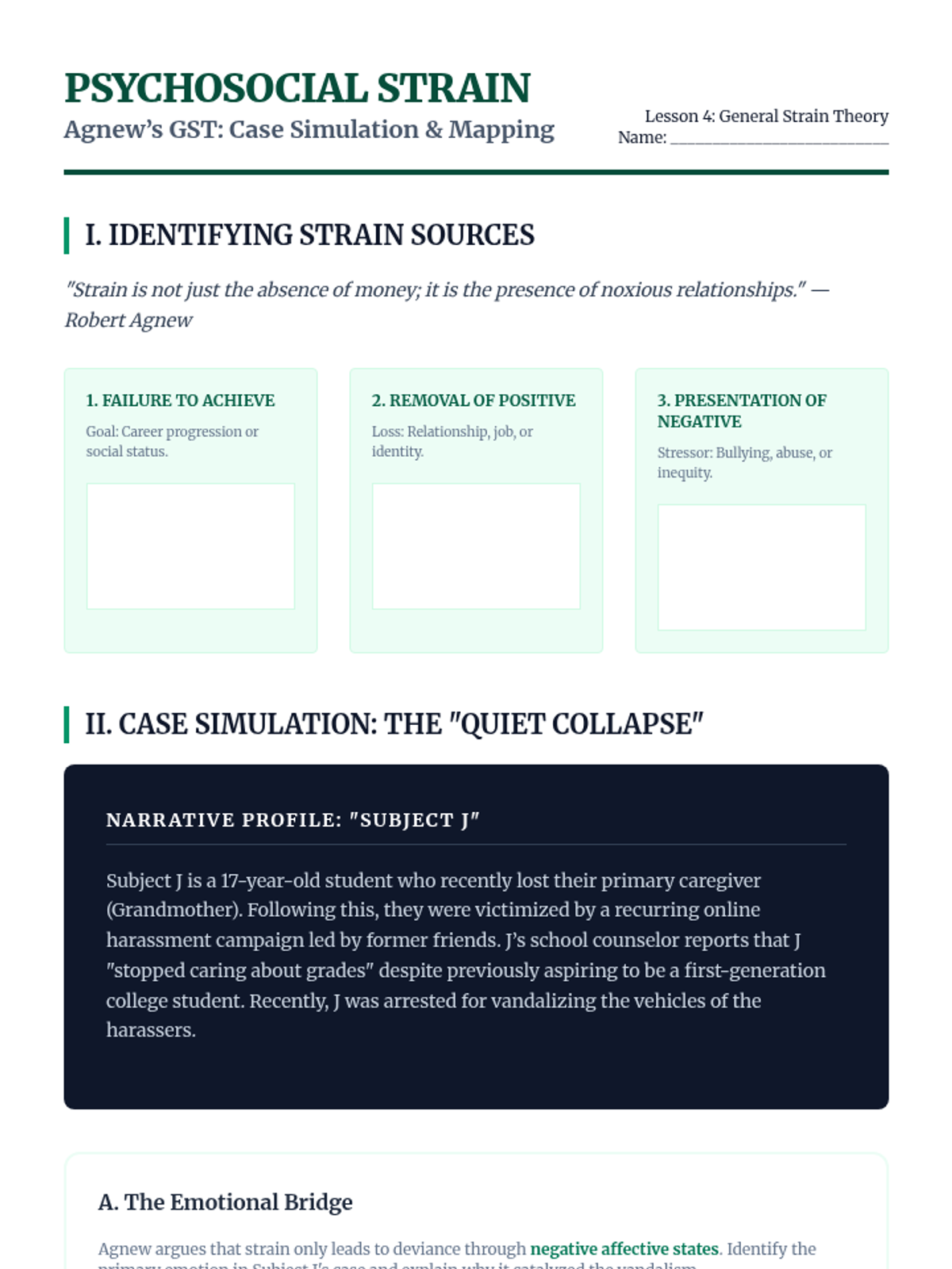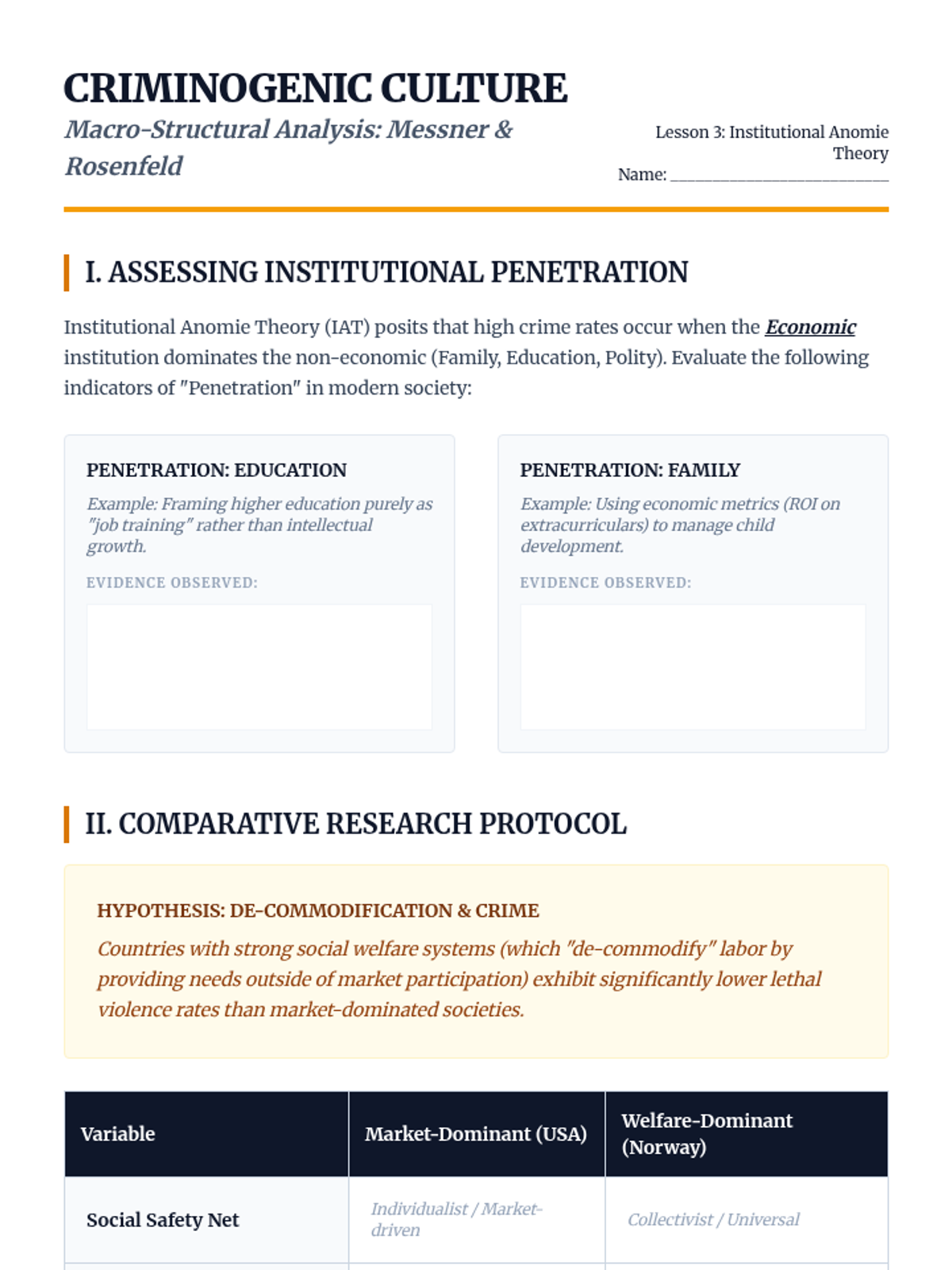 This graduate-level sequence explores the structural-functionalist roots of deviance, examining how societal organization influences nonconformity from Durkheim's anomie to Agnew's General Strain Theory. Students engage in high-level theoretical synthesis and critical evaluation of macro-social pressures.