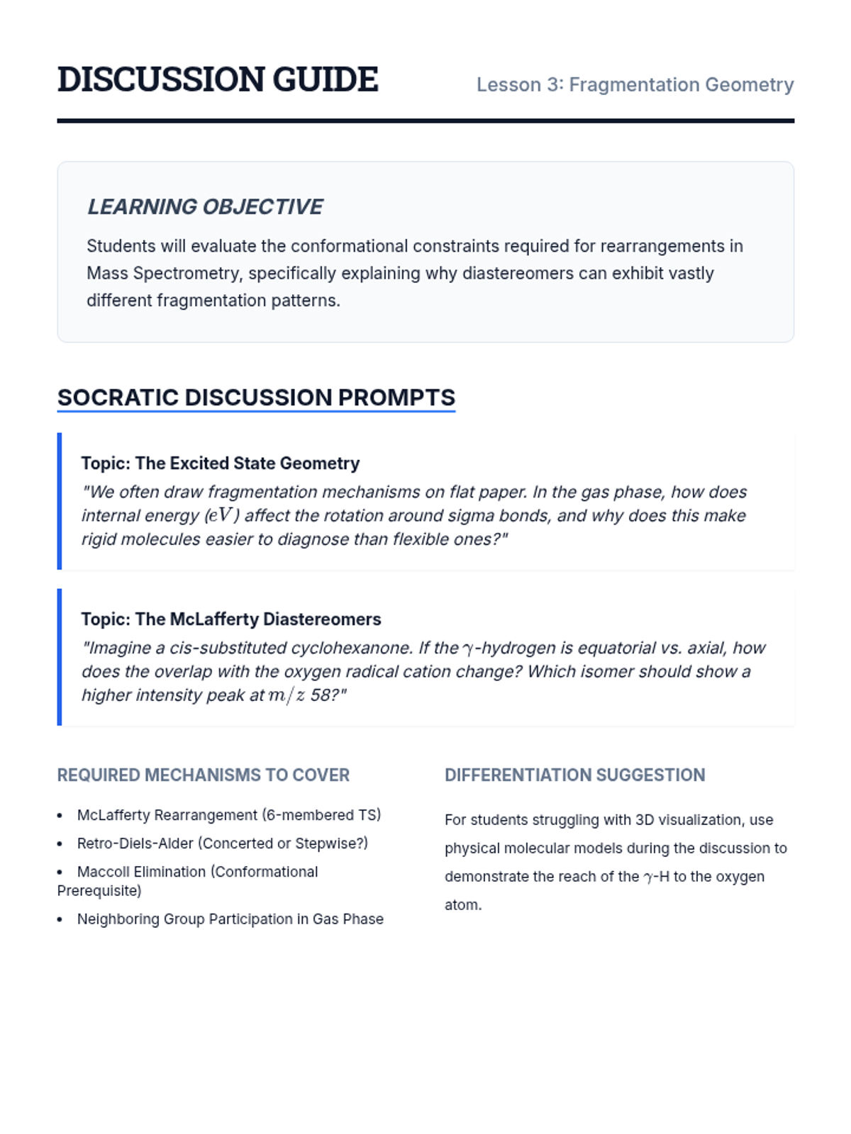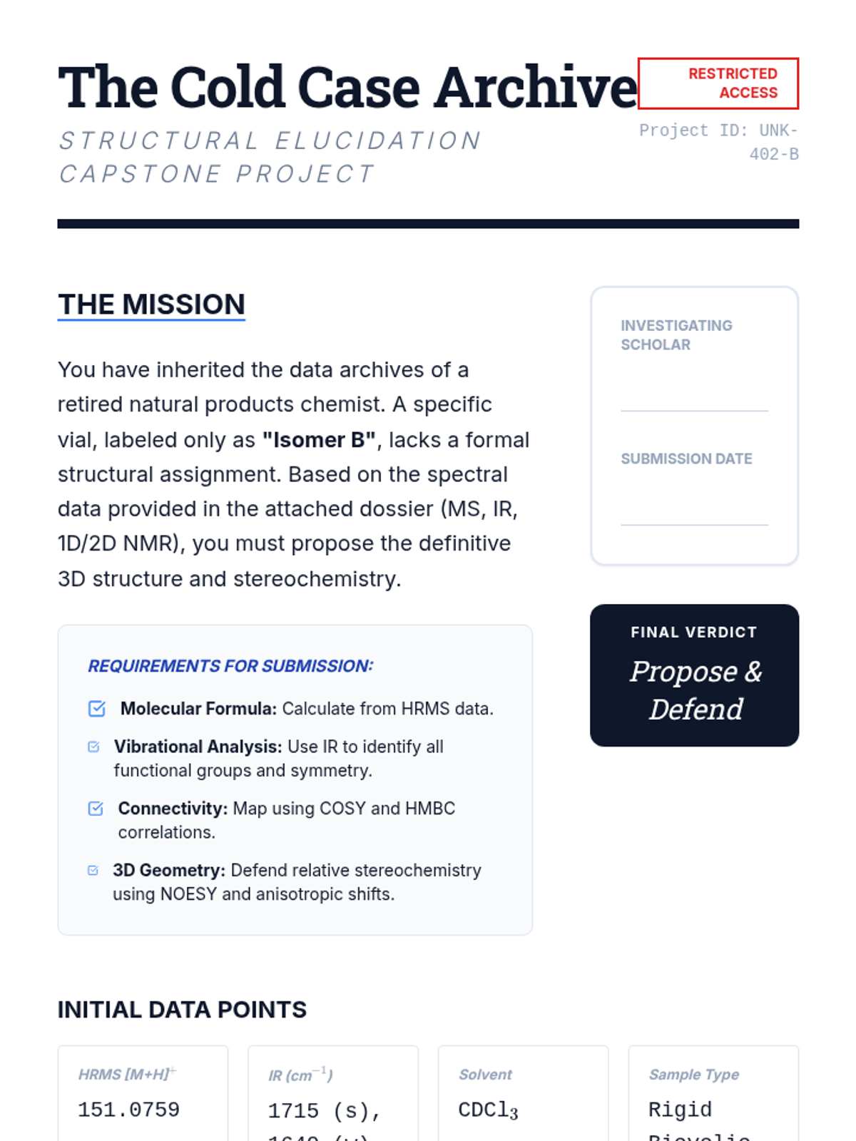 This graduate-level sequence focuses on the application of symmetry selection rules, 2D NMR techniques (NOE), and fragmentation mechanisms to determine the 3D structure and stereochemistry of complex molecules. Students move beyond basic spectral interpretation to synthesize data from multiple spectroscopic platforms to defend molecular geometry.