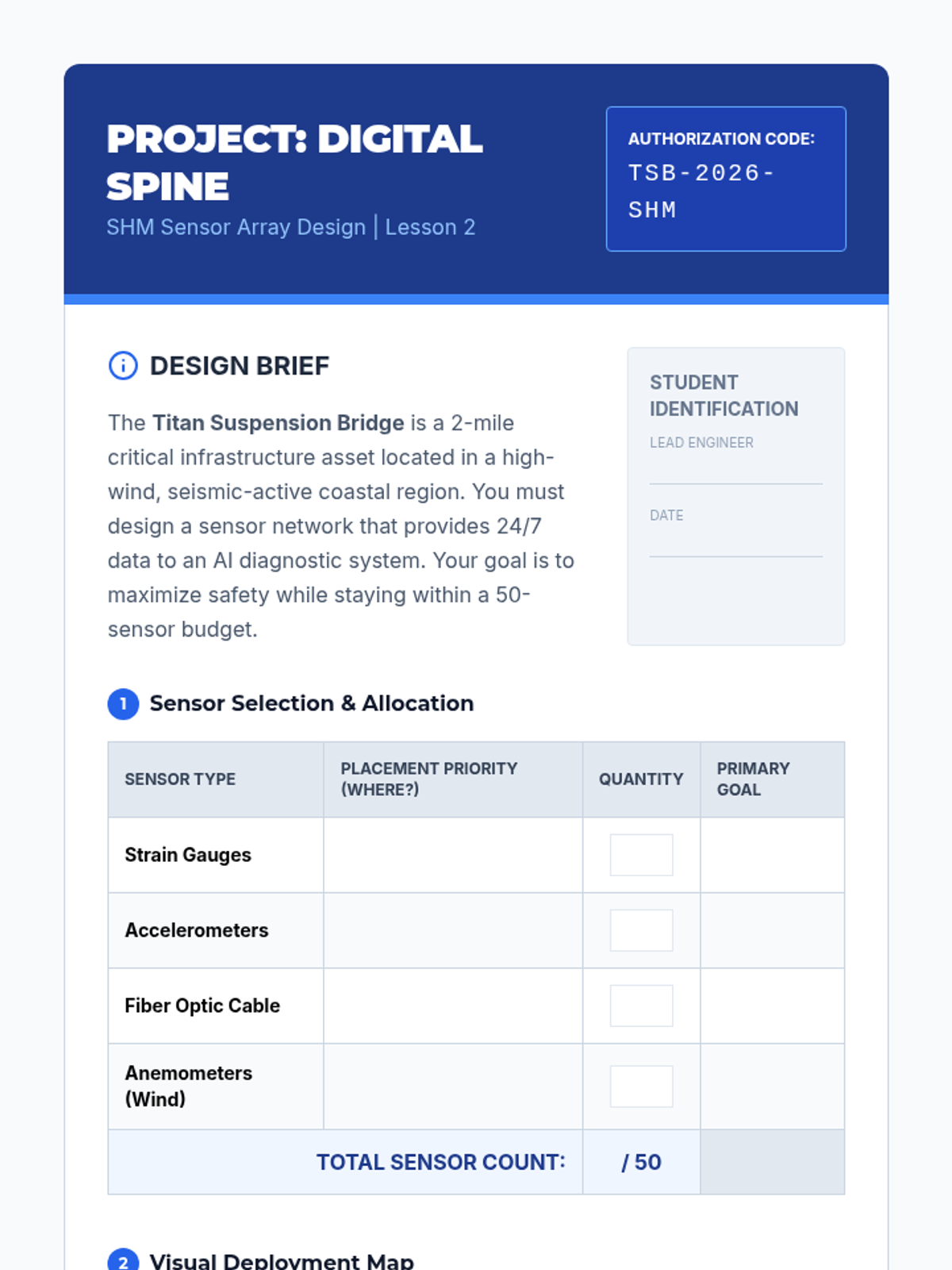 This sequence explores how AI and IoT technologies are revolutionizing structural engineering by shifting from reactive to proactive safety measures. Students analyze historical failures, learn sensor integration, explore computer vision for defect detection, and debate the ethical implications of AI-driven safety systems.