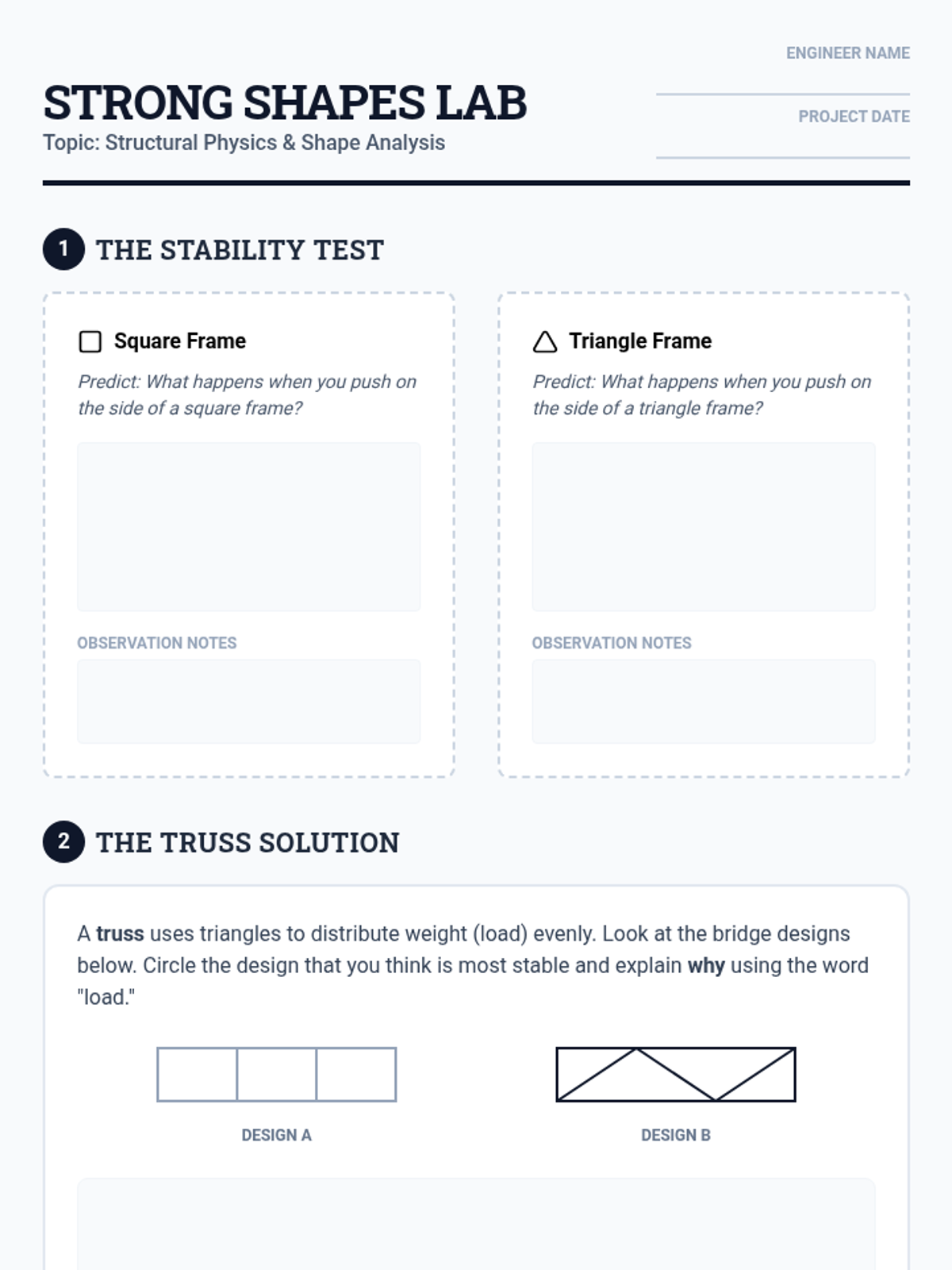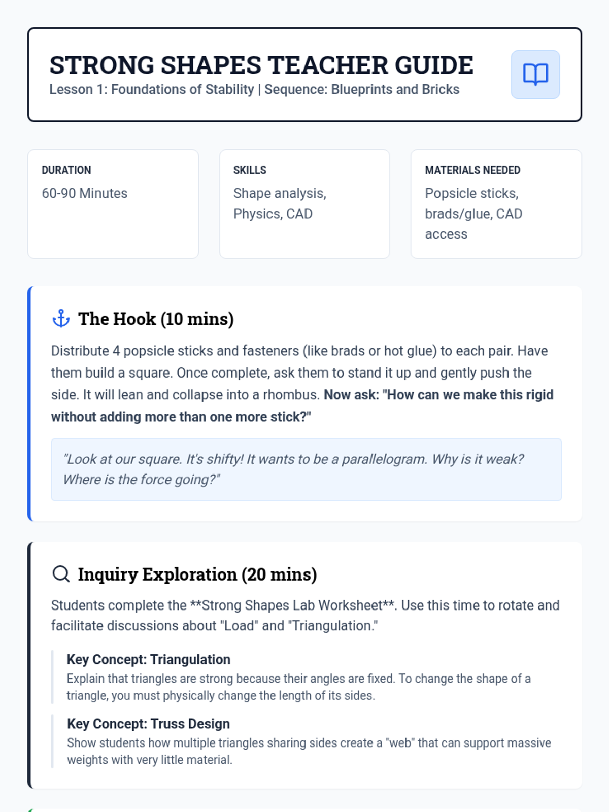 A 5th-grade engineering sequence where students apply CAD skills to architectural design, exploring structural stability, human scale, and the physics of 3D printing. Students move from basic shape analysis to designing a full-scale digital architectural model.