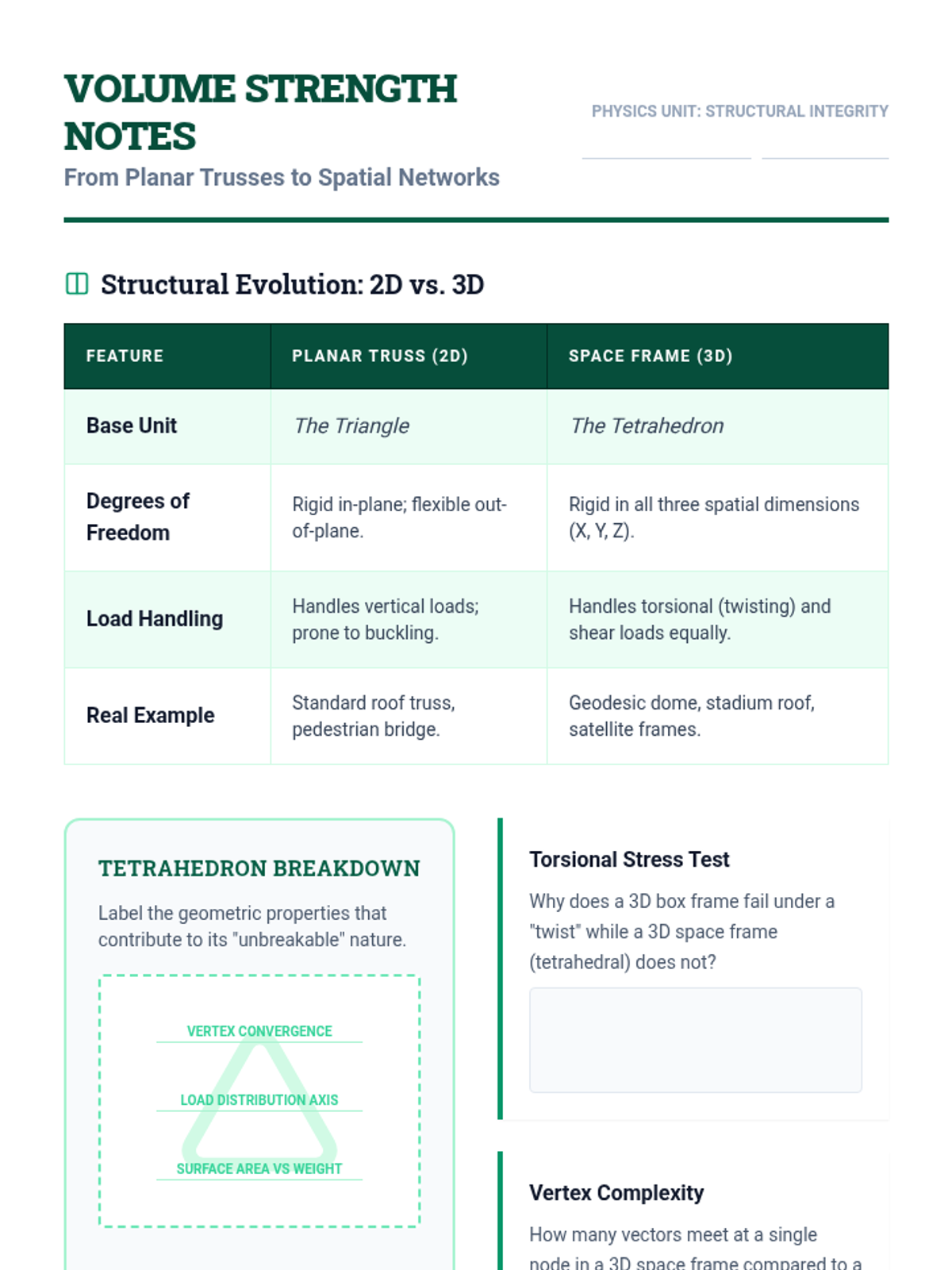A comprehensive 11th-grade physics and engineering unit exploring how geometric properties like polygon rigidity and 3D spatial relationships dictate the structural integrity of trusses, space frames, and architectural designs. Students progress from 2D vector analysis to building and testing optimized 3D structures.