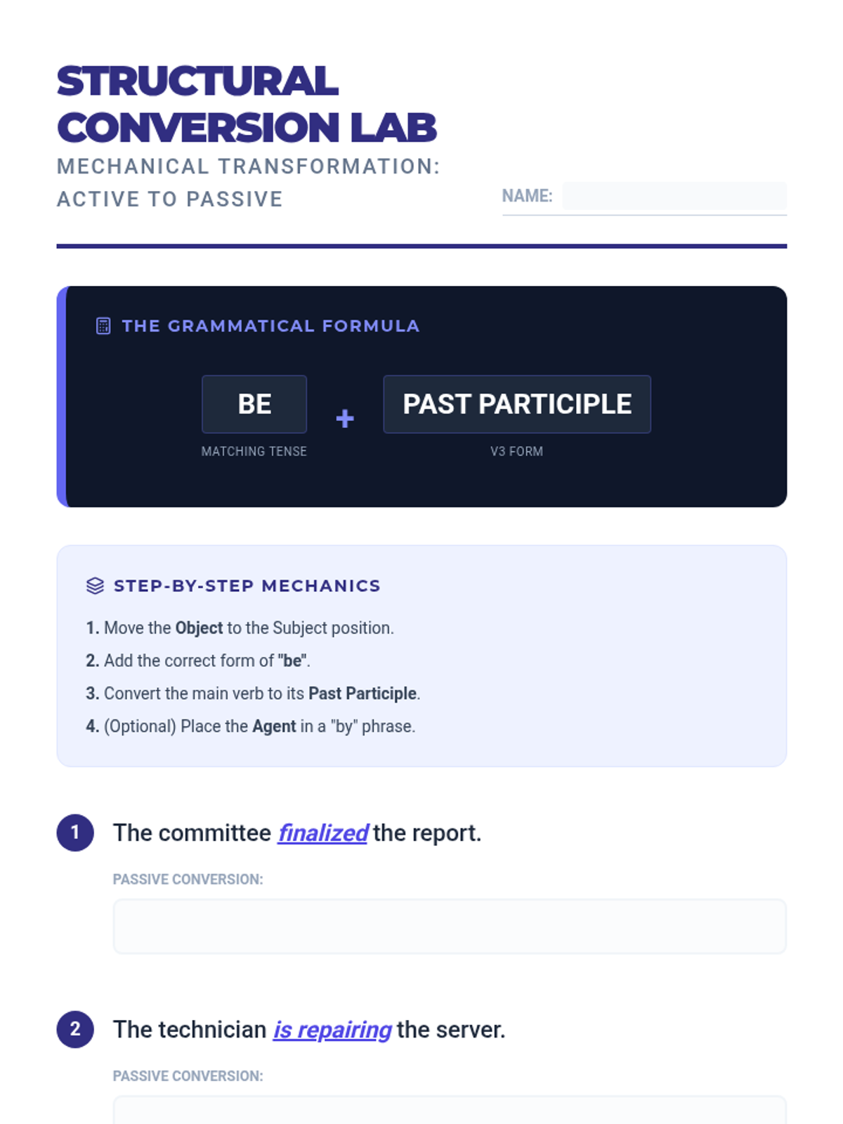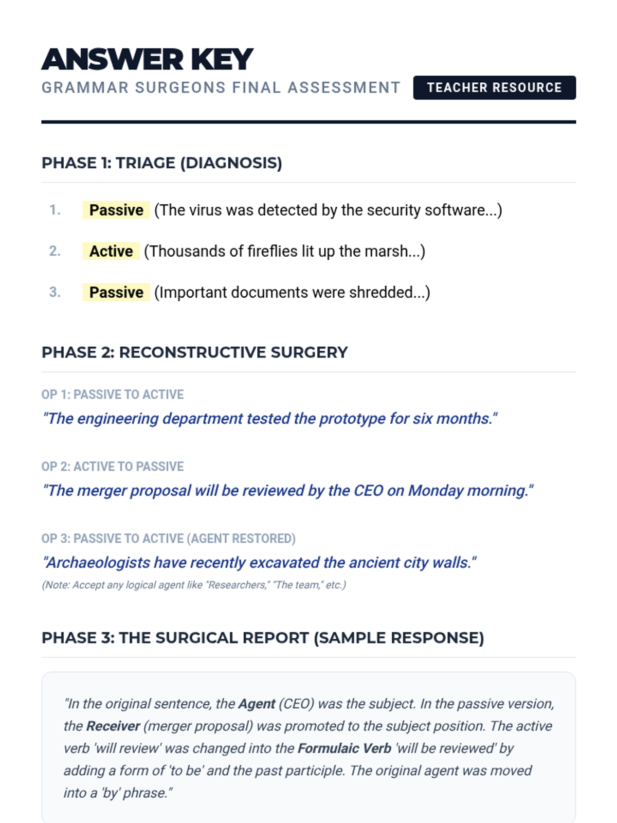 This sequence treats sentence structure as a foundational skill, focusing on the grammatical mechanics of active and passive voice. Students move from deconstructing sentence anatomy to mastering complex syntactic transformations and editing for conciseness.