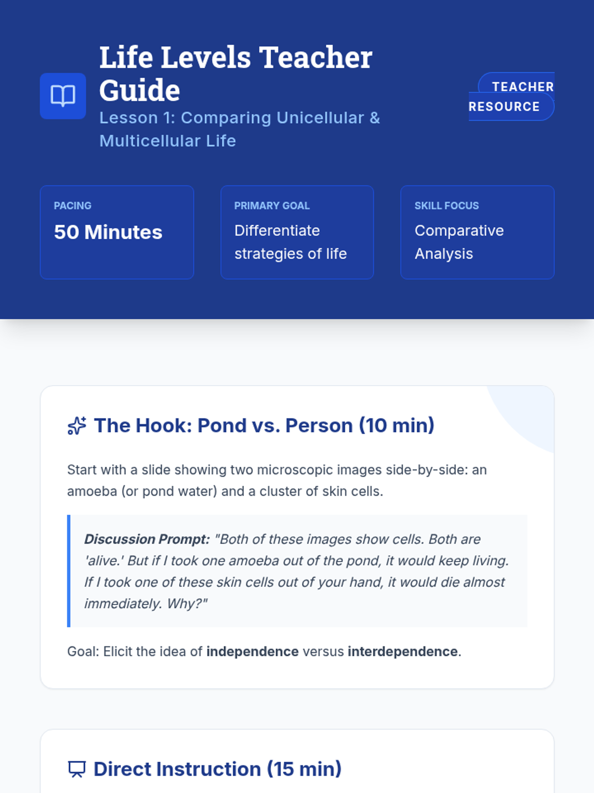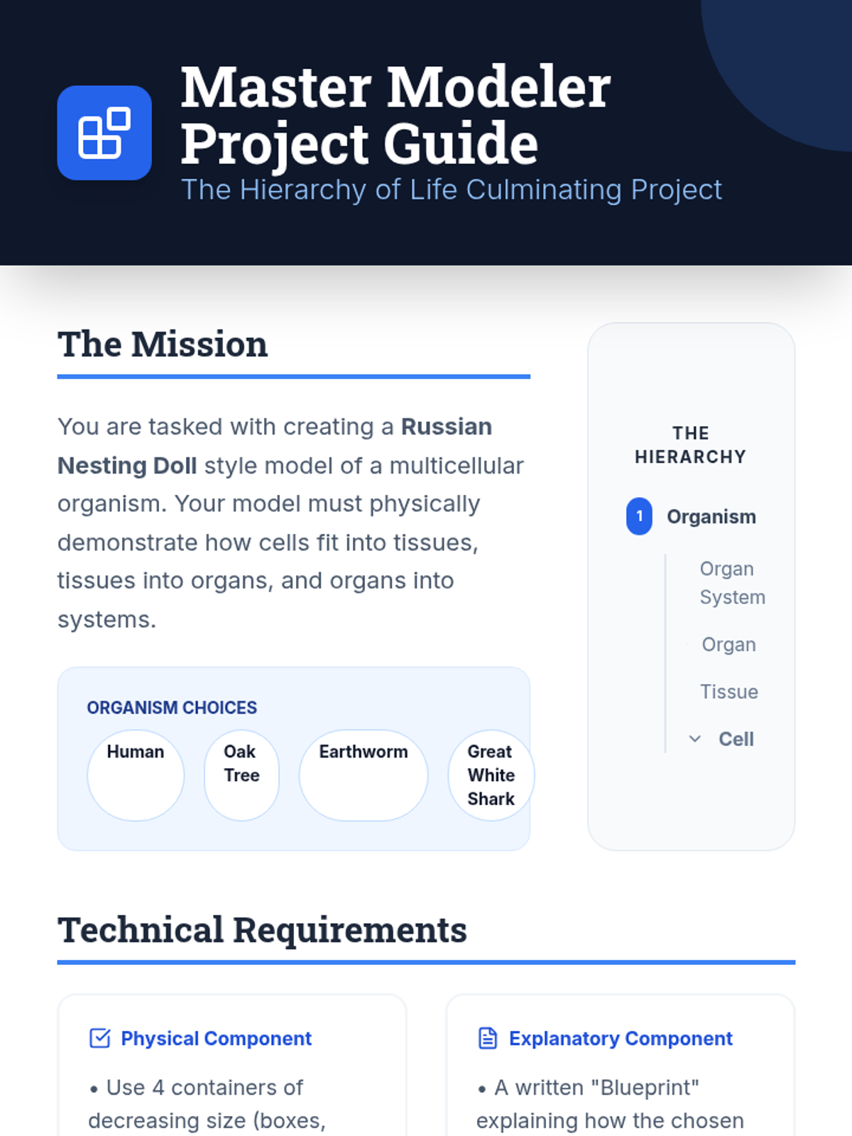 A comprehensive 7th-grade biology sequence exploring the hierarchical organization of multicellular organisms, from cells to tissues, organs, and systems. Students engage in comparative analysis, modeling, and systems thinking to understand how complexity enables advanced biological functions.