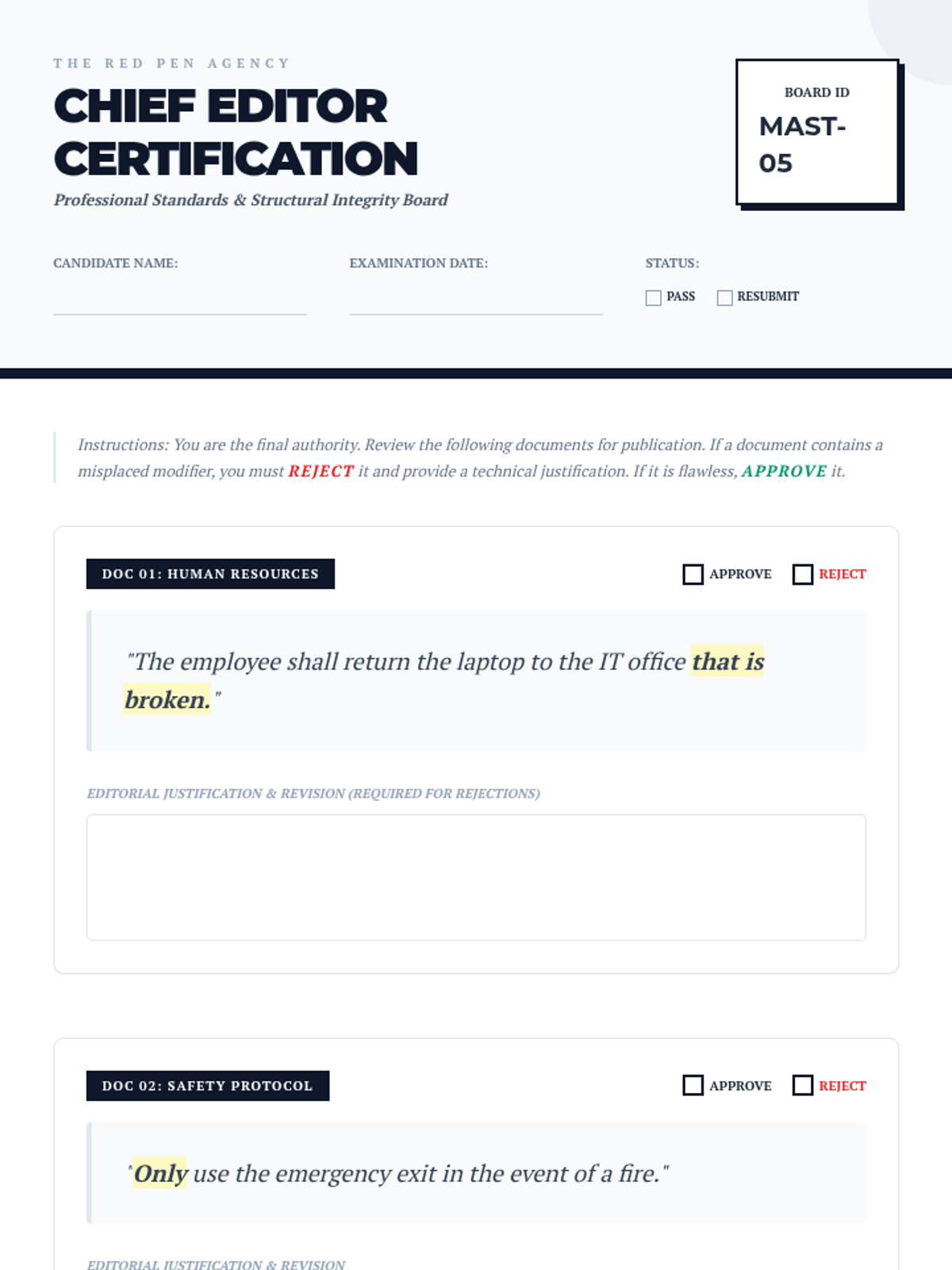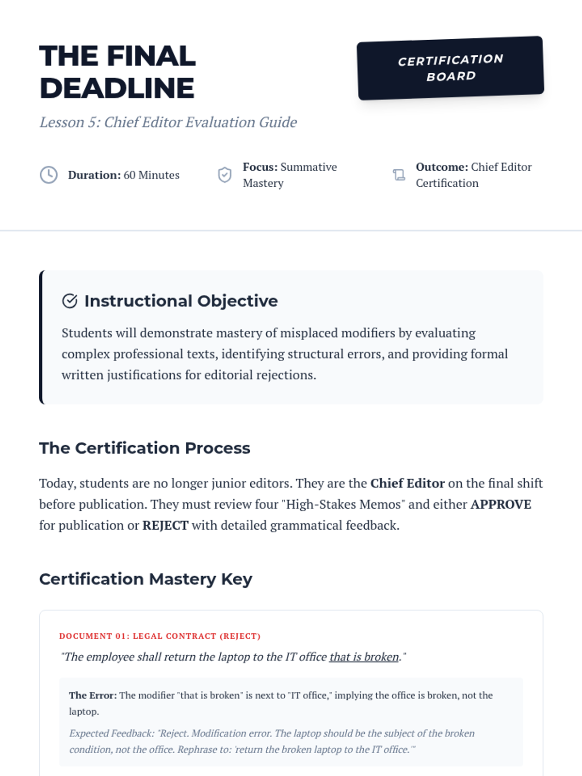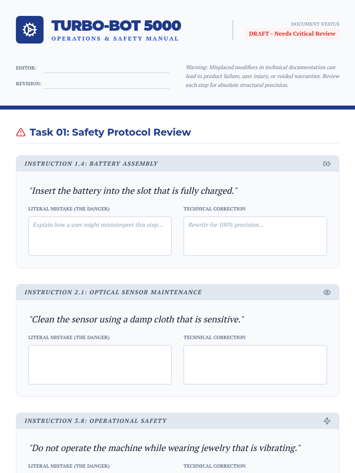 A high-stakes grammar sequence where students act as professional editors, mastering misplaced modifiers to ensure credibility and clarity in legal, technical, and journalistic contexts. Students analyze real-world impacts of ambiguous language and learn to communicate with professional precision.