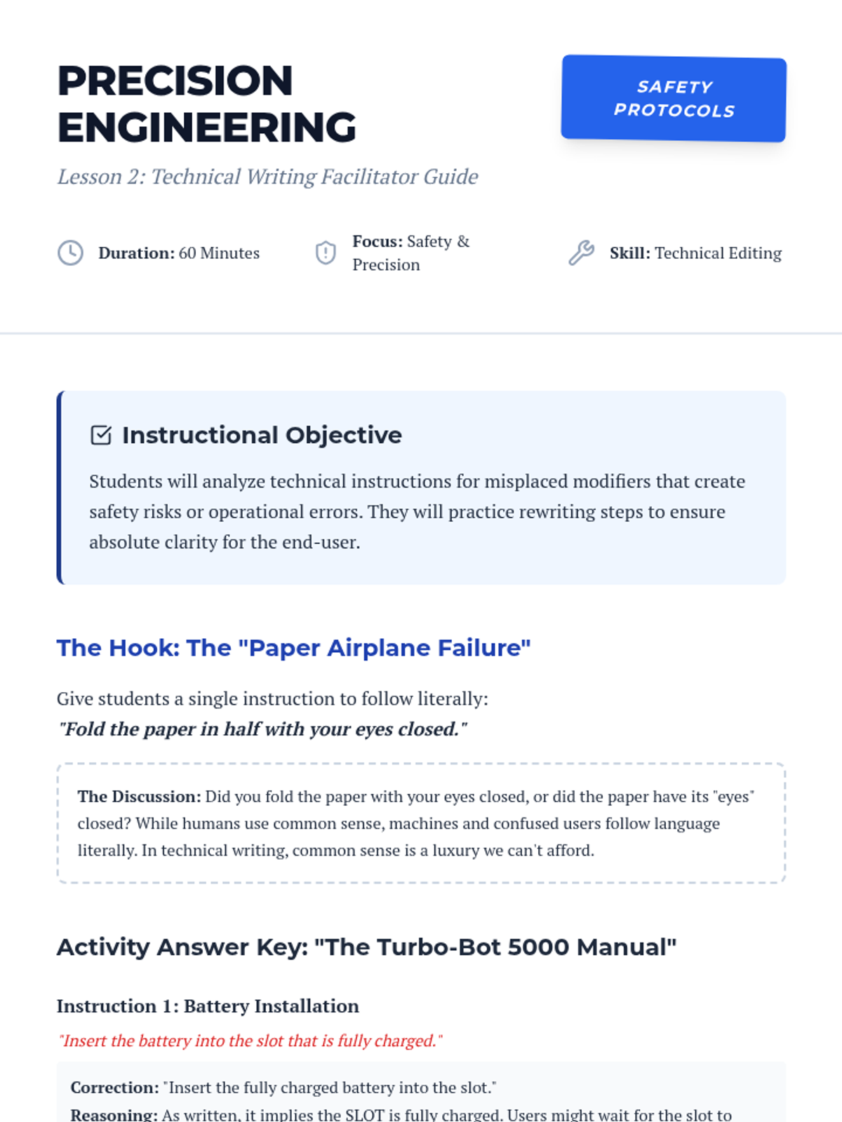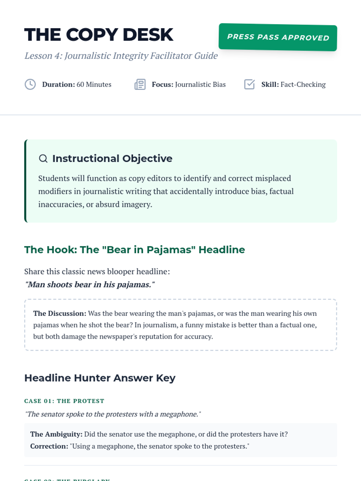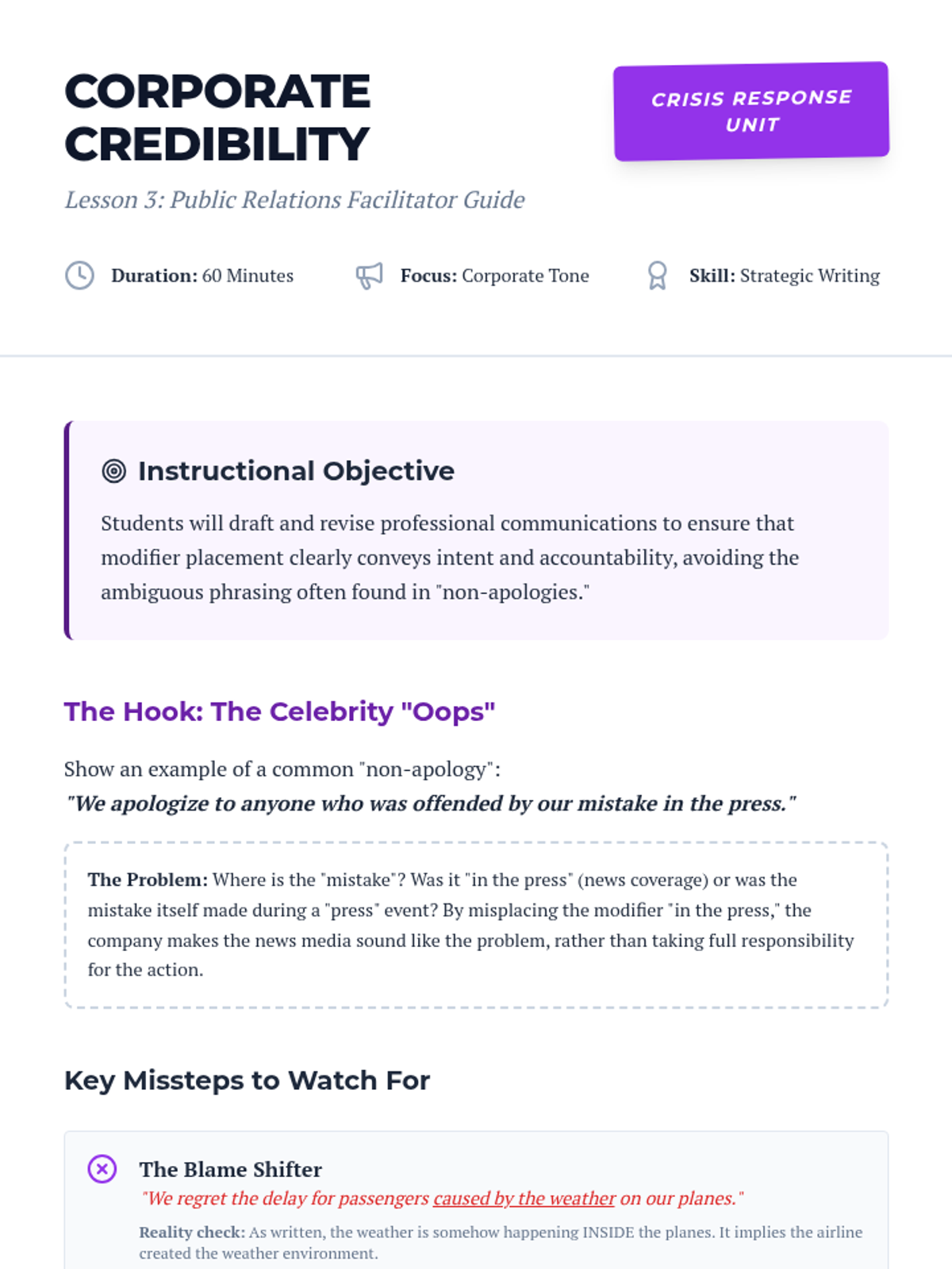 A high-stakes grammar sequence where students act as professional editors, mastering misplaced modifiers to ensure credibility and clarity in legal, technical, and journalistic contexts. Students analyze real-world impacts of ambiguous language and learn to communicate with professional precision.