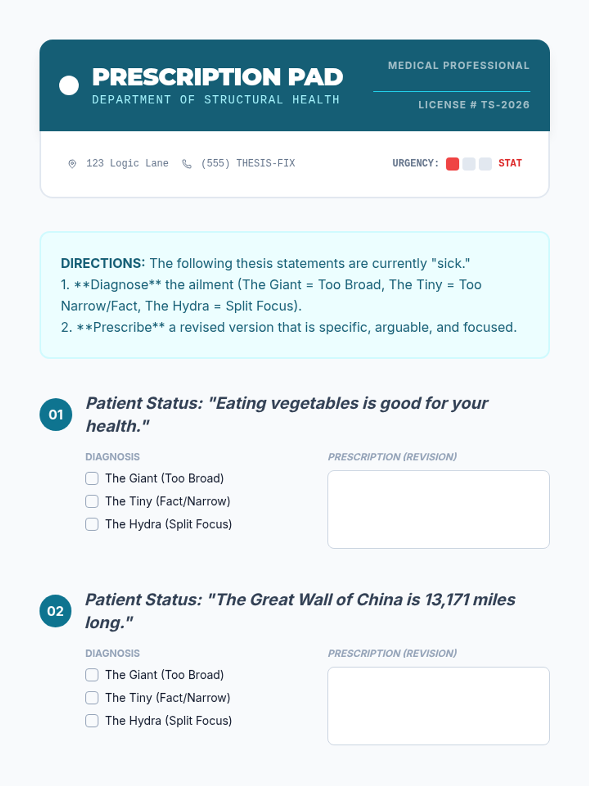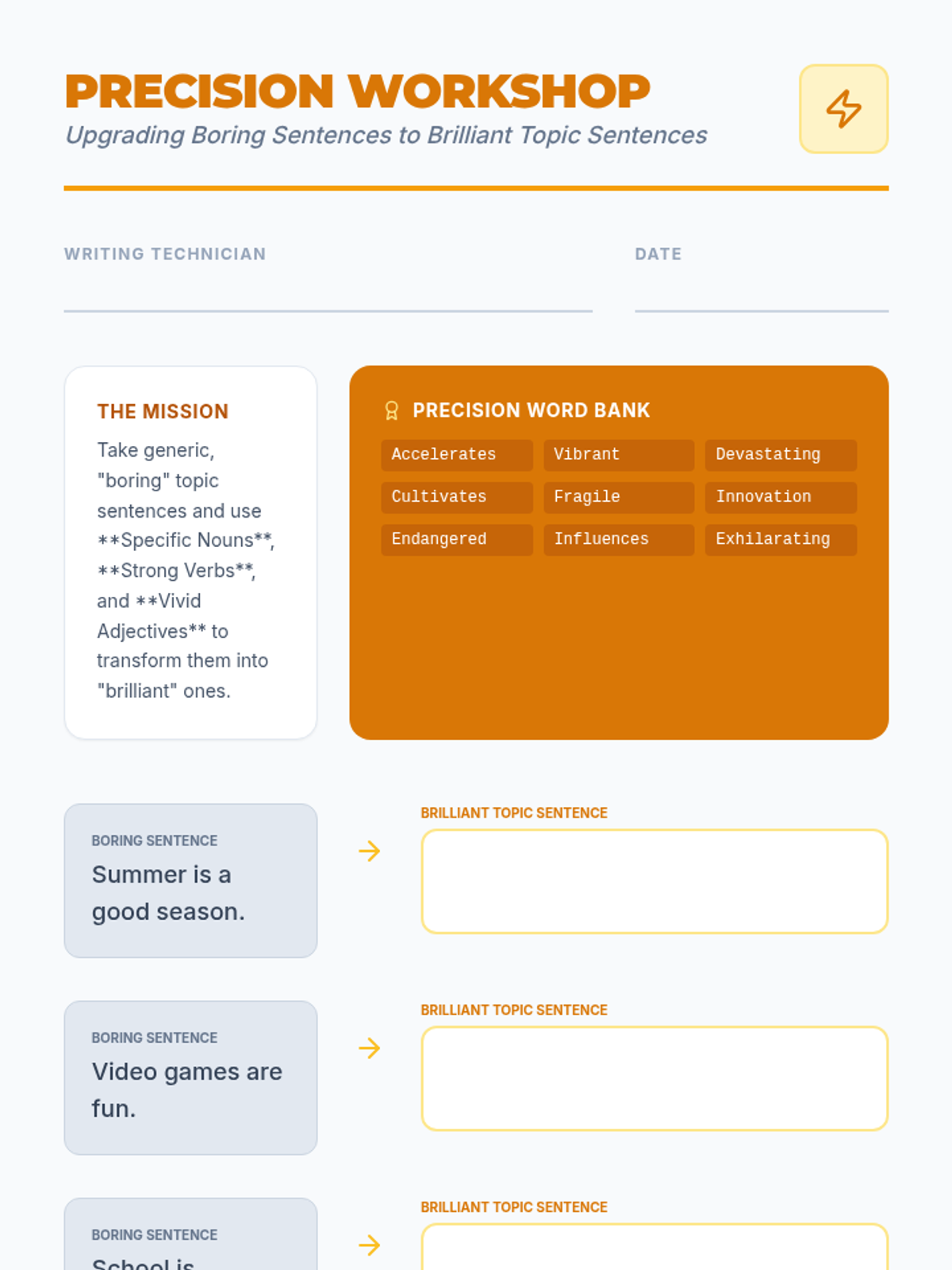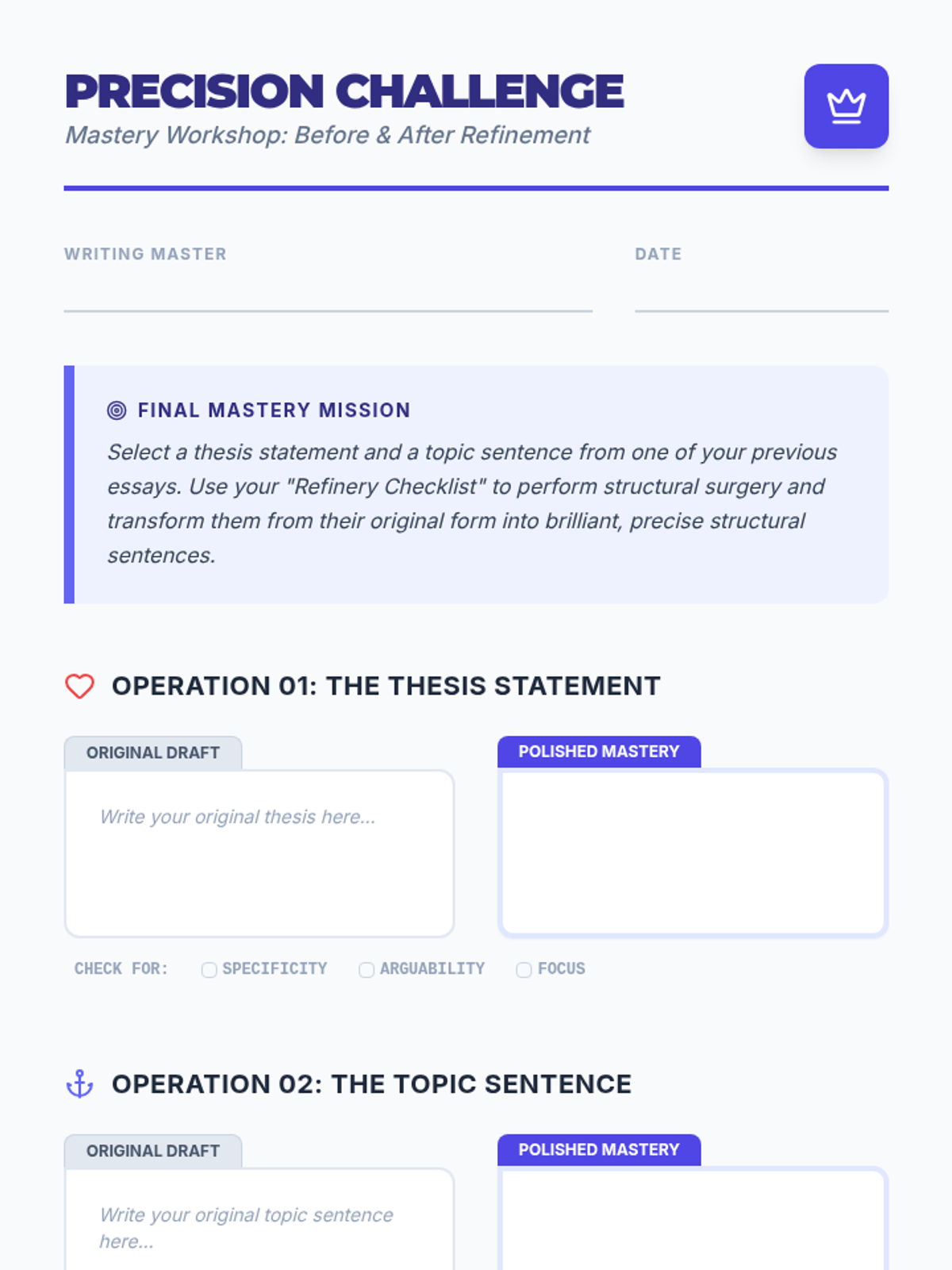 A game-based sequence focused on refining topic sentences and thesis statements to prevent logic 'drift' and enhance precision through diagnostic activities and vocabulary upgrades.