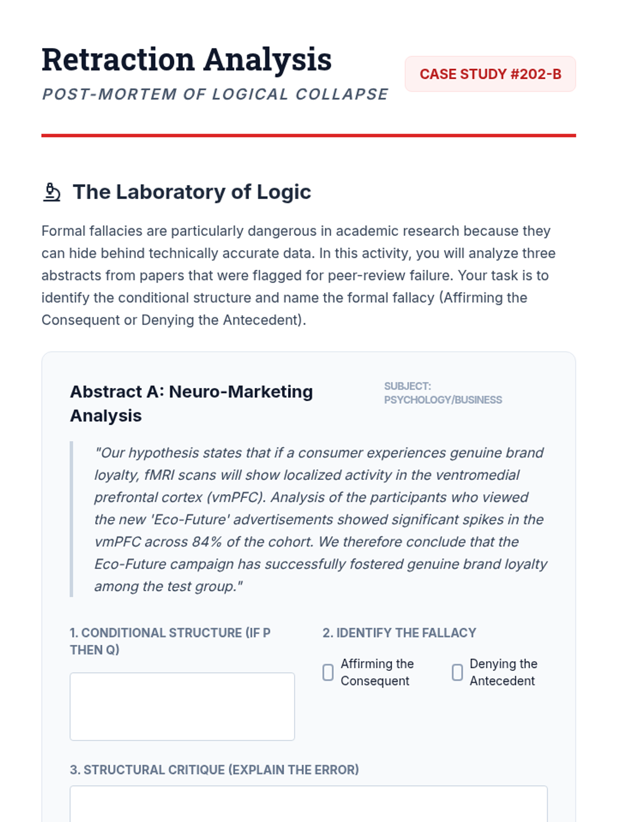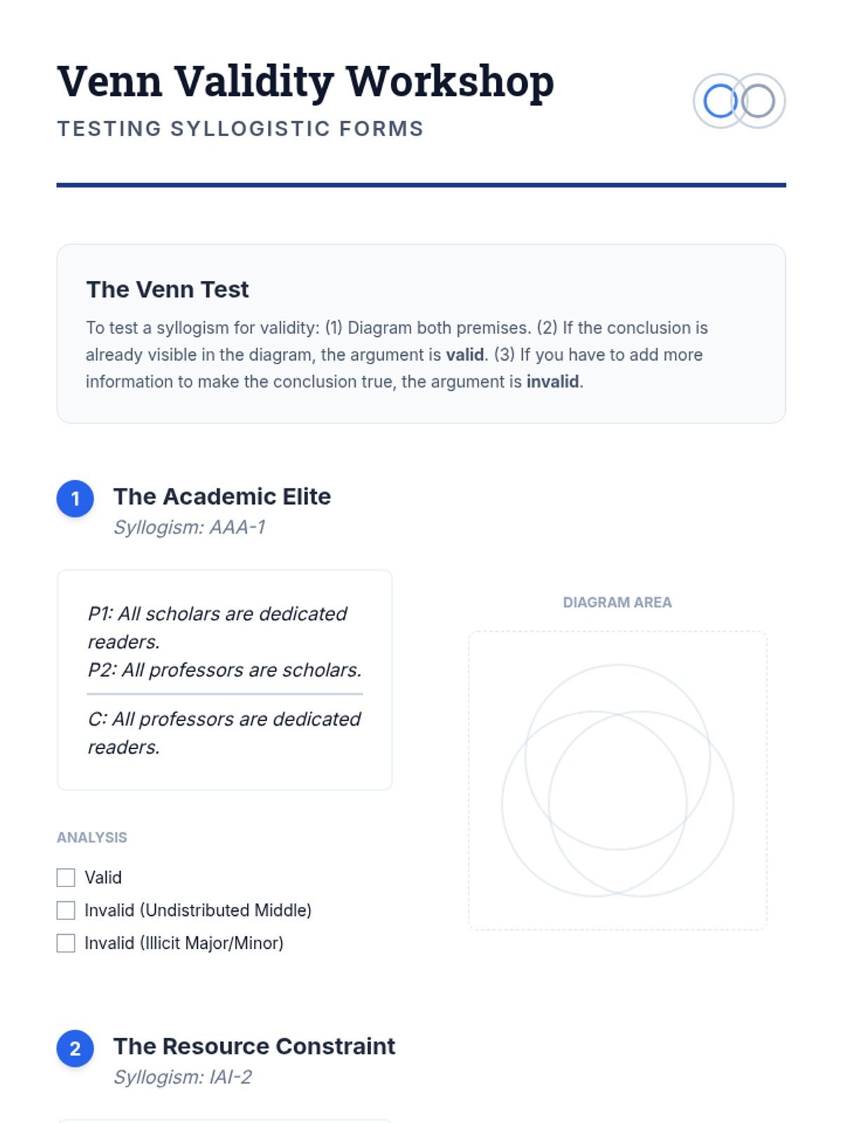 This graduate-level sequence focuses on the rigorous deconstruction of arguments through formal logic. Students move beyond informal fallacies to analyze structural validity, propositional logic, syllogistic forms, and modal scope, culminating in symbolic proofs of their own research arguments.