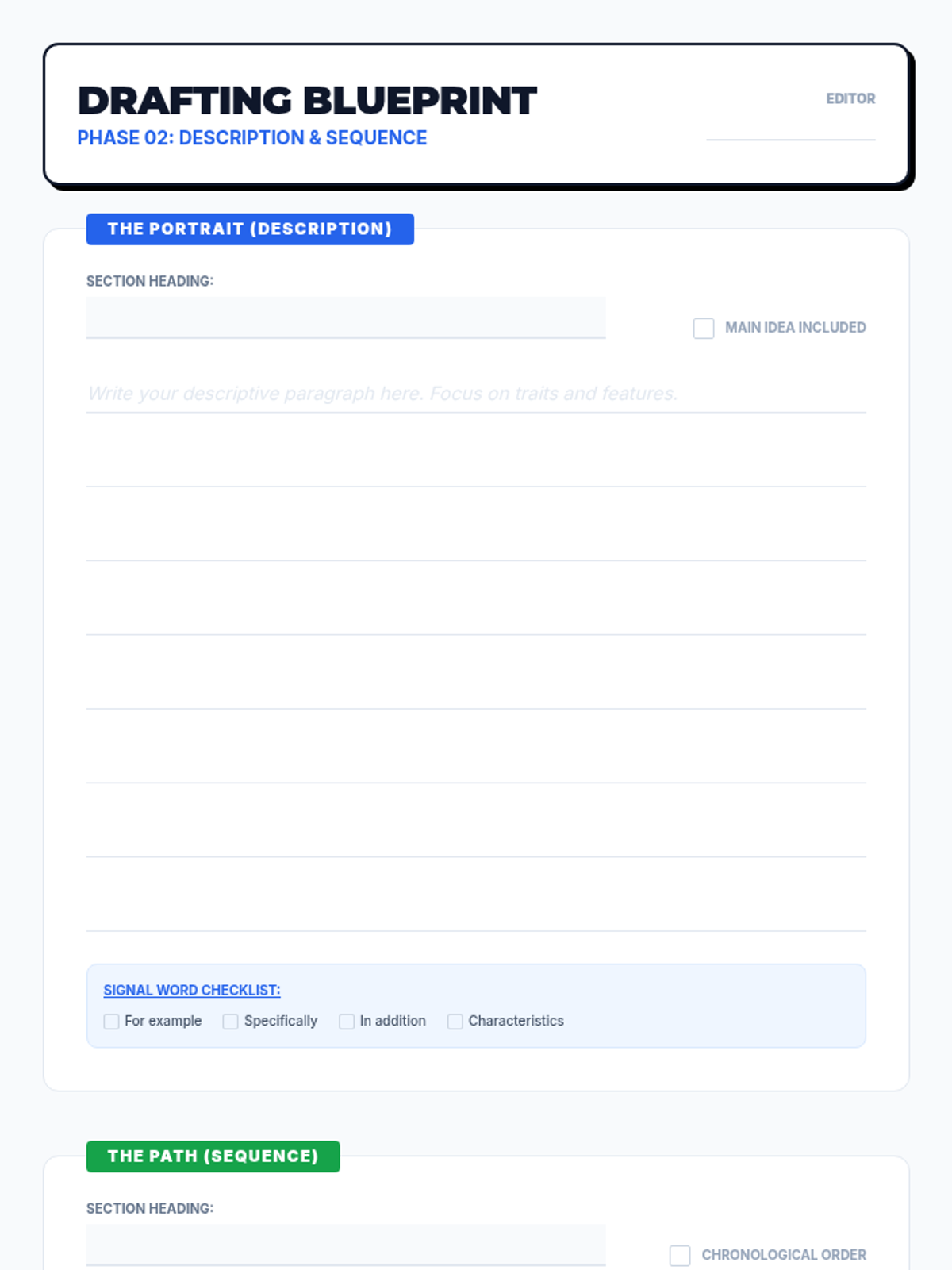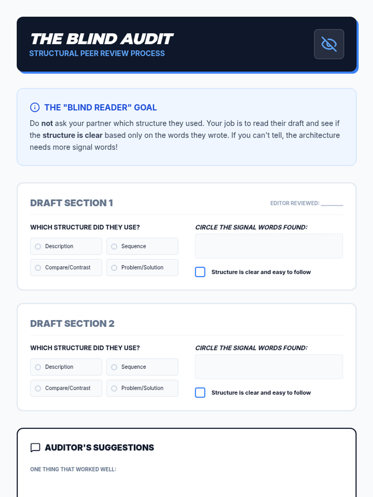 Students act as 'Content Editors' to synthesize raw facts into structured nonfiction texts. They master five organizational patterns (Description, Sequence, Compare/Contrast, and Problem/Solution) to create a collaborative class anthology.
