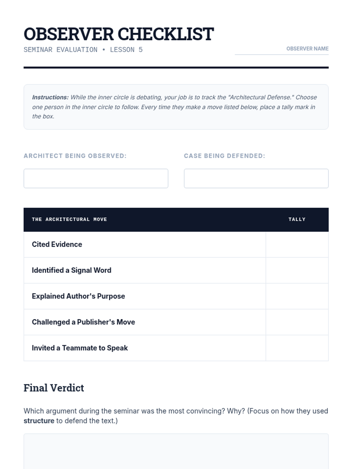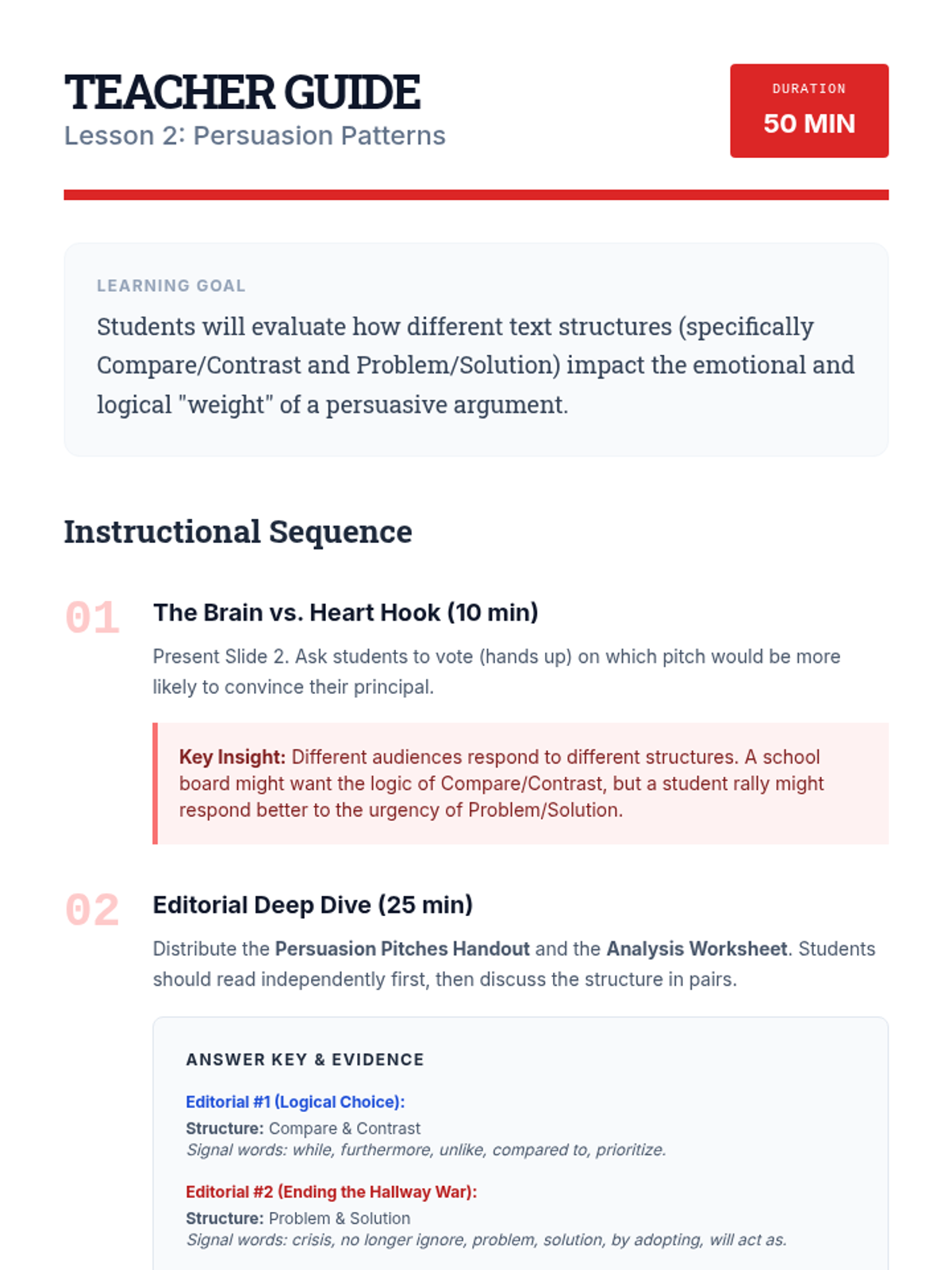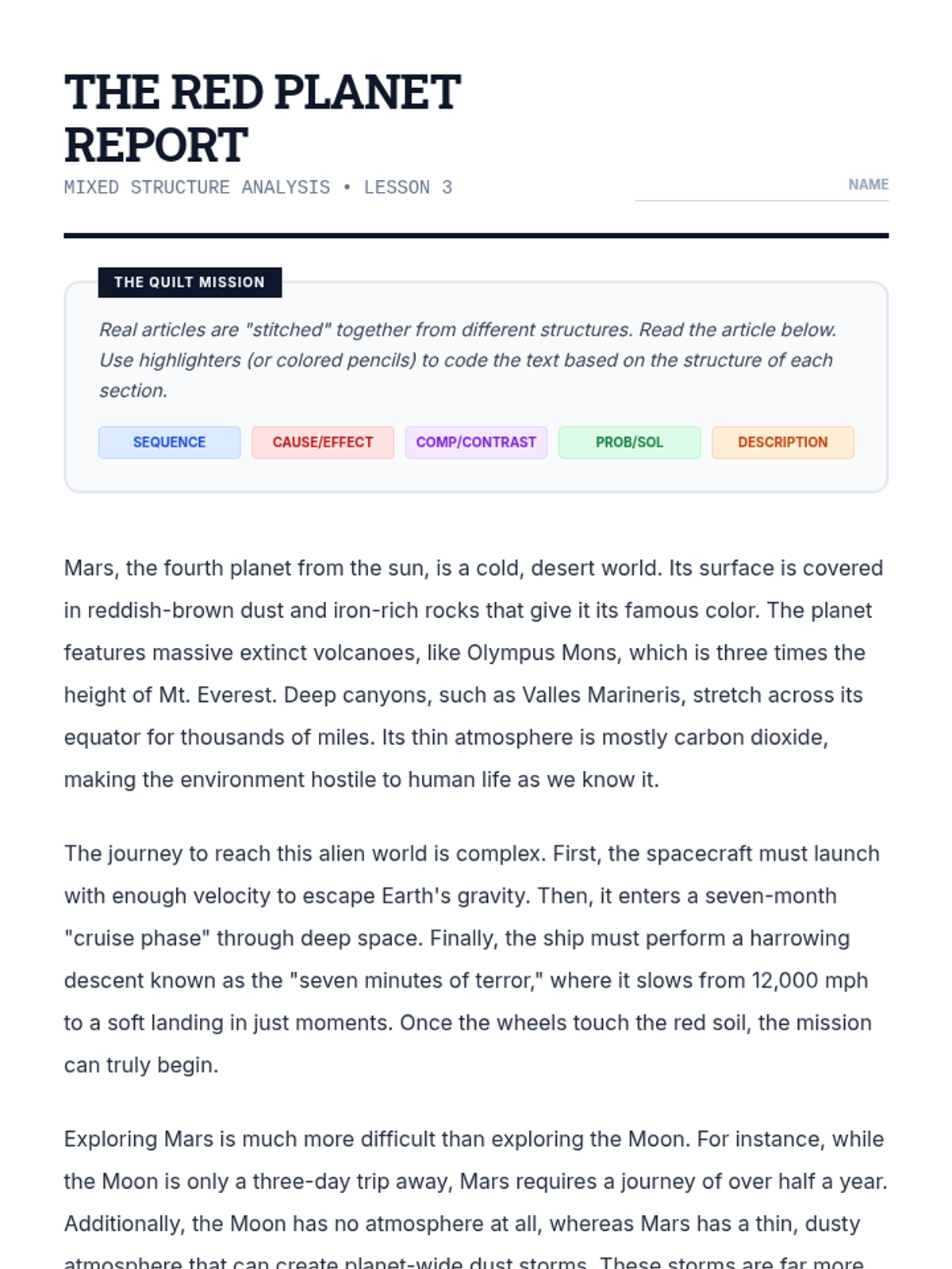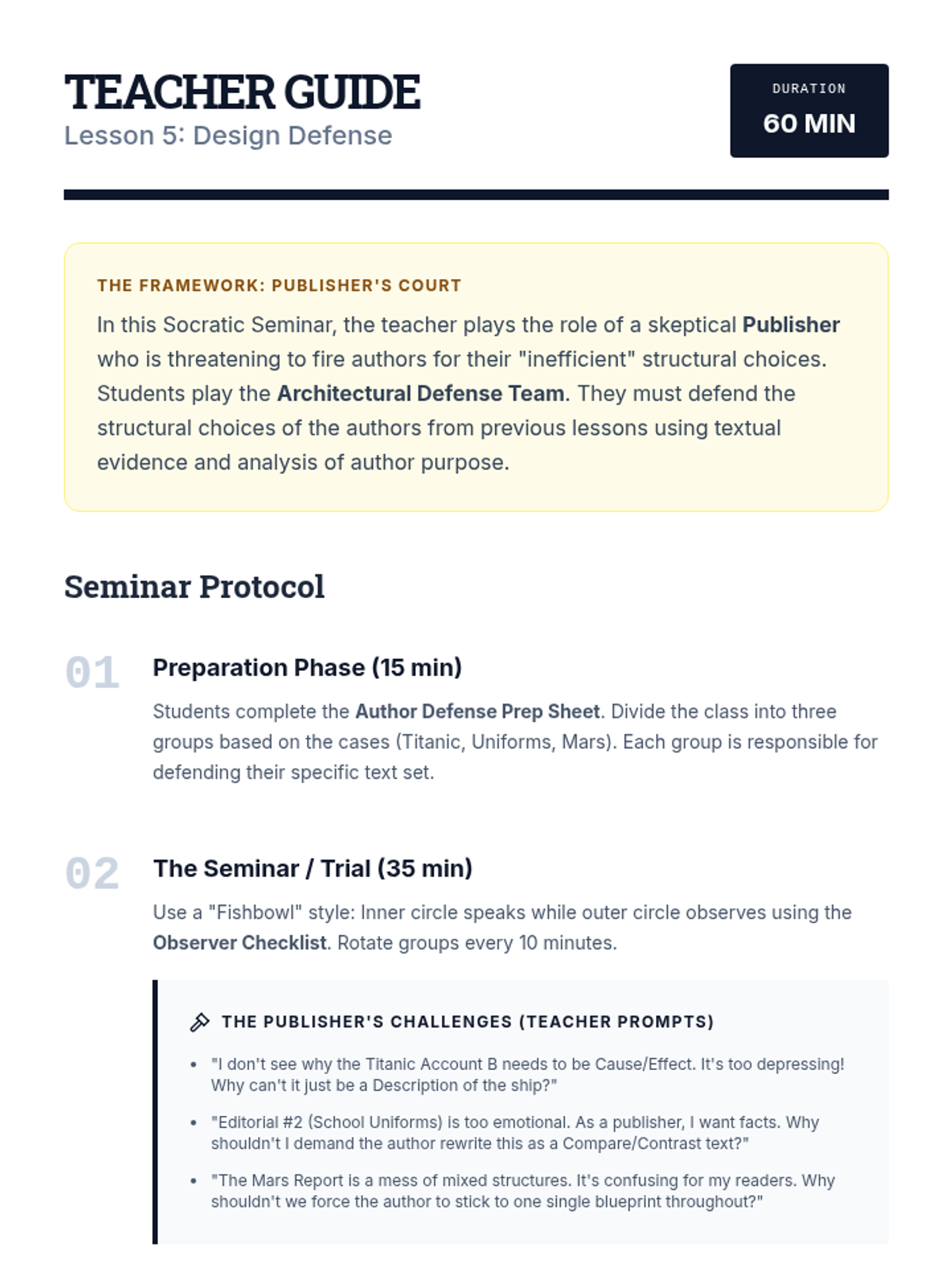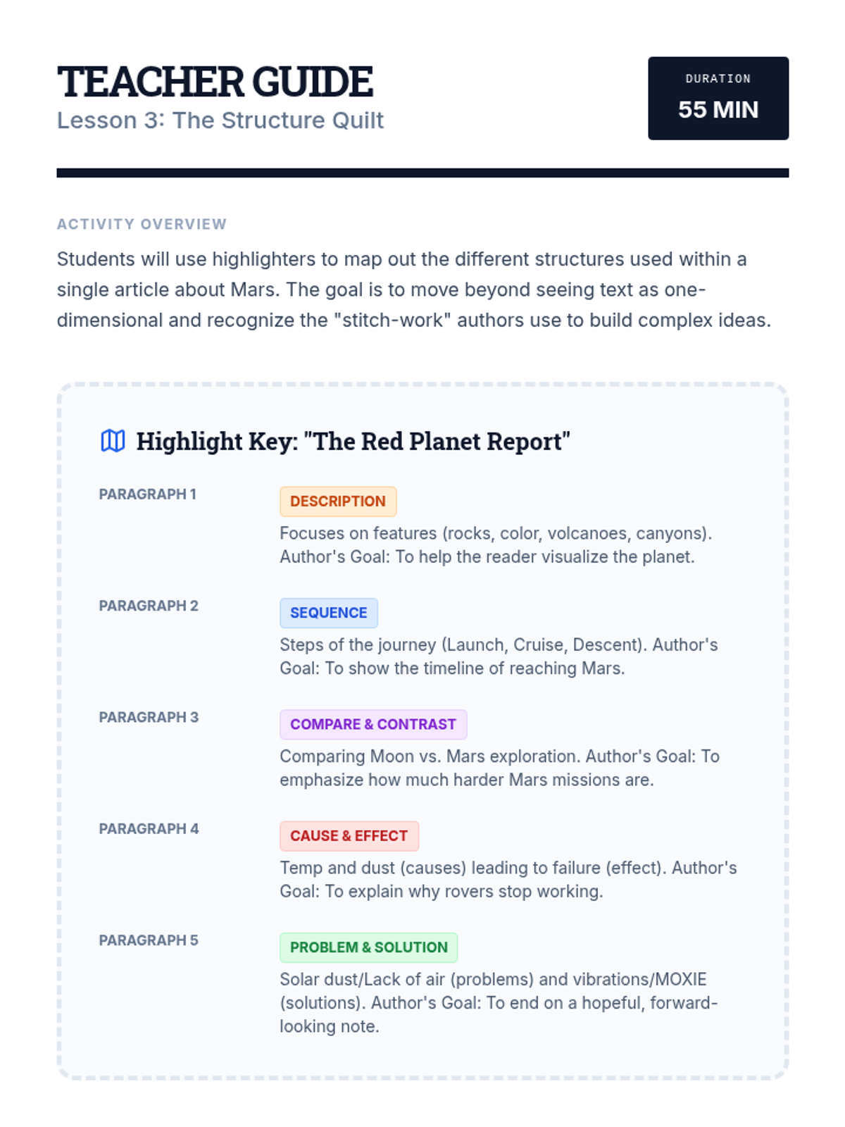 A comprehensive 6th-grade ELA unit exploring how authors use text structure (sequence, cause/effect, compare/contrast, problem/solution, description) as a deliberate craft choice to shape reader perspective and emphasize specific information. Students analyze text sets, evaluate persuasive impact, deconstruct mixed structures, and rewrite segments to observe shifts in meaning.
