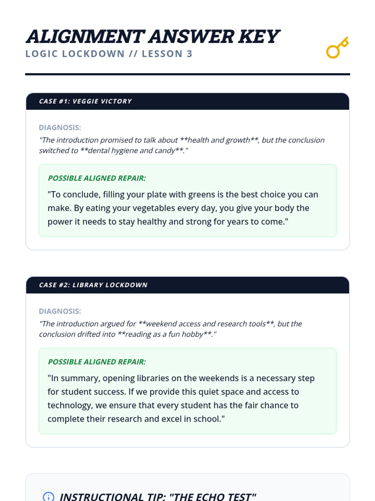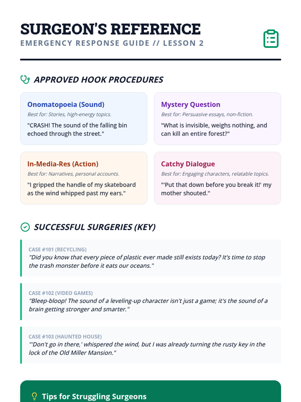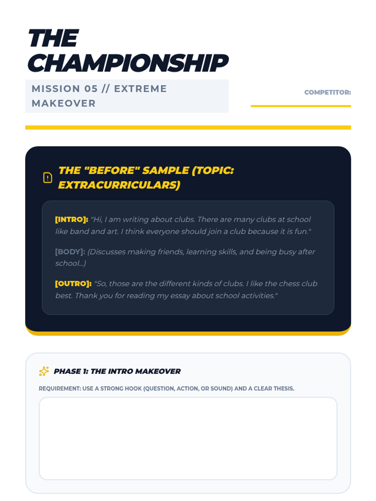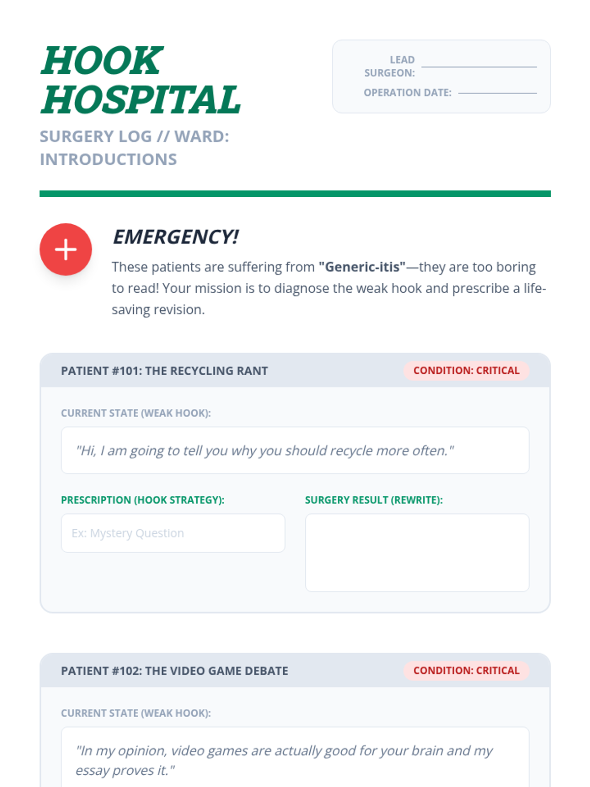 A game-based sequence where students act as members of the 'Structure Squad' to diagnose and repair essay introductions and conclusions through puzzles, 'surgery', and detective work.