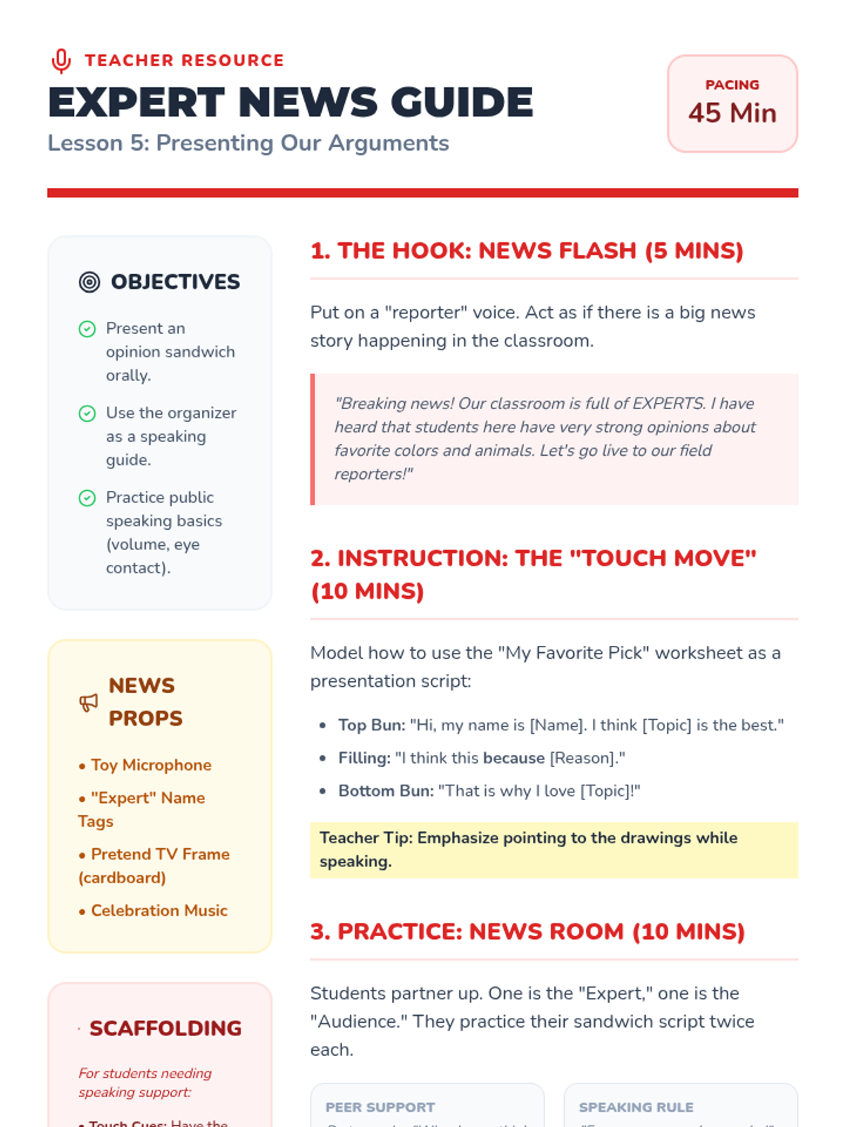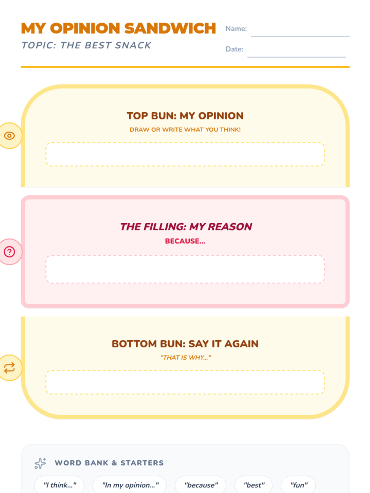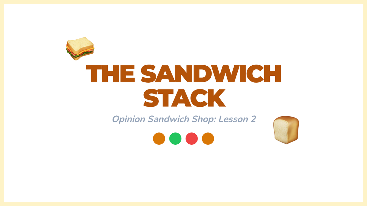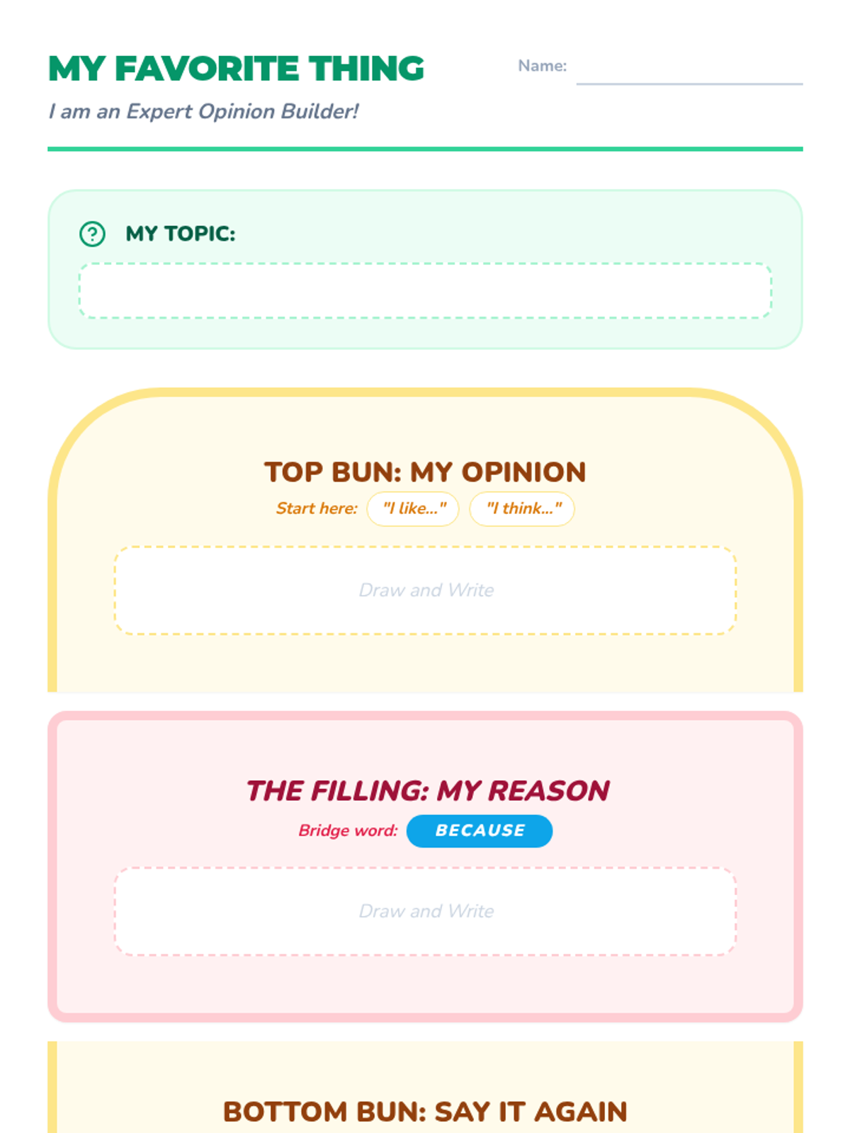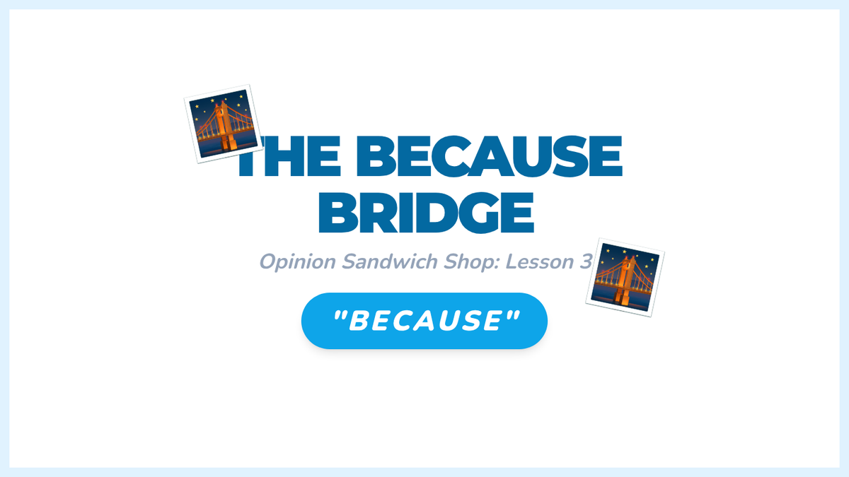 A Kindergarten sequence focused on teaching the structure of opinion writing through a visual sandwich graphic organizer. Students learn to distinguish facts from opinions, use the word 'because' to link reasons, and present their preferences clearly.