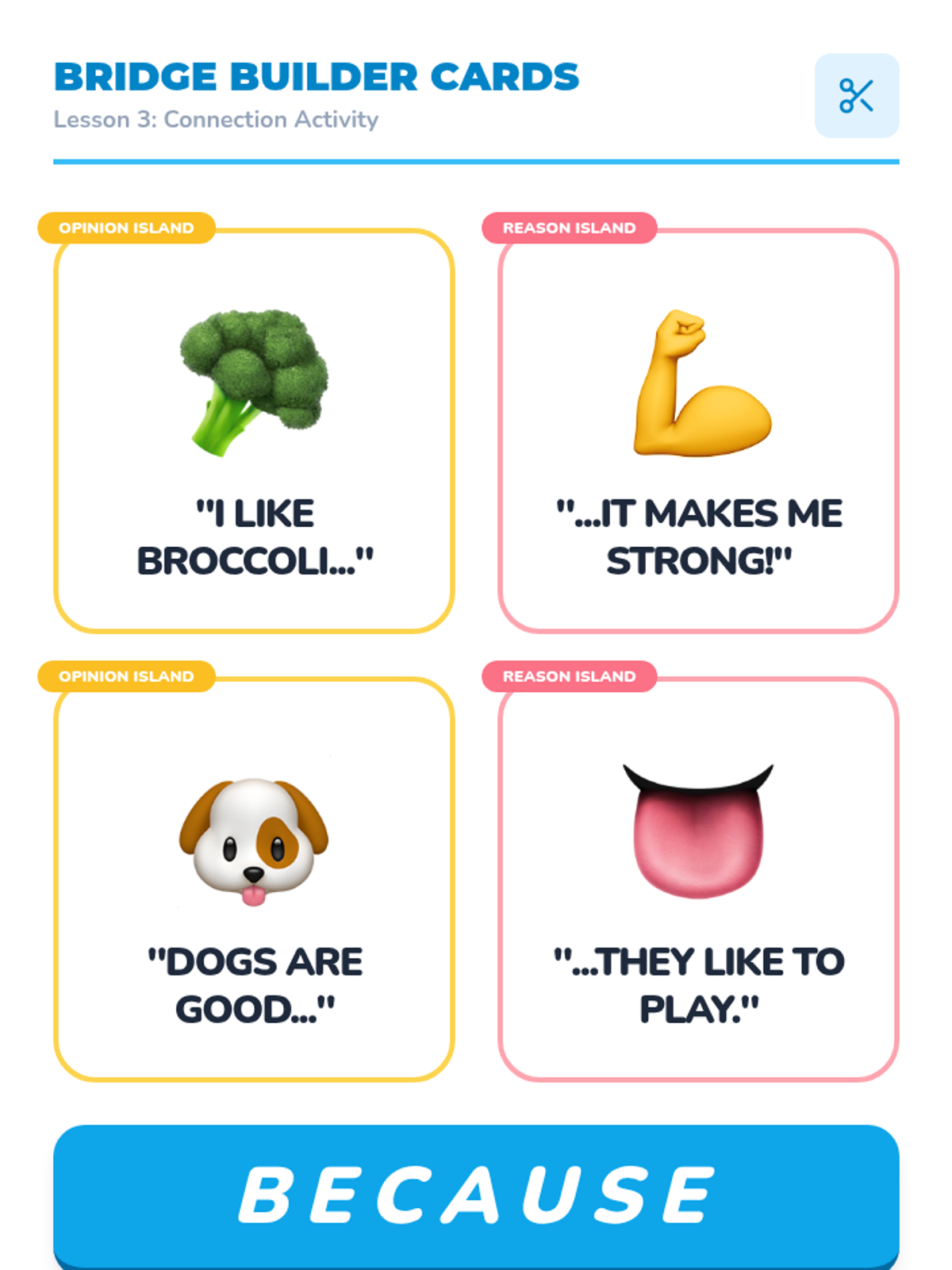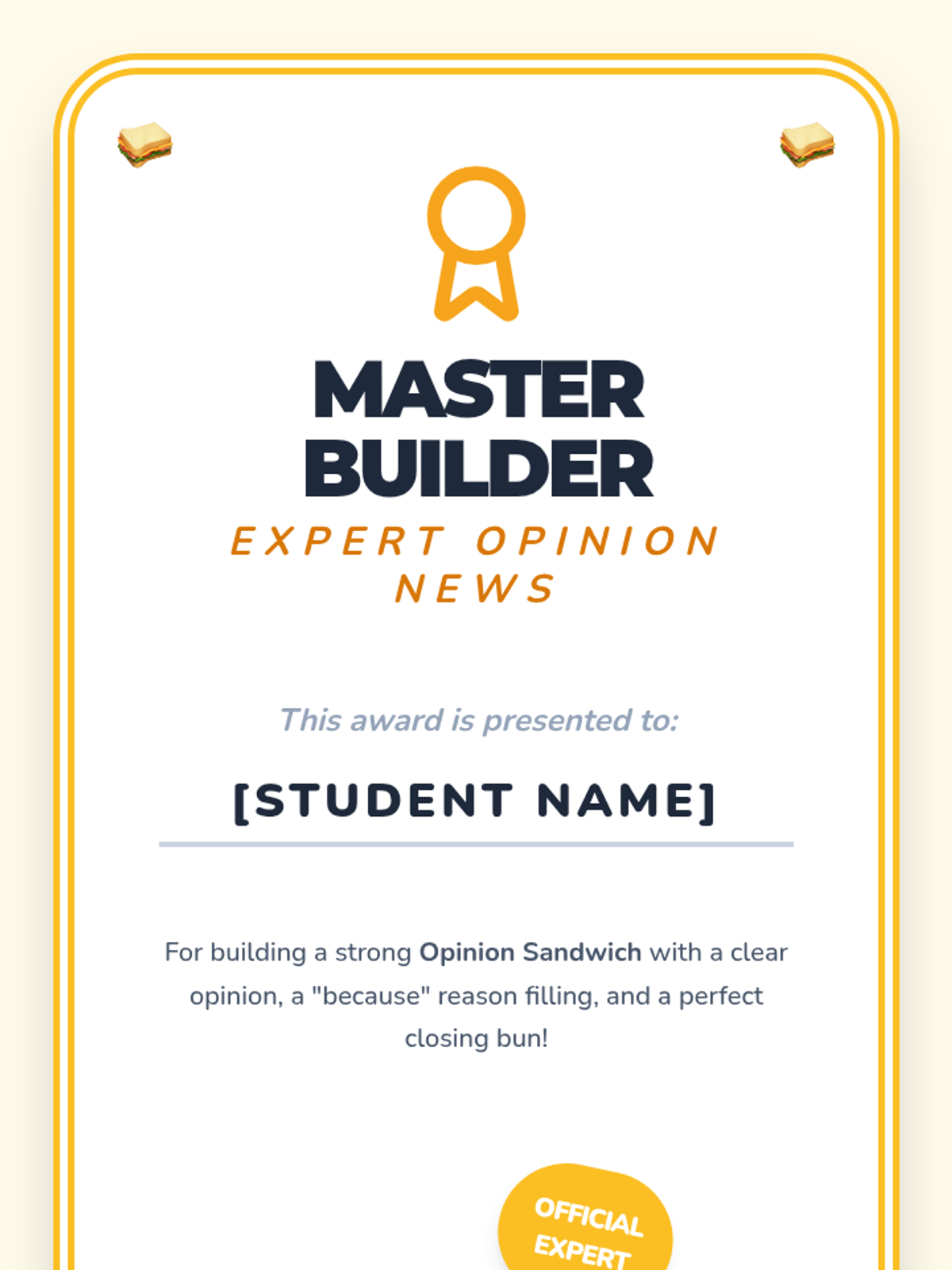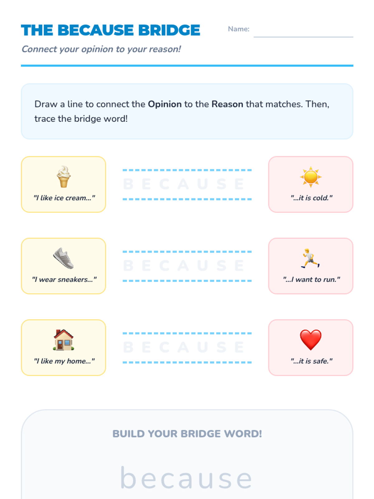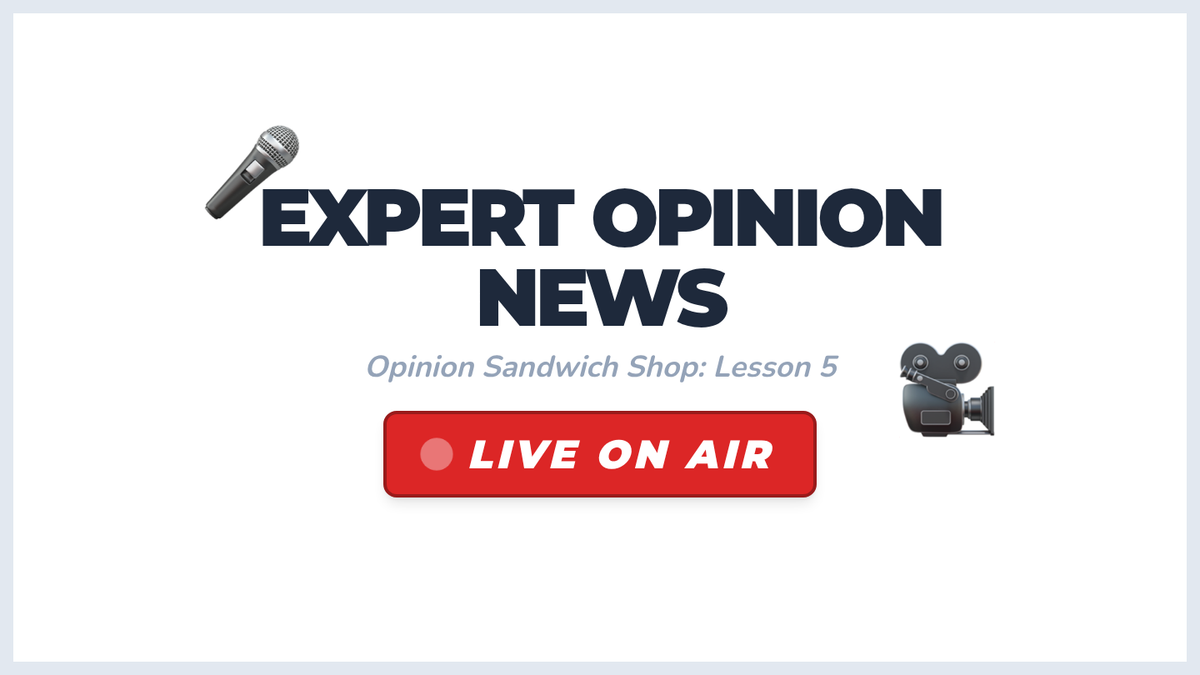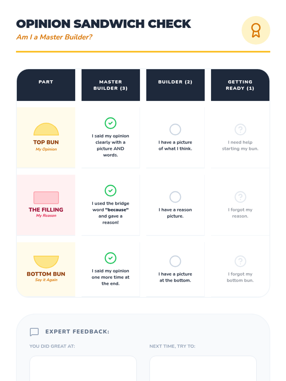 A Kindergarten sequence focused on teaching the structure of opinion writing through a visual sandwich graphic organizer. Students learn to distinguish facts from opinions, use the word 'because' to link reasons, and present their preferences clearly.